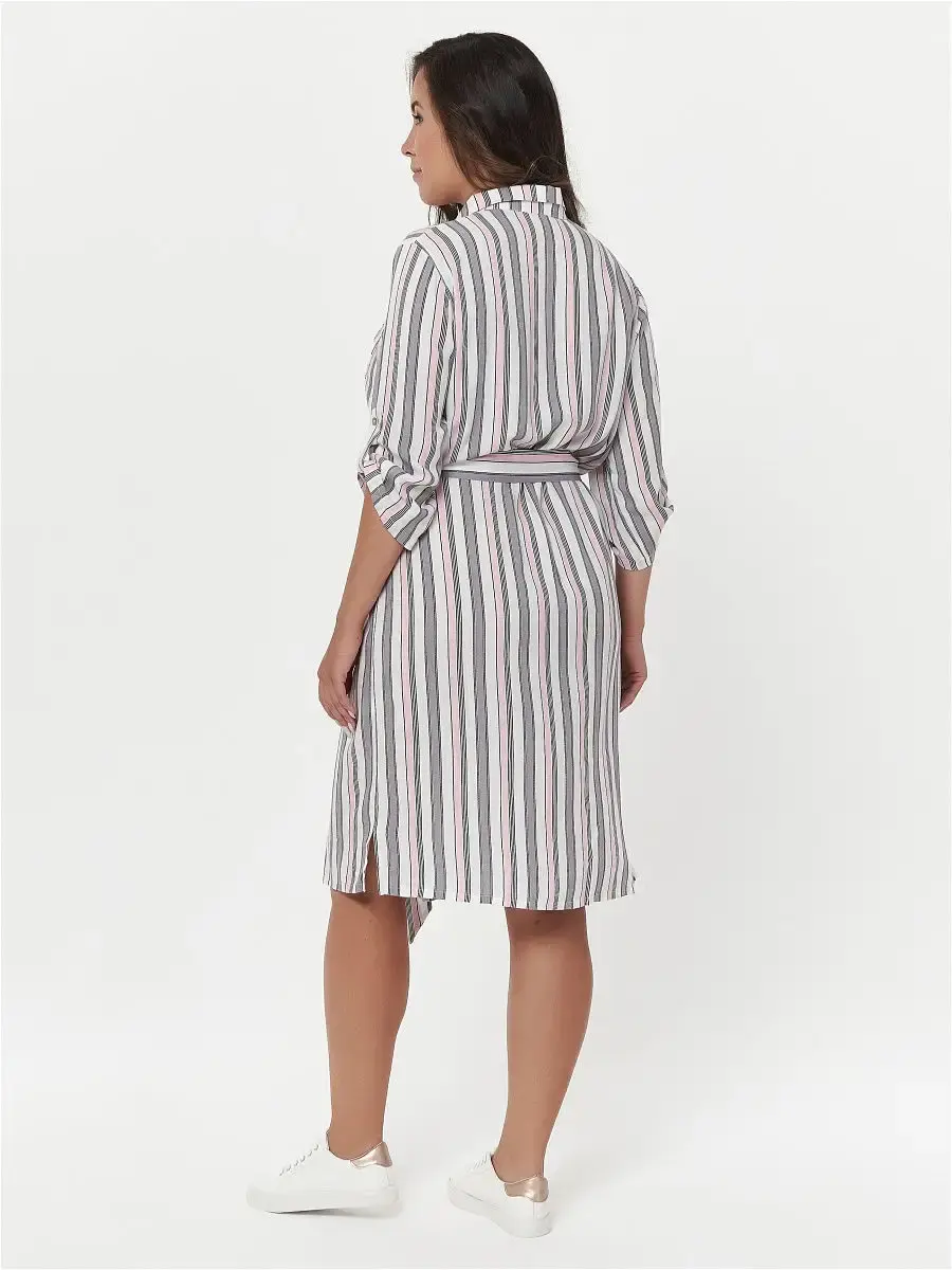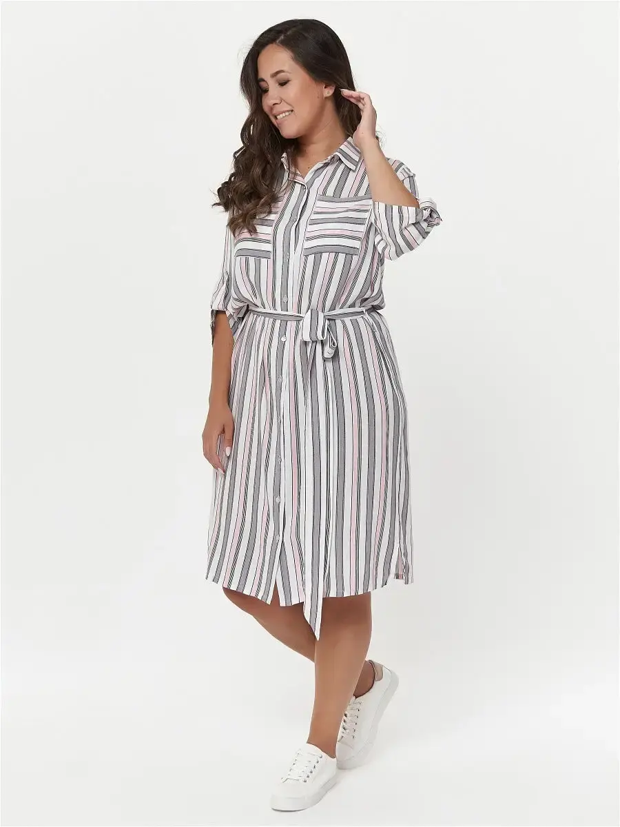 Эффектное легкое платье - рубашка длиной до колен из тонкой «дышащей» вискозы в неширокую вертикальную полоску. Модель с втачными широкими рукавами длиной 3/4 со спущенной проймой; классическим рубашечным воротником и пуговичной застежкой на открытой планке.