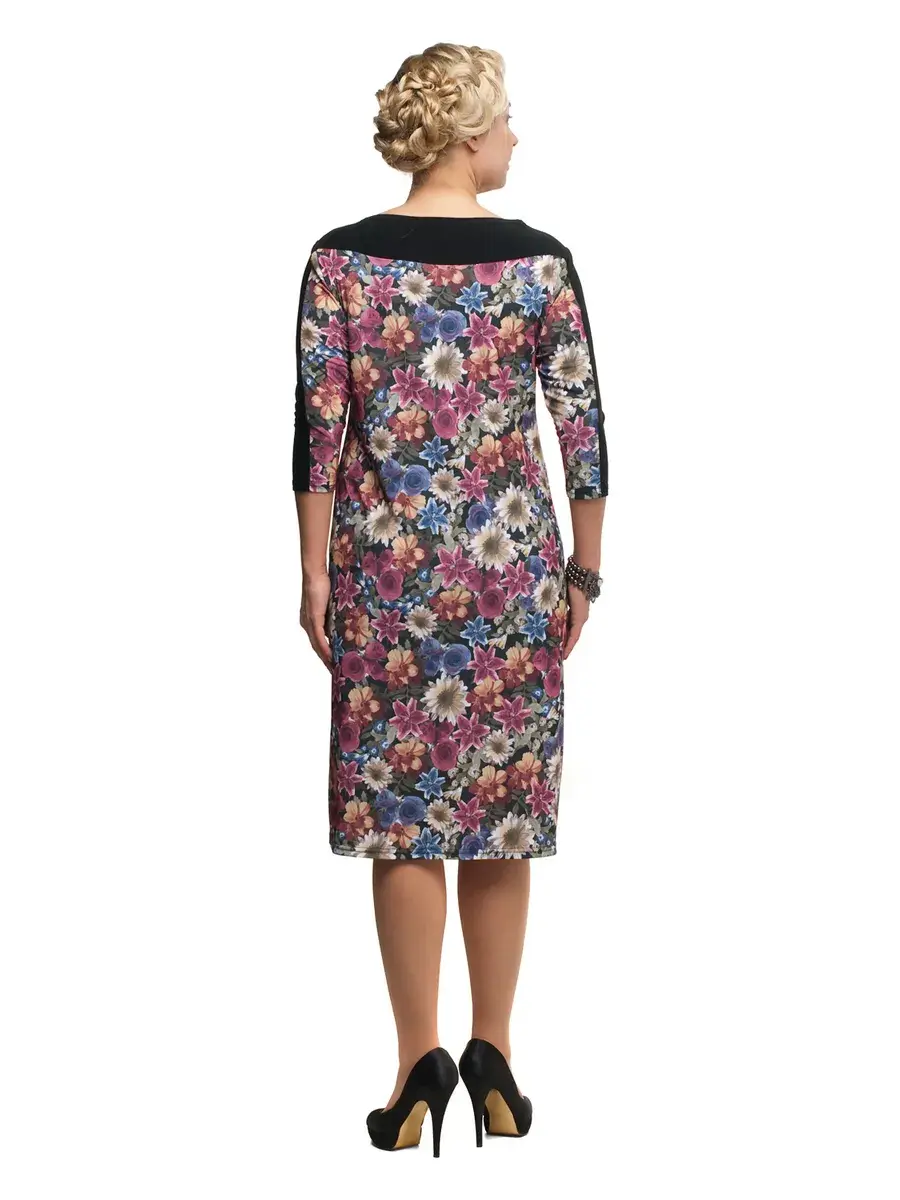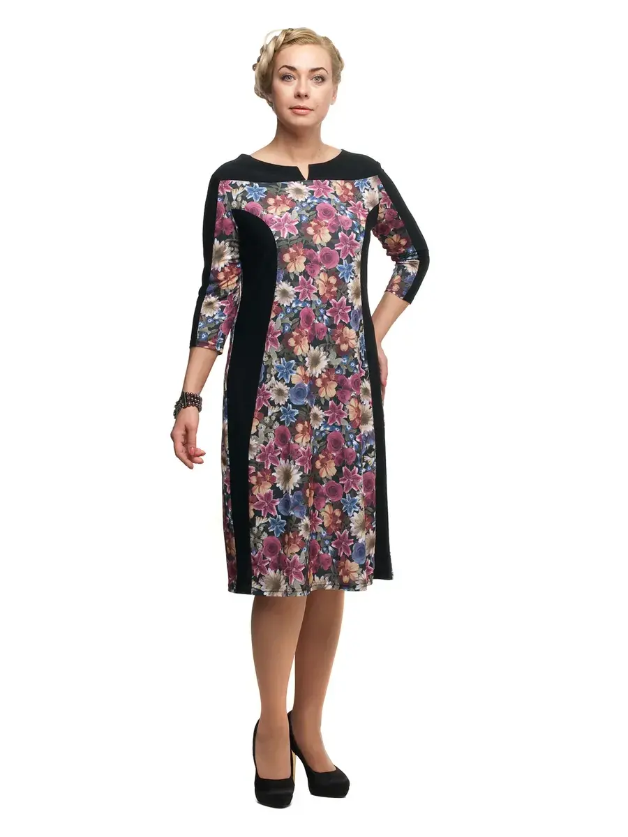 Удивительное стильное платье , длиной до середины колен, выполненное в комбинации однотонной ткани, и материала с плотным цветочным принтом. Модель полуприлегающего кроя, с втачными рукавами длиной 3/4; фигурным вырезом горловины лодочка. Прямая кокетка, вертикальные конструктивные вставки по бокам и верхним линиям изделия, своей графикой очерчивают силуэт, утягивают его и визуально придают совершенные формы. В таком платье можно не задумываться о несовершенствах фигуры.