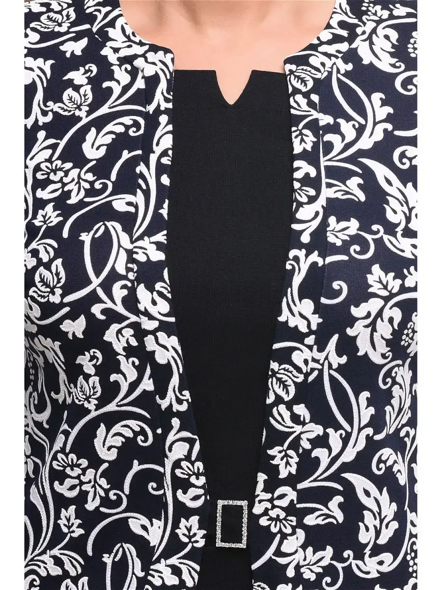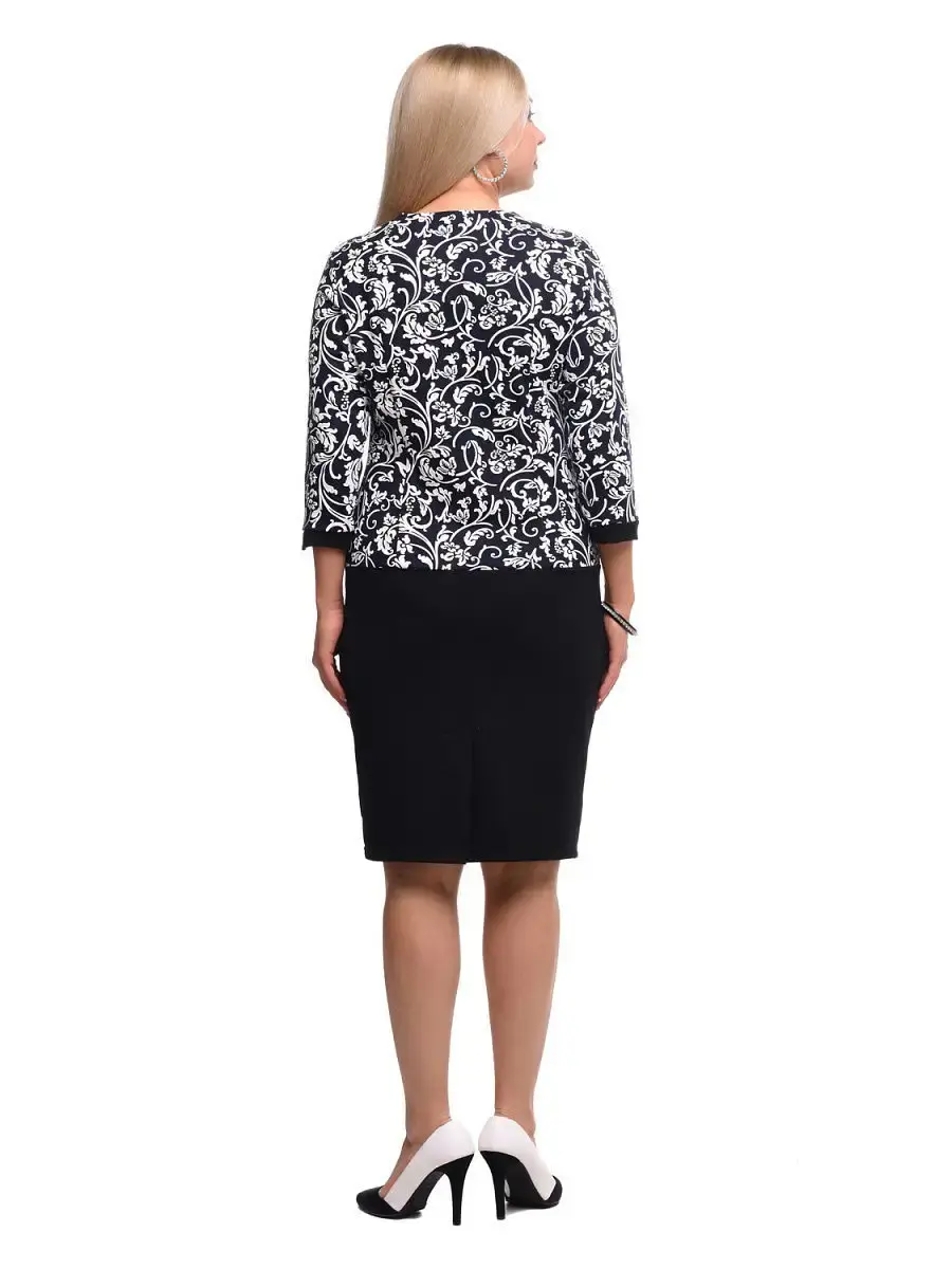 Эффектное платье-костюм, имитирующее многослойный наряд: укороченный приталенный жакет из ткани с монохромным принтом арабеск, застегивающийся на талии на хлястик с блестящей пряжкой; с округлой горловиной, отделанной окантовкой; с втачными рукавами 3/4, на открытых манжетах , надетый поверх платья-футляр длиной до колен, зауженное книзу с разрезом-шлицей на подоле сзади.