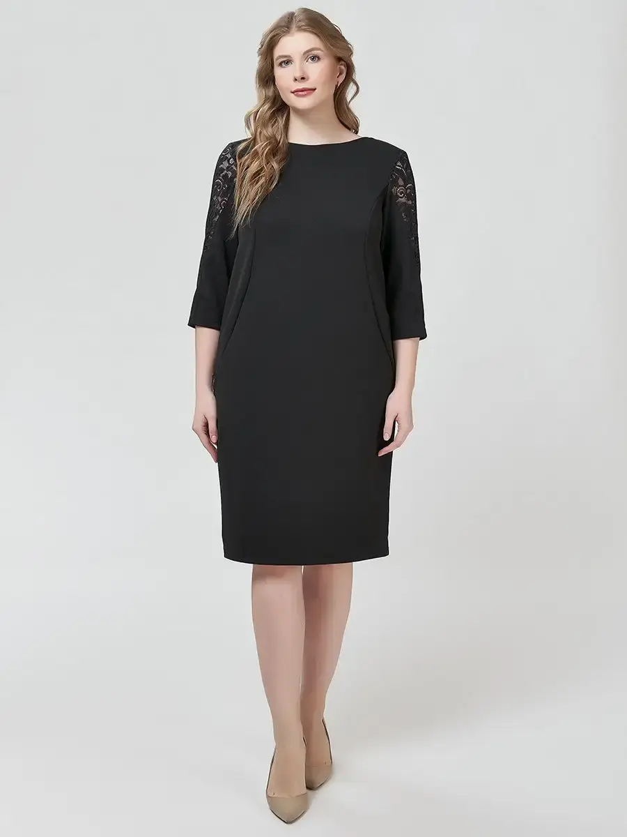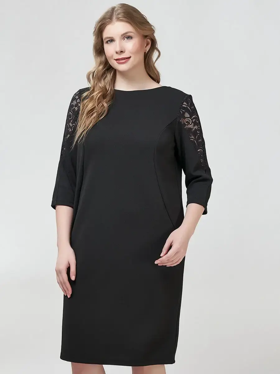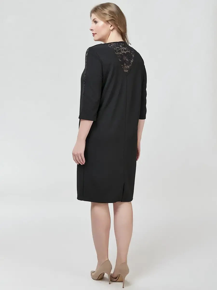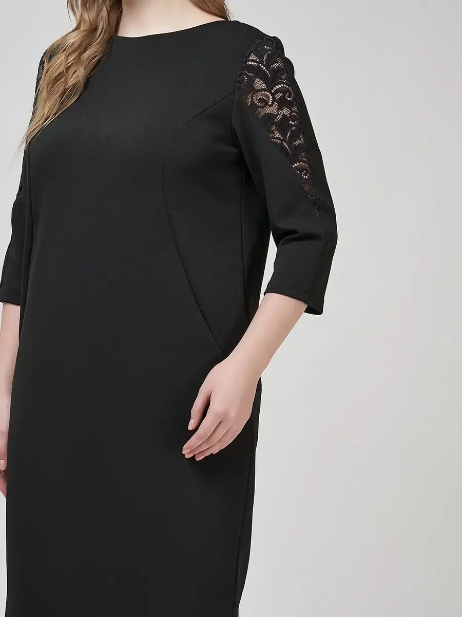 Элегантное платье длиной до колен, чуть зауженное книзу. С гипюровыми V-образными вставками вверху спинки и поверху рукавов; круглым вырезом горловины; рукавами длиной 3/4.