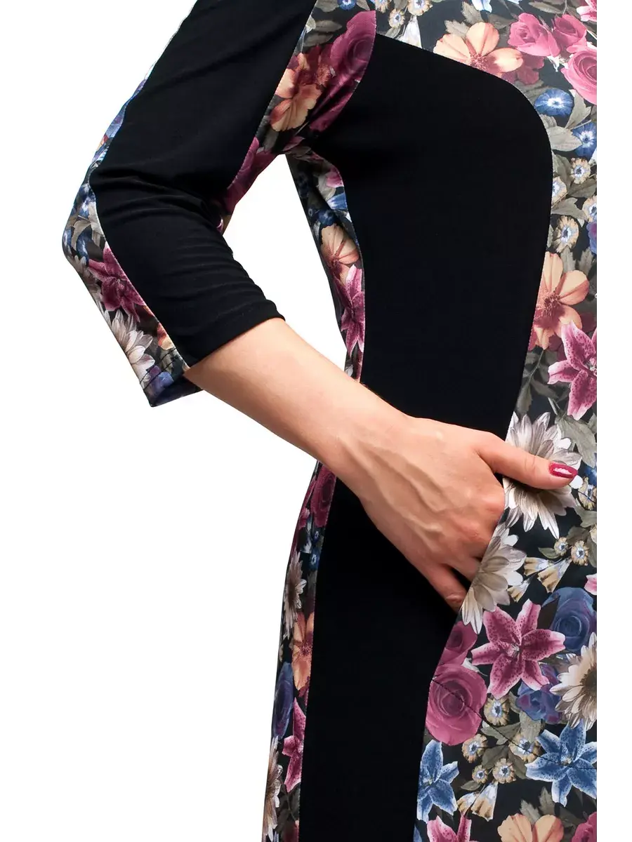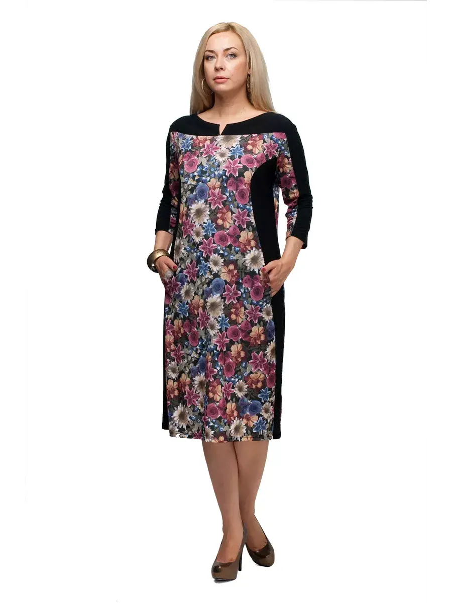 Женское повседневное платье больших размеров выполнено из немнущегося трикотажа "масло". По бокам платье имеет черные вертикальные вставки из того же материала, что визуально корректирует фигуру и удлиняет силуэт.