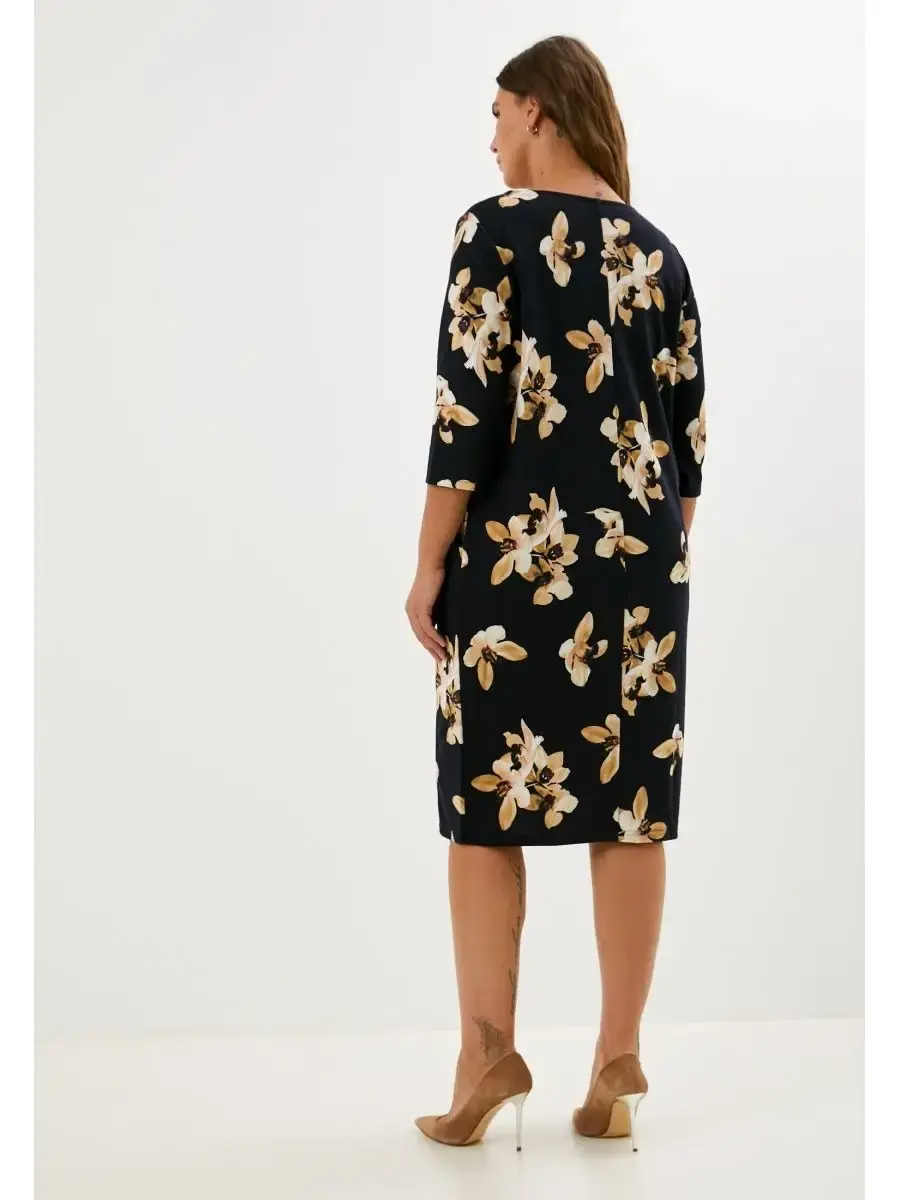 Стильное модное платье из нежной ткани с крупным цветочным принтом прямого силуэта с подкройным бочком. Модель с вырезом горловины лодочка, втачными рукавами 3/4 и удобными карманами в бочках полочек.