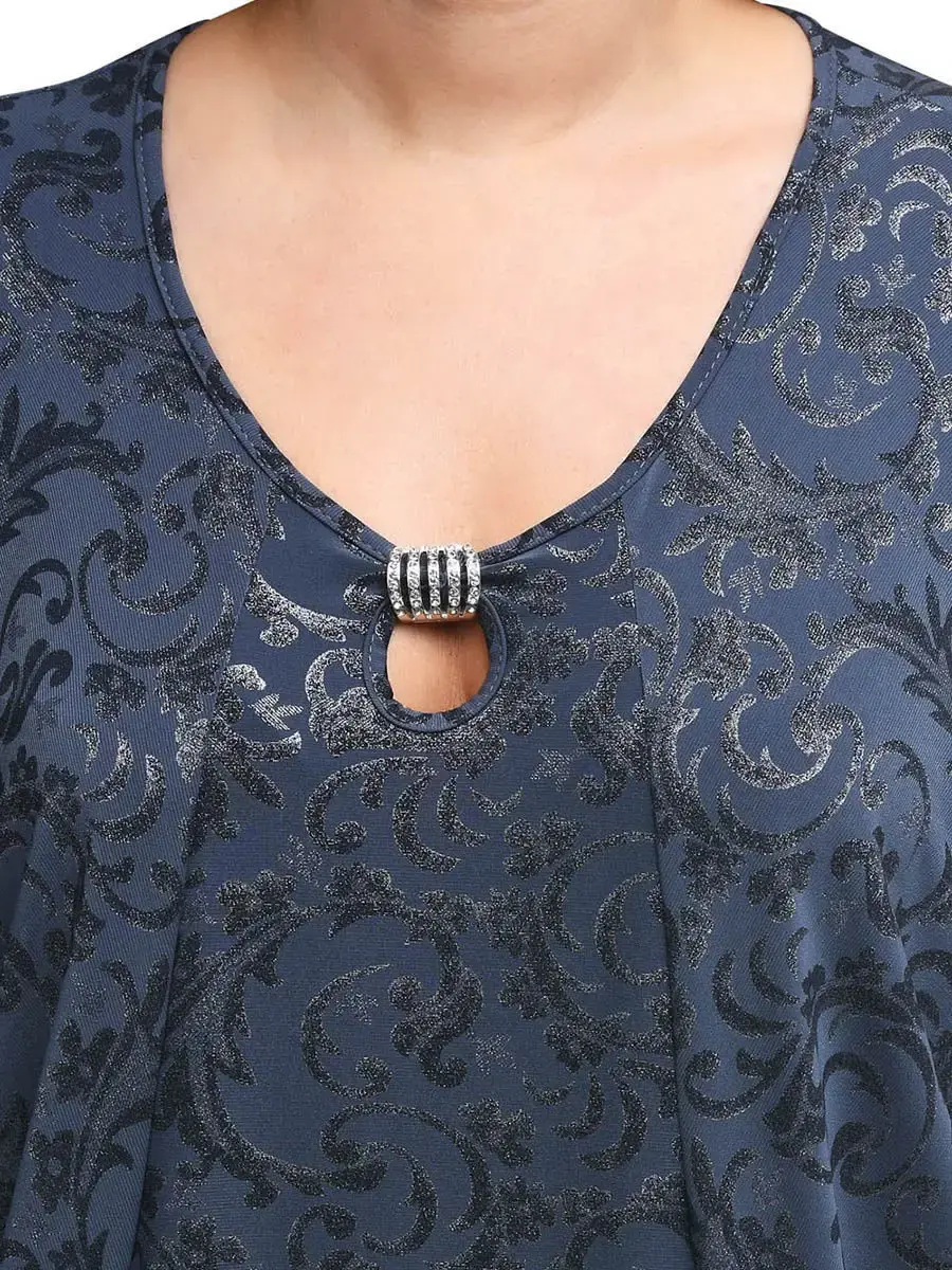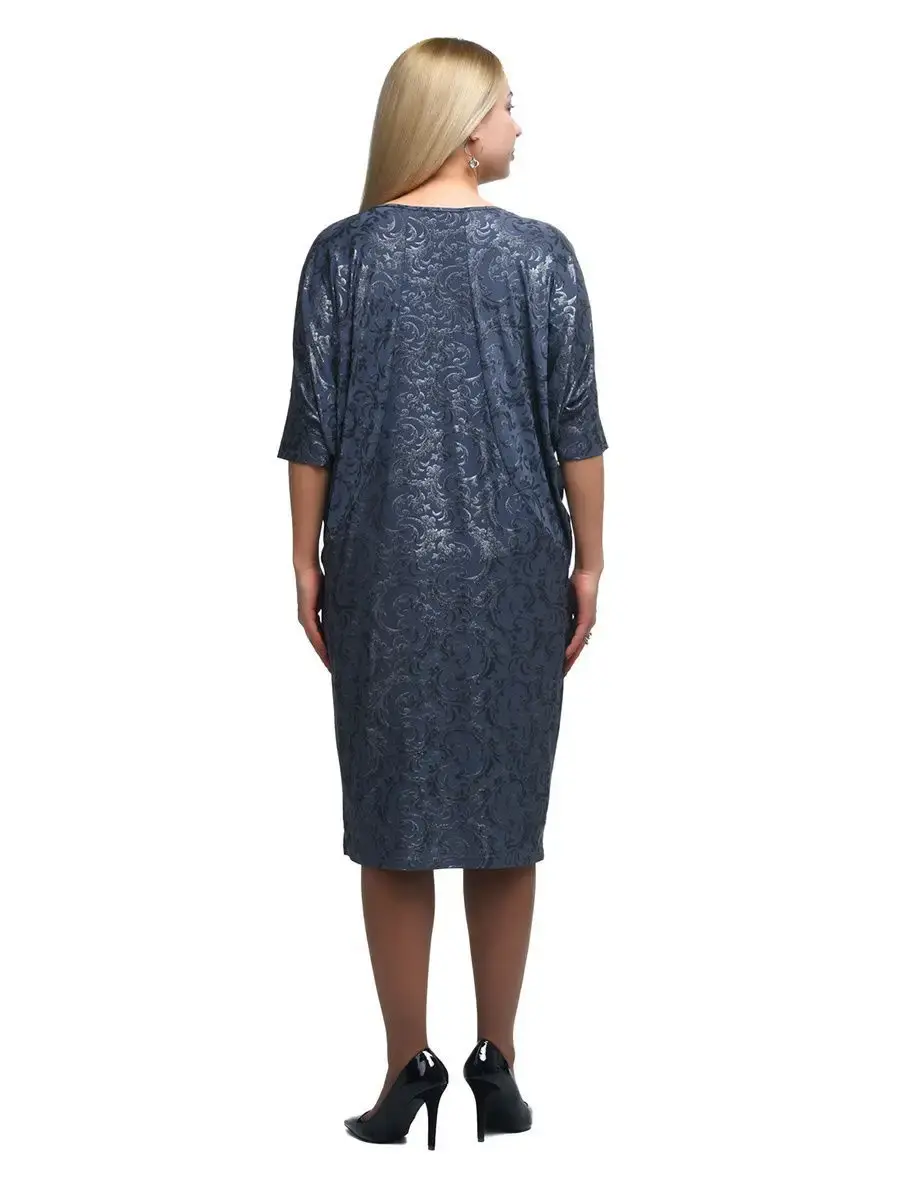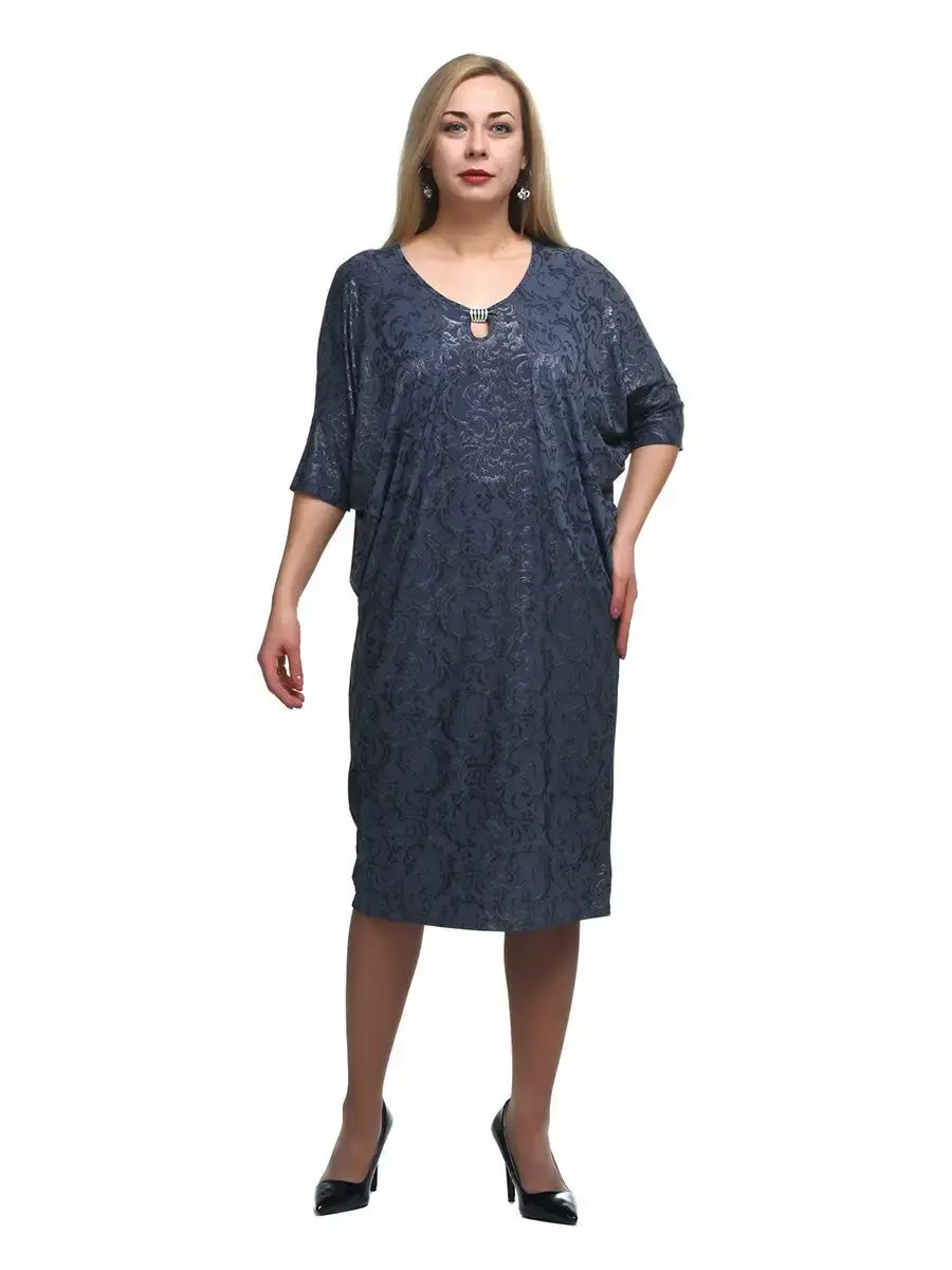 Эффектное нарядное платье из струящегося трикотажа масло с рельефным растительным принтом фойлом. Модель длиной чуть ниже колен, зауженная книзу; с V-образным вырезом горловины замочная скважина, декорированным брошью, придающей образу чувственные нотки; рукавами с широкими втачными манжетами летучая мышь 3/4.
