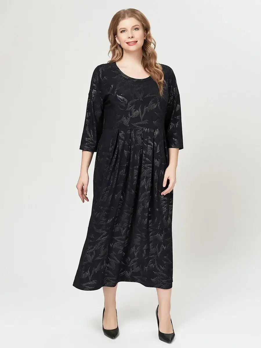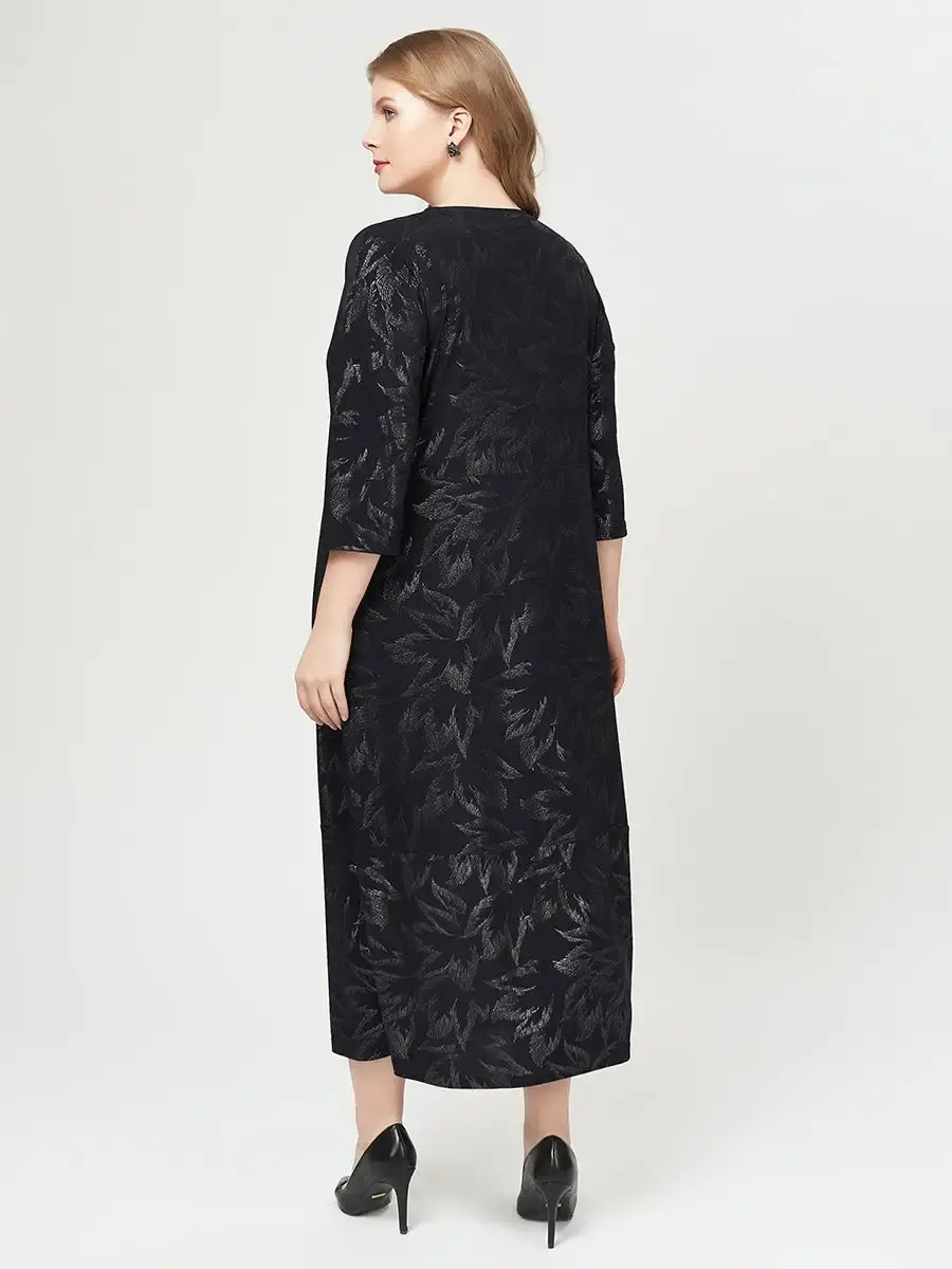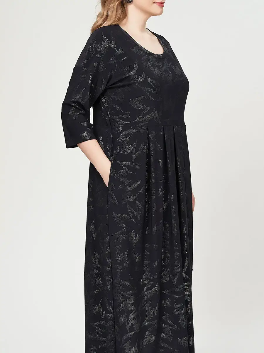 Нарядное платье из струящегося трикотажа - масло с блестящим принтом. Модель миди-длины, с округлым глубоким вырезом, втачными рукавами 3/4 со спущенной проймой и мягкой линией плеча, врезными боковыми карманами. Отрезная, выше линии талии, юбка с защипами, создающими крупную складку спереди, и прямая сзади.
