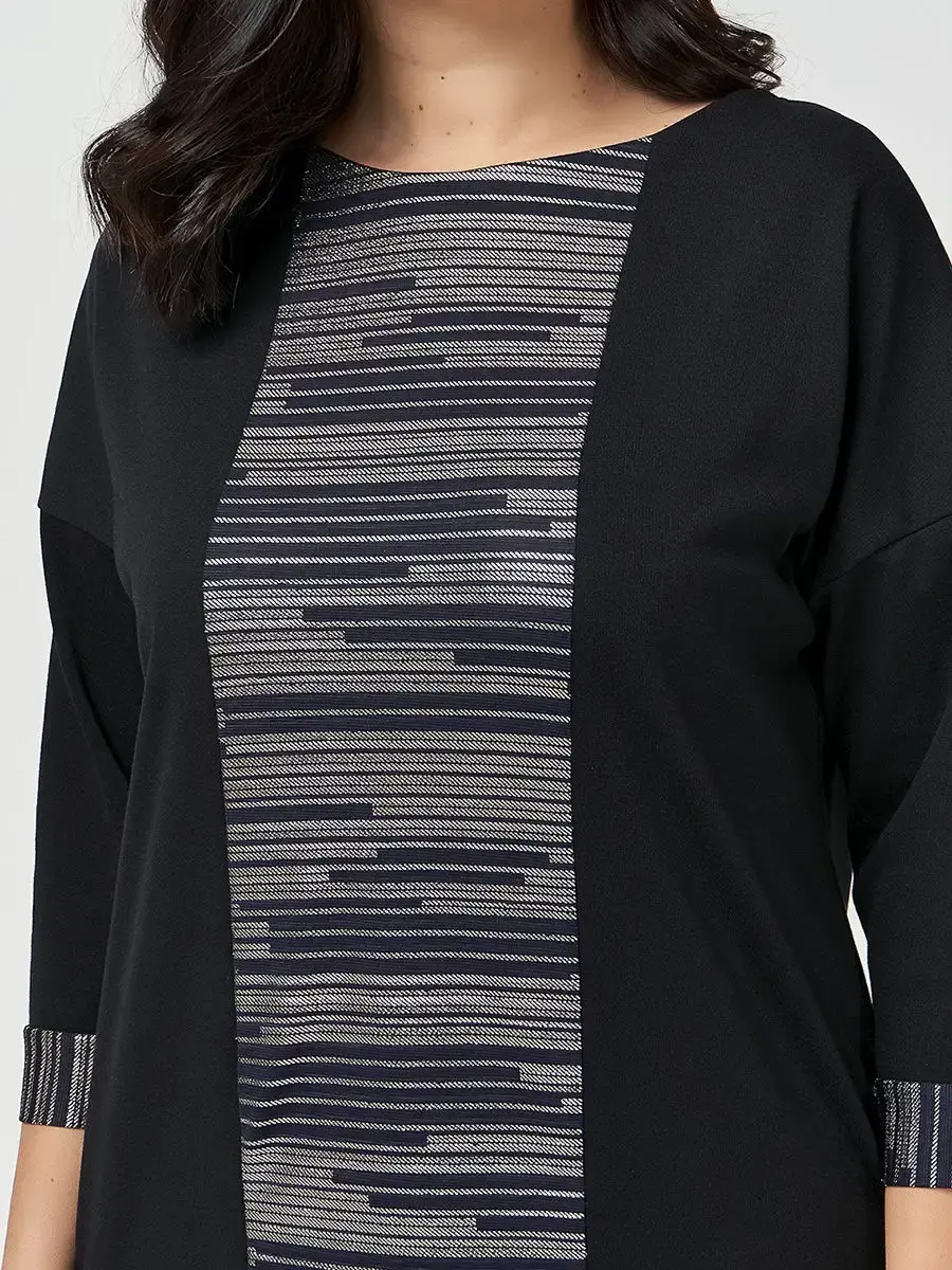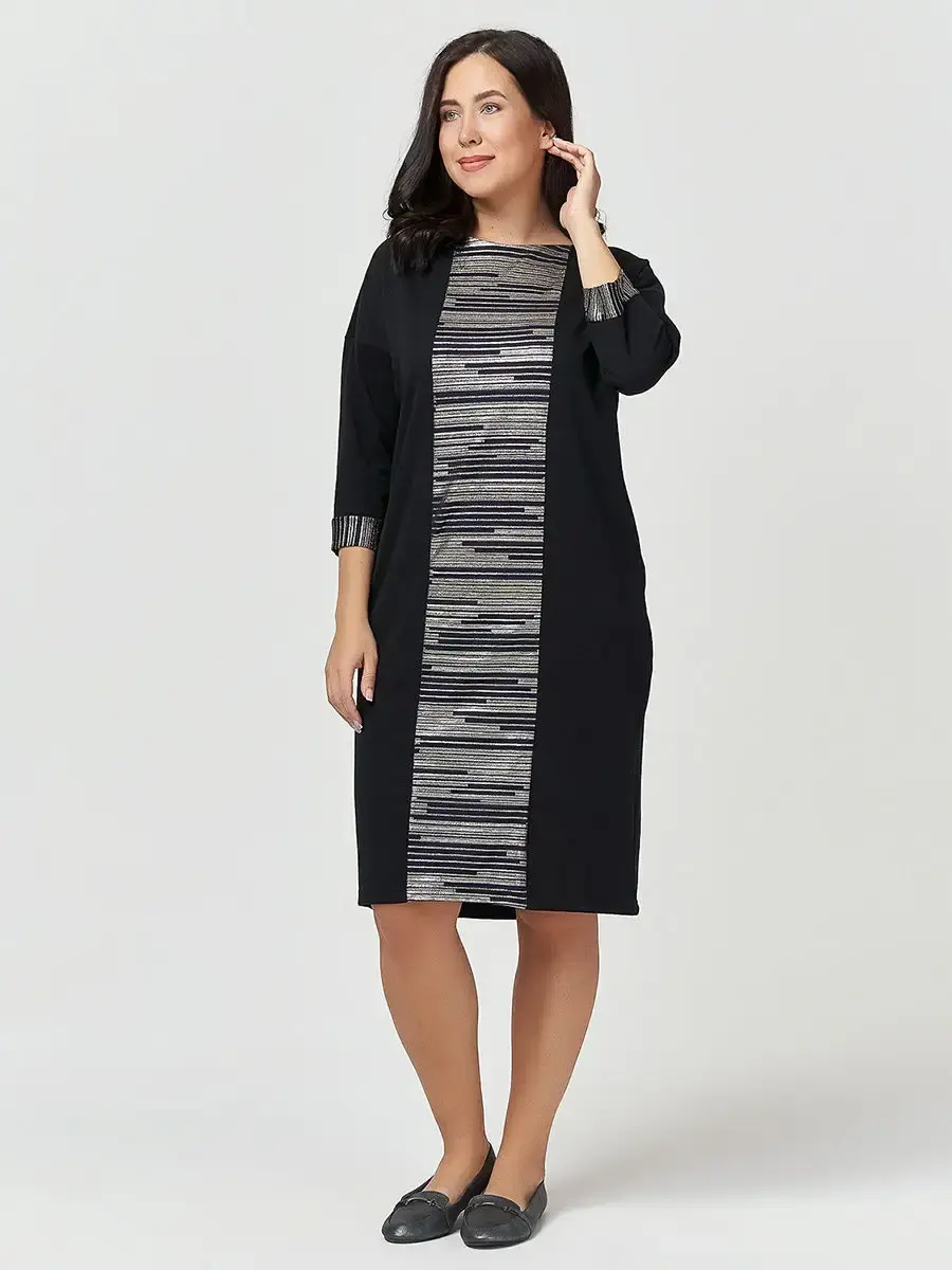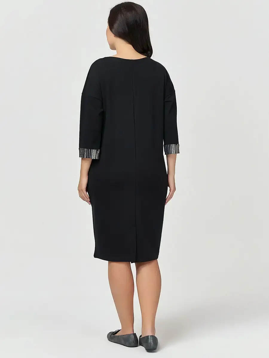 Платье женское больших размеров полуприталенного силуэта, из плотного трикотажного полотна, с декоративной вертикальной вставкой спереди из блестящего материала. Рукав 3/4, с манжетами из декоративного материала. Сзади шлица в среднем шве.
