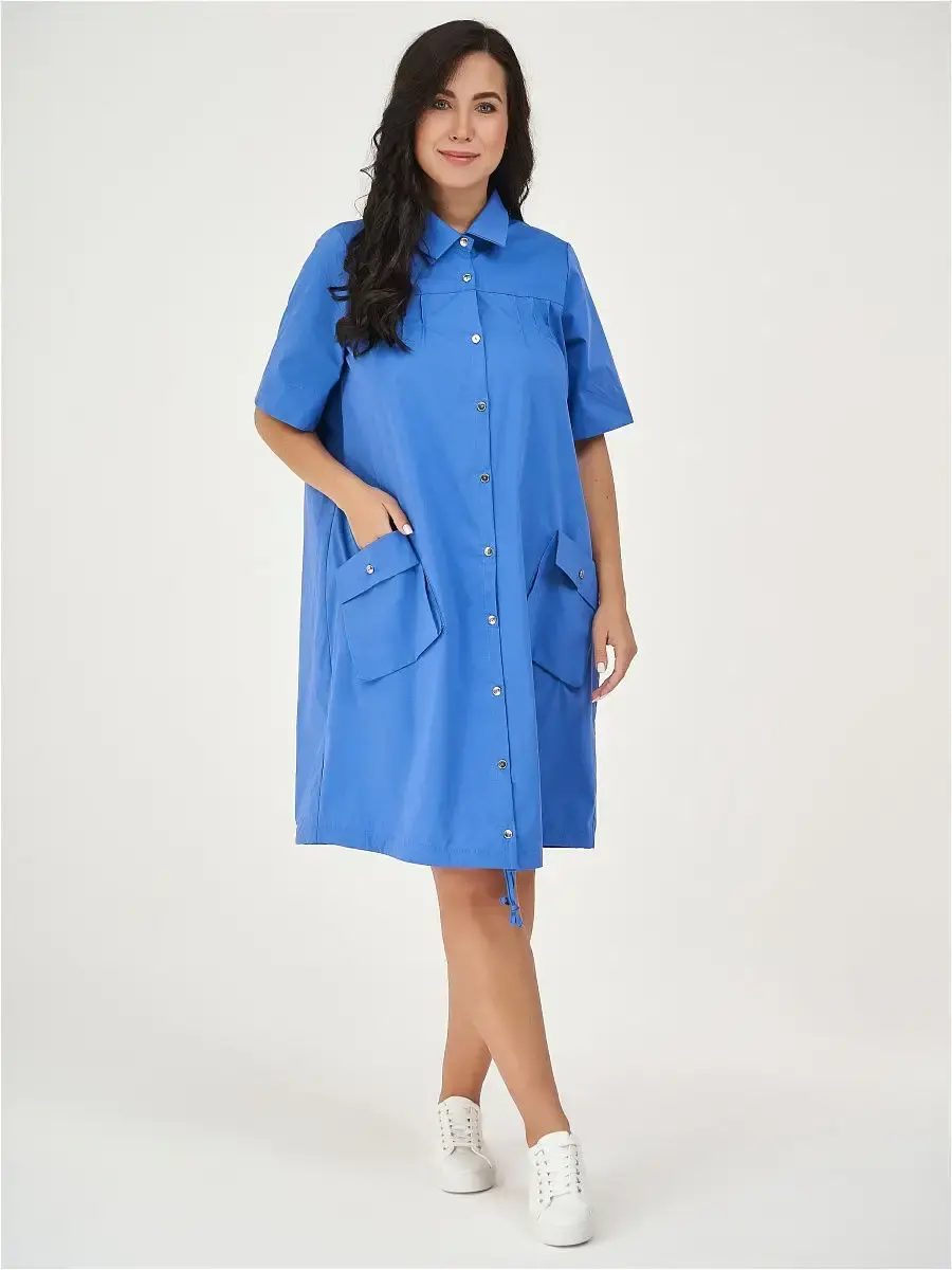 Летнее платье больших размеров свободного кроя, из хлопка с эластаном. Отложной воротник, платье застёгивается на пуговицы, функциональные большие карманы, ширина низа регулируется кулиской.