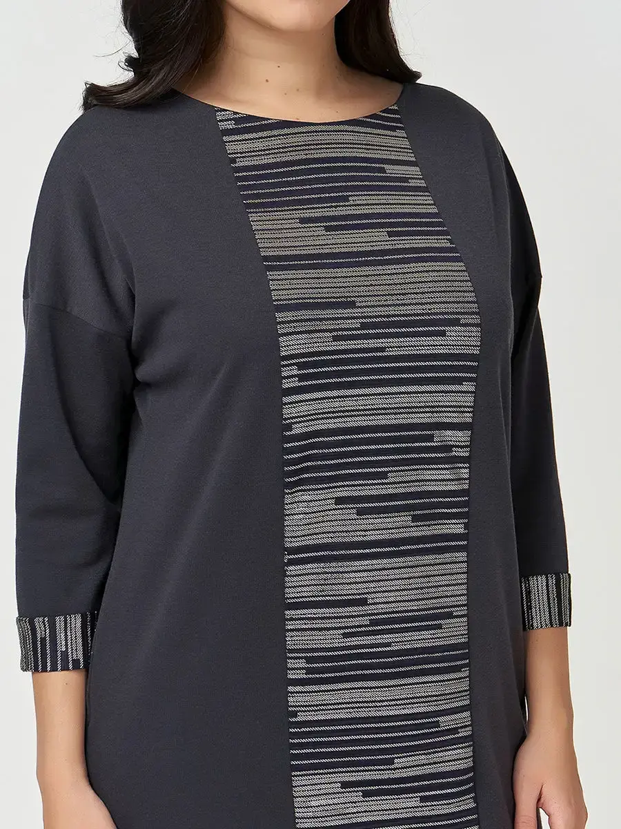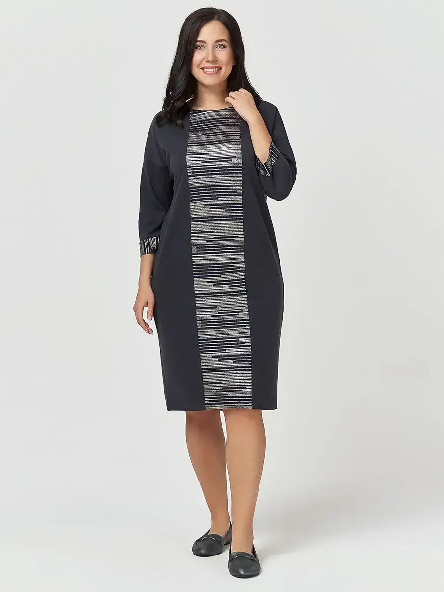 Платье женское больших размеров полуприталенного силуэта, из плотного трикотажного полотна, с декоративной вертикальной вставкой спереди из блестящего материала. Рукав 3/4, с манжетами из декоративного материала. Сзади шлица в среднем шве.