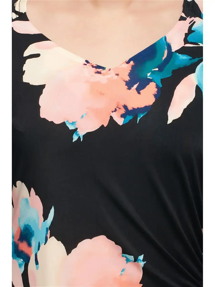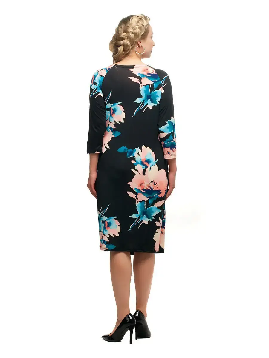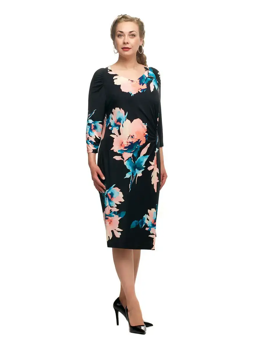 Изысканное платье длиной чуть ниже колен, из струящейся ткани с крупным цветочным принтом. Изюминка модели - в деталях, которые создают аллюзии на модные тенденции и одновременно корректируют фигуру: изделие с вырезом горловины а-ля фигурное каре;втачными рукавами с защипами по линии плеча, создающими эффект рукавов буф;с псевдозапахом;ассиметричным низом, с длинной полочкой-пикой. Конструктивные защипы по короткой полочке визуально прорисовывают талию, придают фигуре изящество. Идеальный вариант платья-тайны для загадочной женщины.