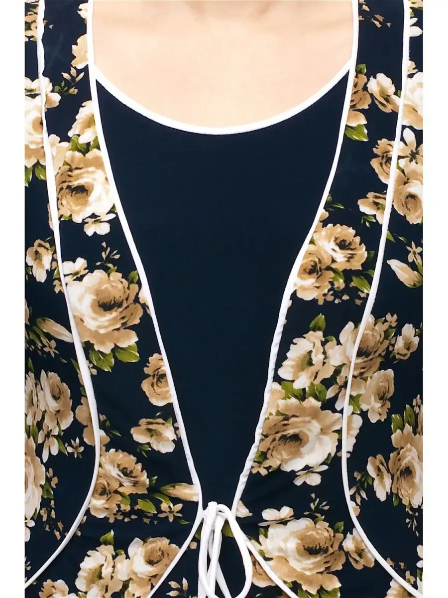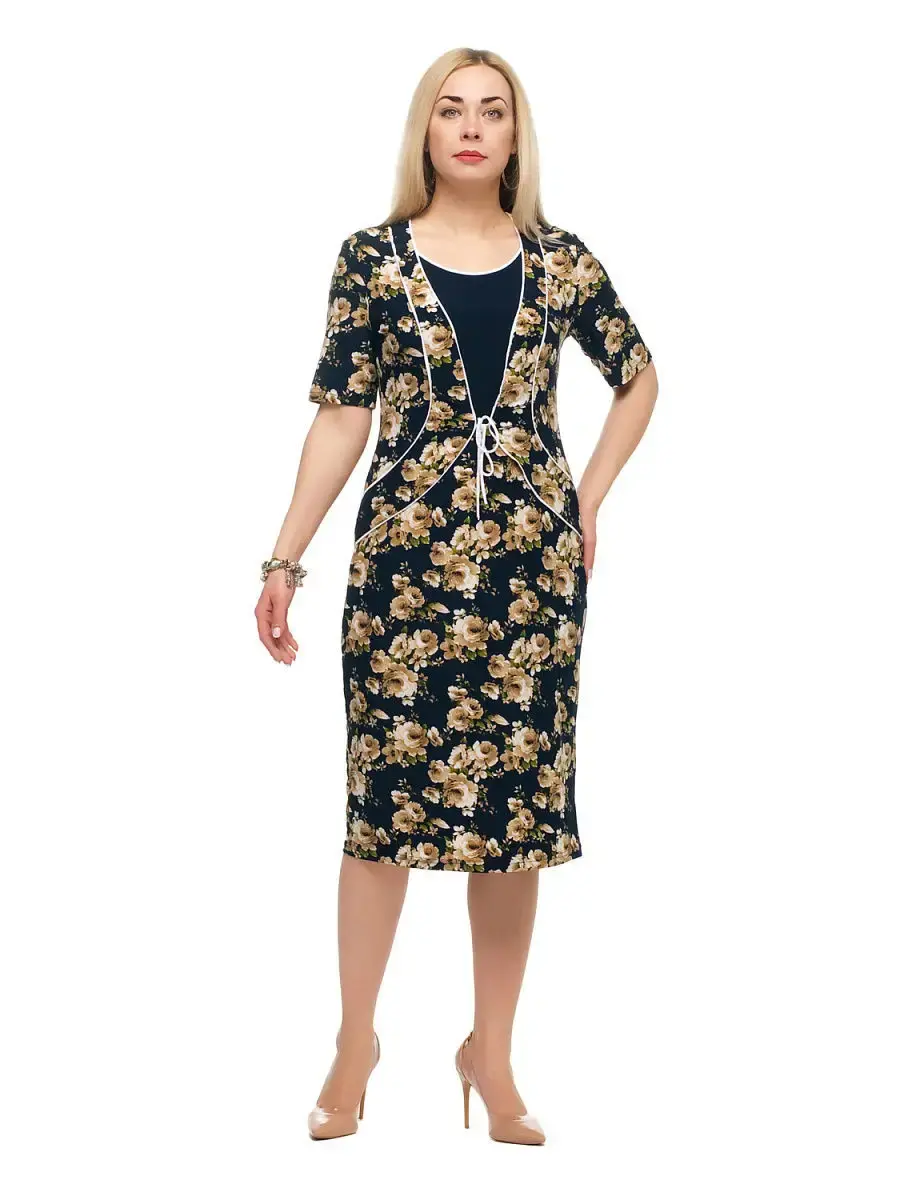 Эффектное платье длиной чуть ниже колен из эффектной тонкой ткани с некрупным цветочным принтом. Модель с эффектом многослойности, кроем и игрой фактур тканей, напоминающая костюм: зауженную книзу юбку, завязывающийся на талии жакет с втачными рукавами по локти; c V-образным вырезом, расходящимися овальными полами, надетый на однотонный топ с округлой горловиной. Кайма на деталях «прорисовывает» силуэт, визуально придает ему женственность и изящество.