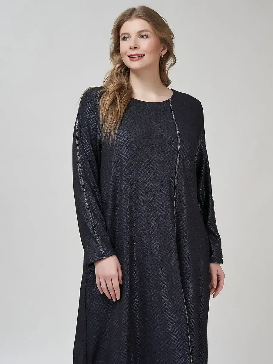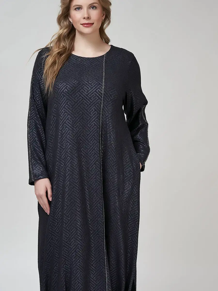 Ультрамодное длинное платье-бохо из трикотажа с блестящим геометрическим принтом, на манжете-кулиске с завязками и с конструктивными защипами по низу изделия, визуально суживающими силуэт. Модель с глубоким круглым вырезом, длинными втачными рукавами. Декорирована блестящим кантом-лампасом по рукаву и в виде боковой застежки по всей длине.