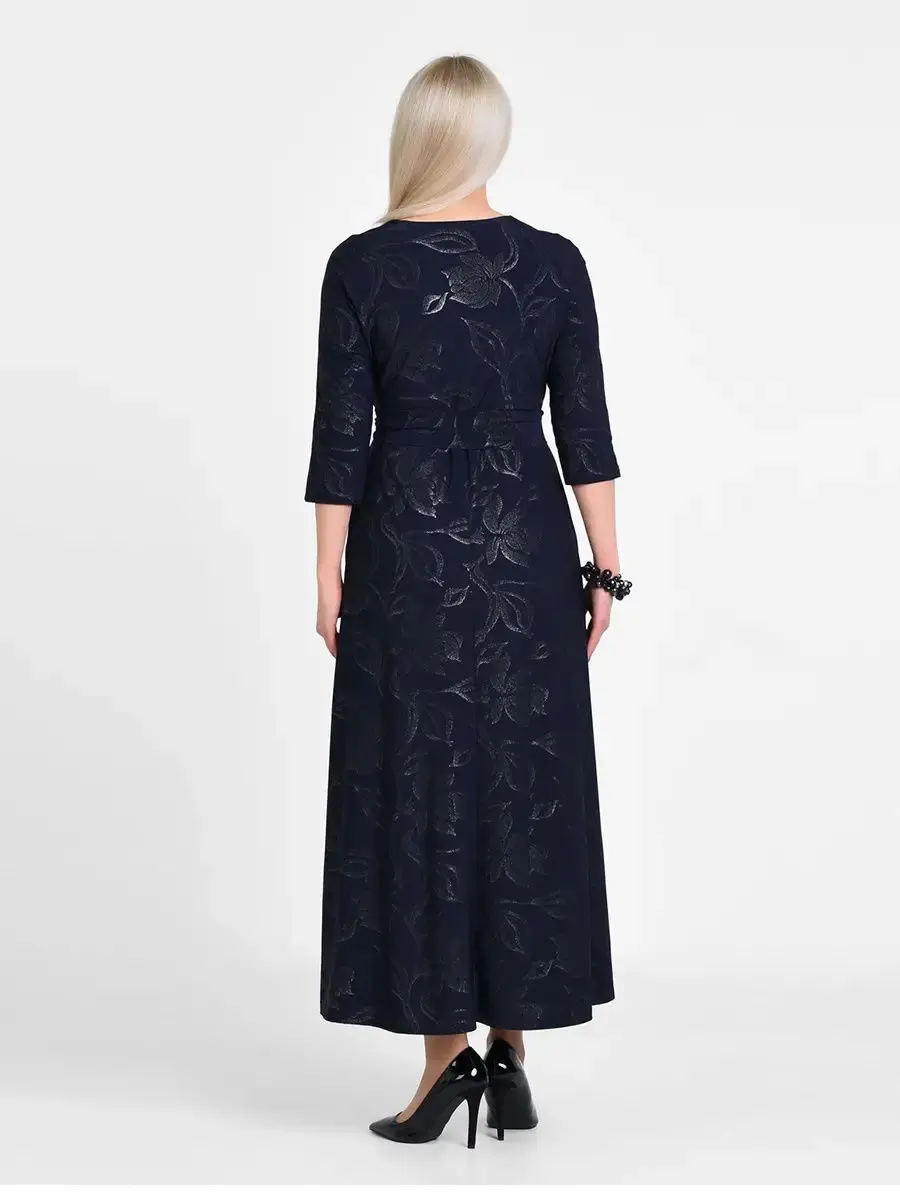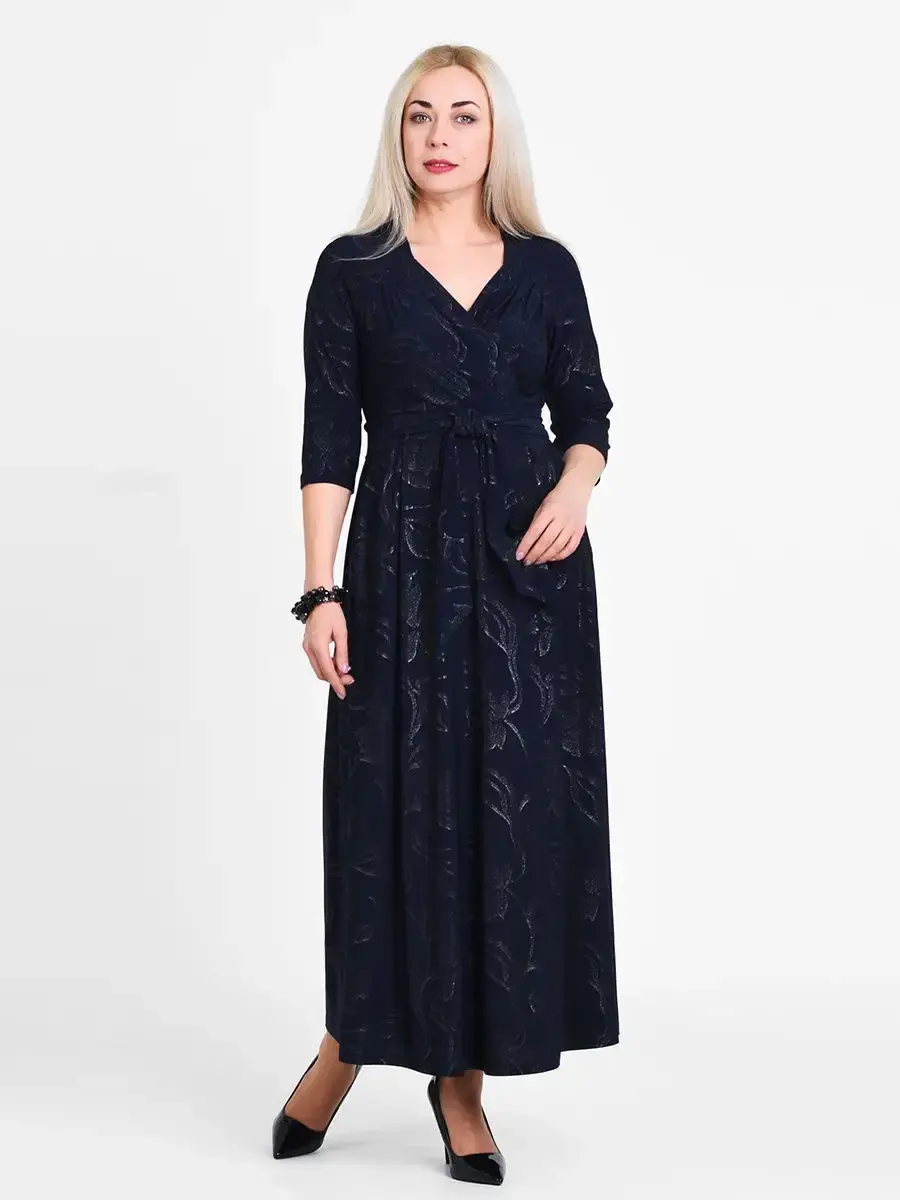 Праздничное изысканное платье макси из струящегося трикотажа-масло с растительным принтом фойлом. Модель прилегающего силуэта, с поясом в комплекте; отрезная по талии, с глубоким вырезом фигурное каре, рукавами-реглан 3/4, с защипами, придающими форму лифу. Низ изделия с боковыми врезными карманами, защипами, формирующими драпировку спереди. Женственный и элегантный наряд подчеркнет талию, шикарную грудь и скроет лишние объемы. Длина по спинке 139см во всех размерах, длина рукава 45см.