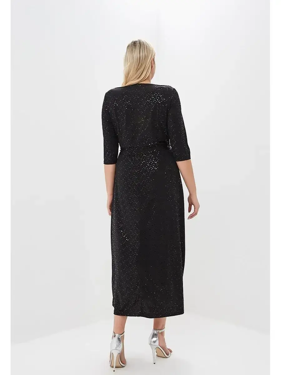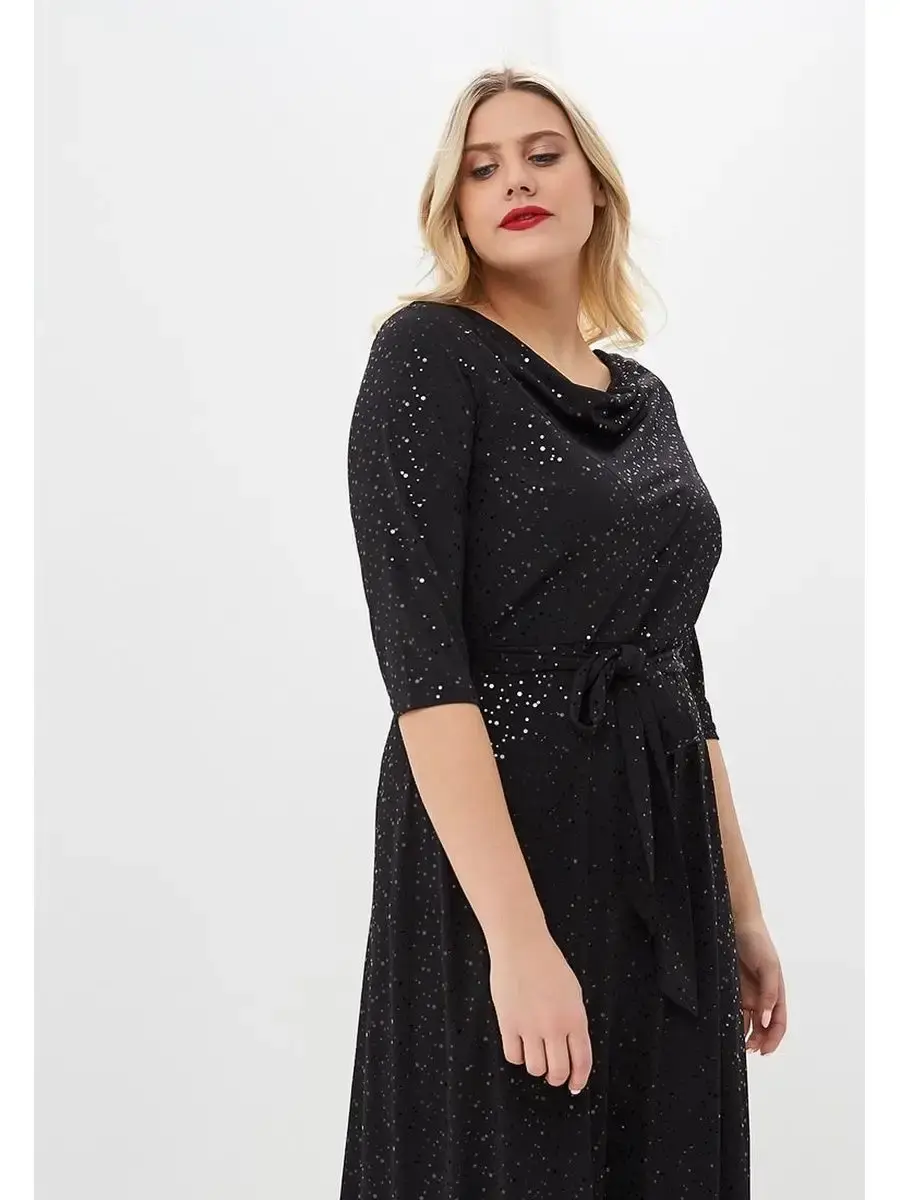 Нарядное платье макси из струящейся ткани масло с принтом, имитирующим пайетки; с втачными узкими рукавами длиной 3/4, воротником качели. Модель отрезная по талии, полуприлегающего силуэта, декорирована вшитым поясом, завязывающимся на бант. Длина изделия по спинке во всех размерах 138см, длина рукава 43см.