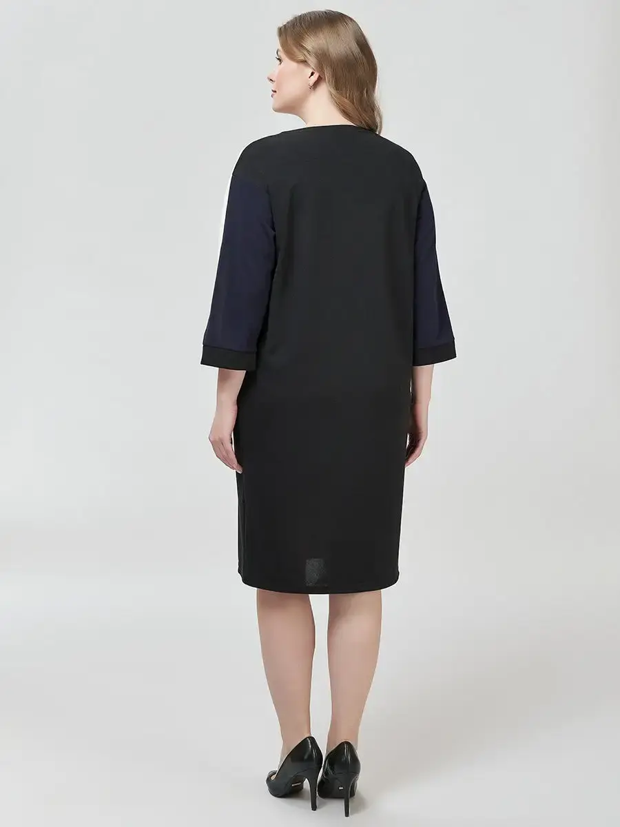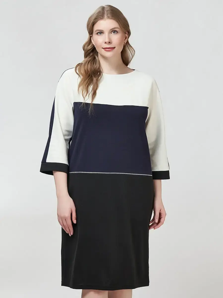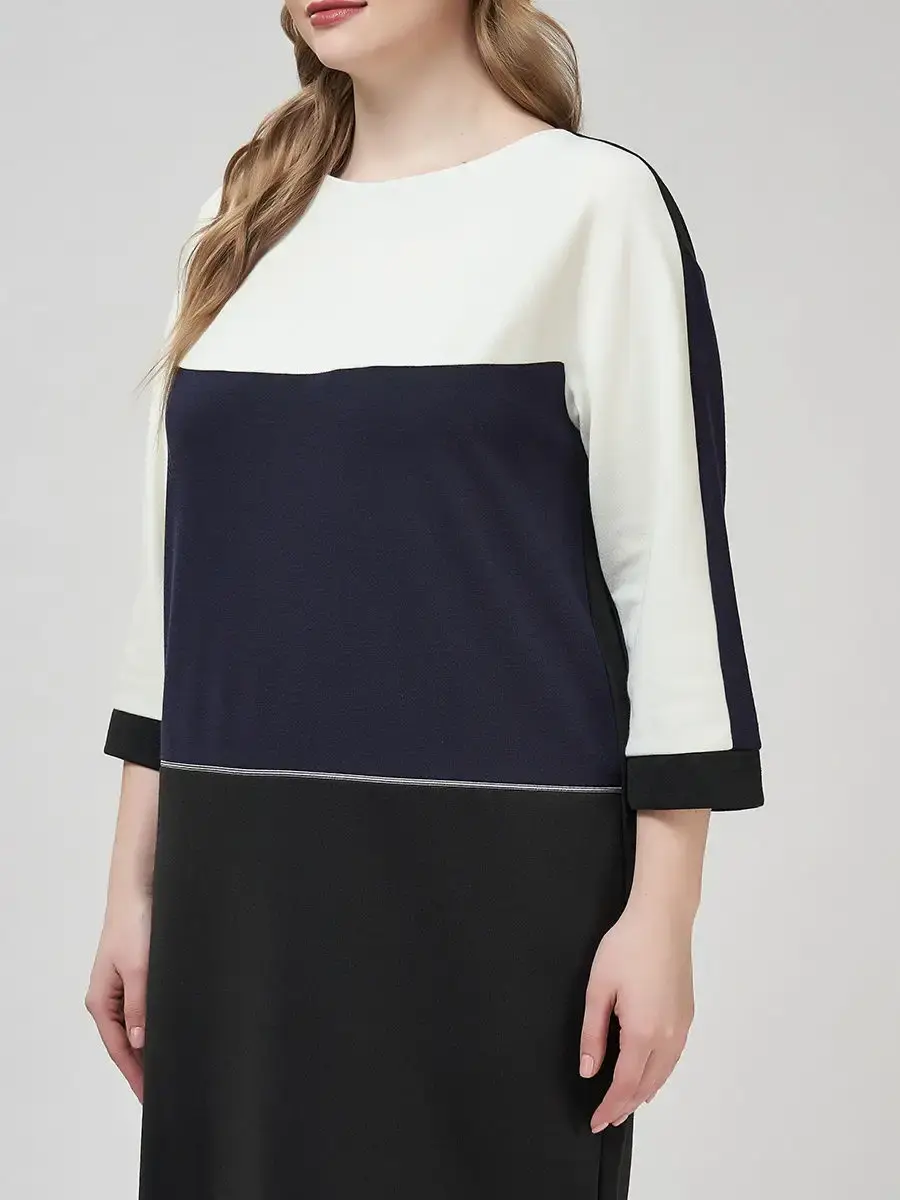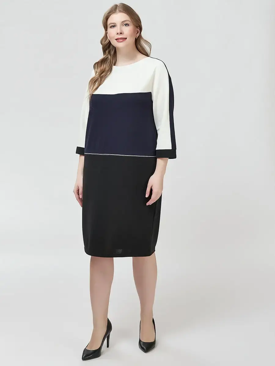 Стильное платье длиной до середины голени, из комбинации цветного шелковистого материала классической монохромной палитры; с округлым вырезом горловины, рукавами длиной 3/4 с манжетами. Модель свободного силуэта, отрезная по кокетке и ниже талии.