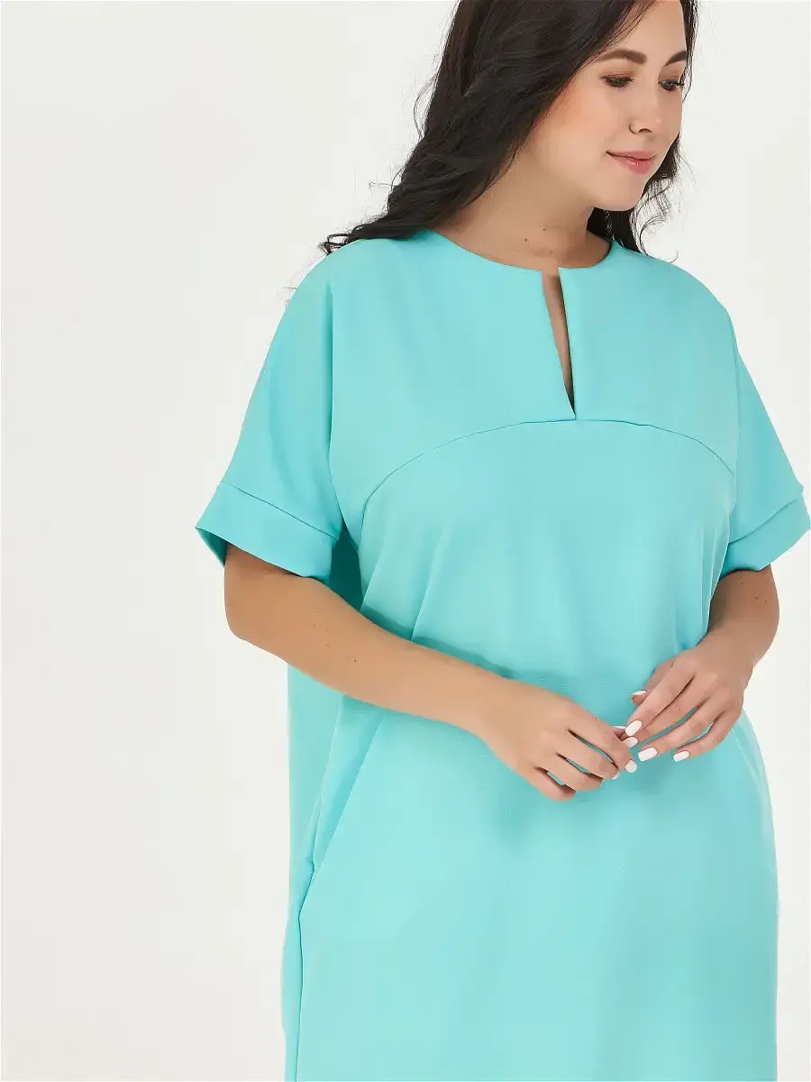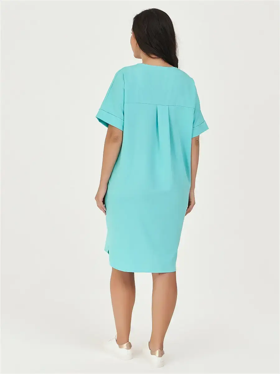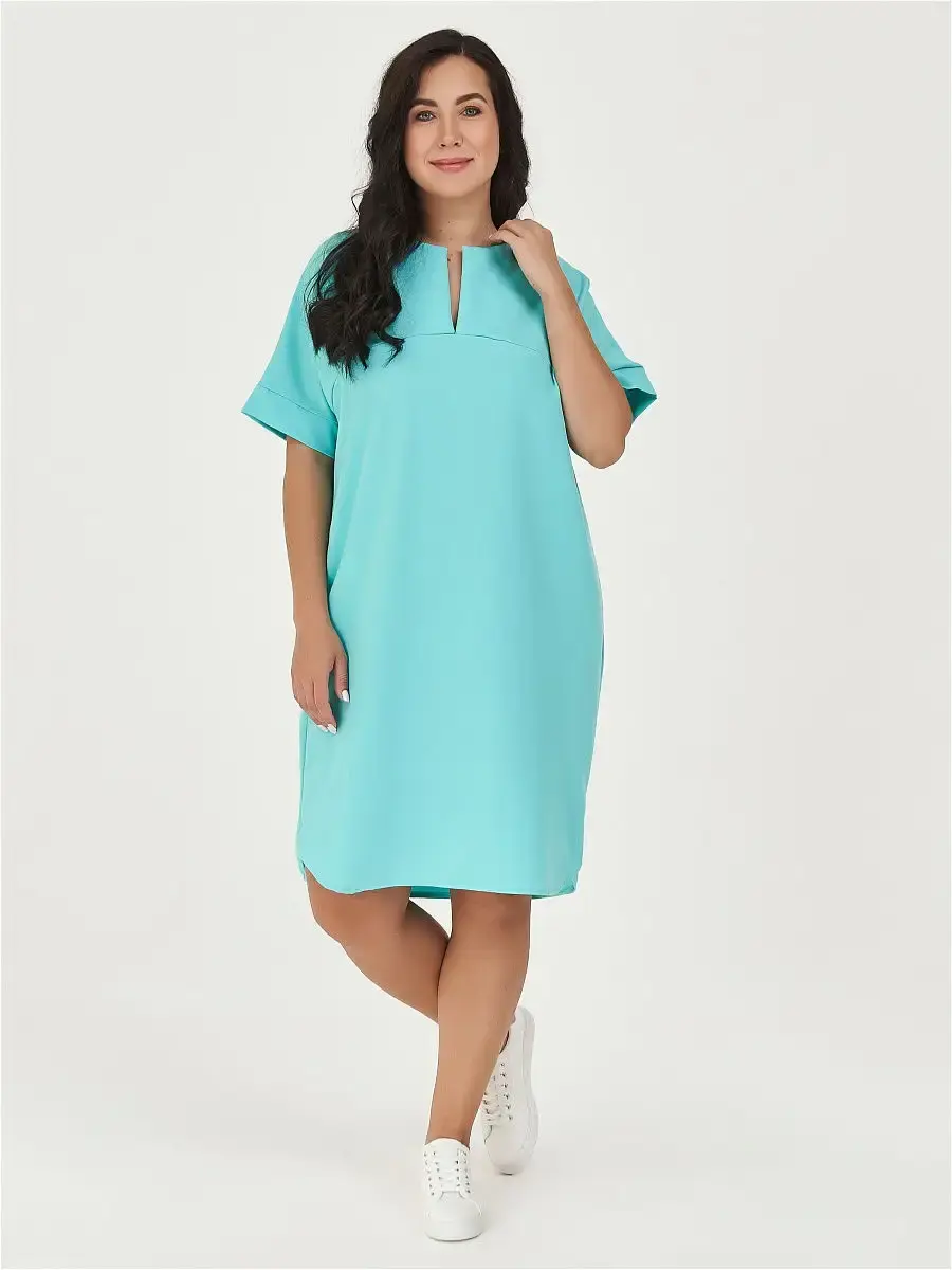 Платье больших размеров прямого силуэта, объёмной формы, из плотного текстильного полотна с добавлением эластана, кокетка на линии груди. Каманы в боковых швах. Рукав короткий цельнокроенный, с манжетой. Низ платья закругленный к боковым швам.