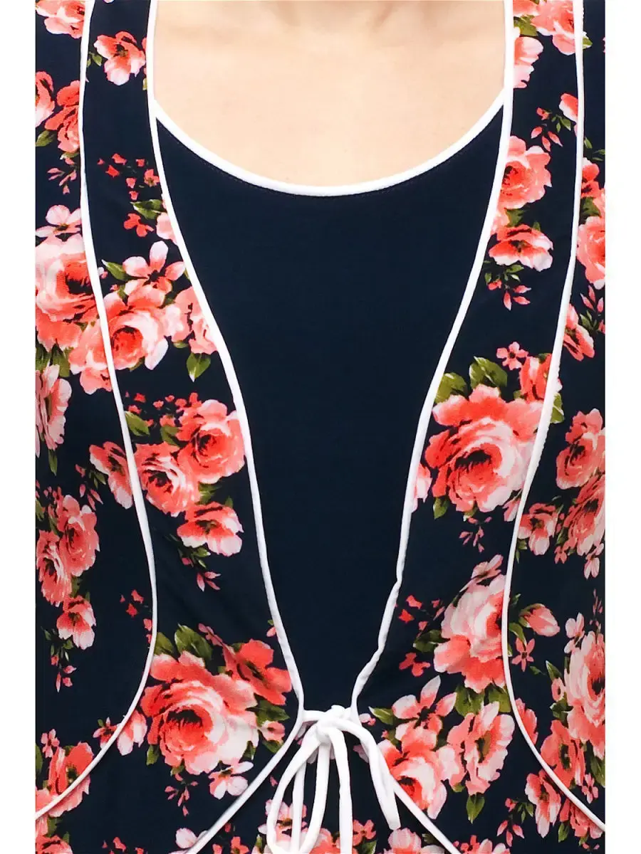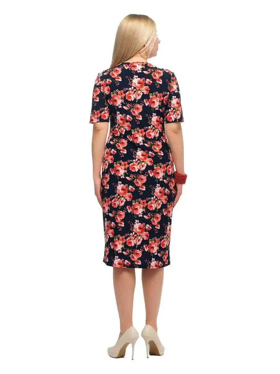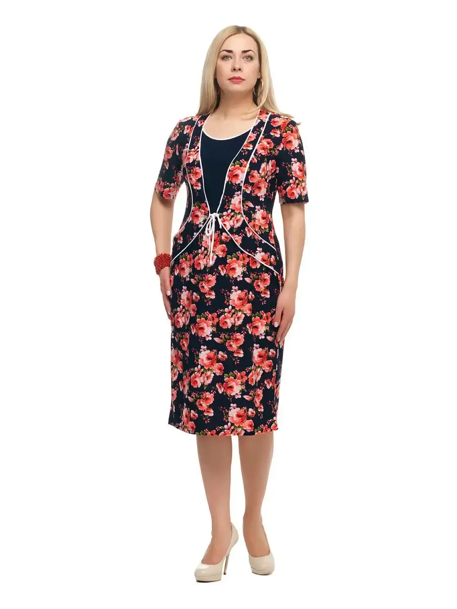 Эффектное платье длиной чуть ниже колен из эффектной тонкой ткани с некрупным цветочным принтом. Модель с эффектом многослойности, кроем и игрой фактур тканей, напоминающая костюм: зауженную книзу юбку, завязывающийся на талии жакет с втачными рукавами по локти; c V-образным вырезом, расходящимися овальными полами, надетый на однотонный топ с округлой горловиной. Кайма на деталях «прорисовывает» силуэт, визуально придает ему женственность и изящество.