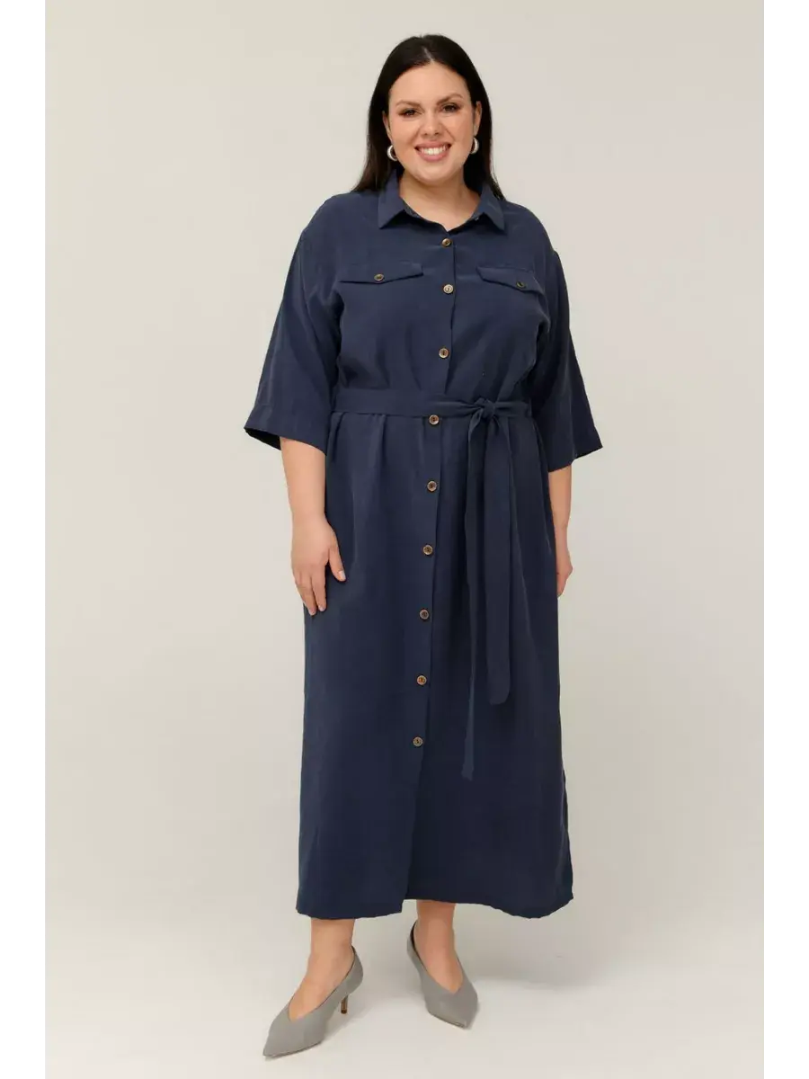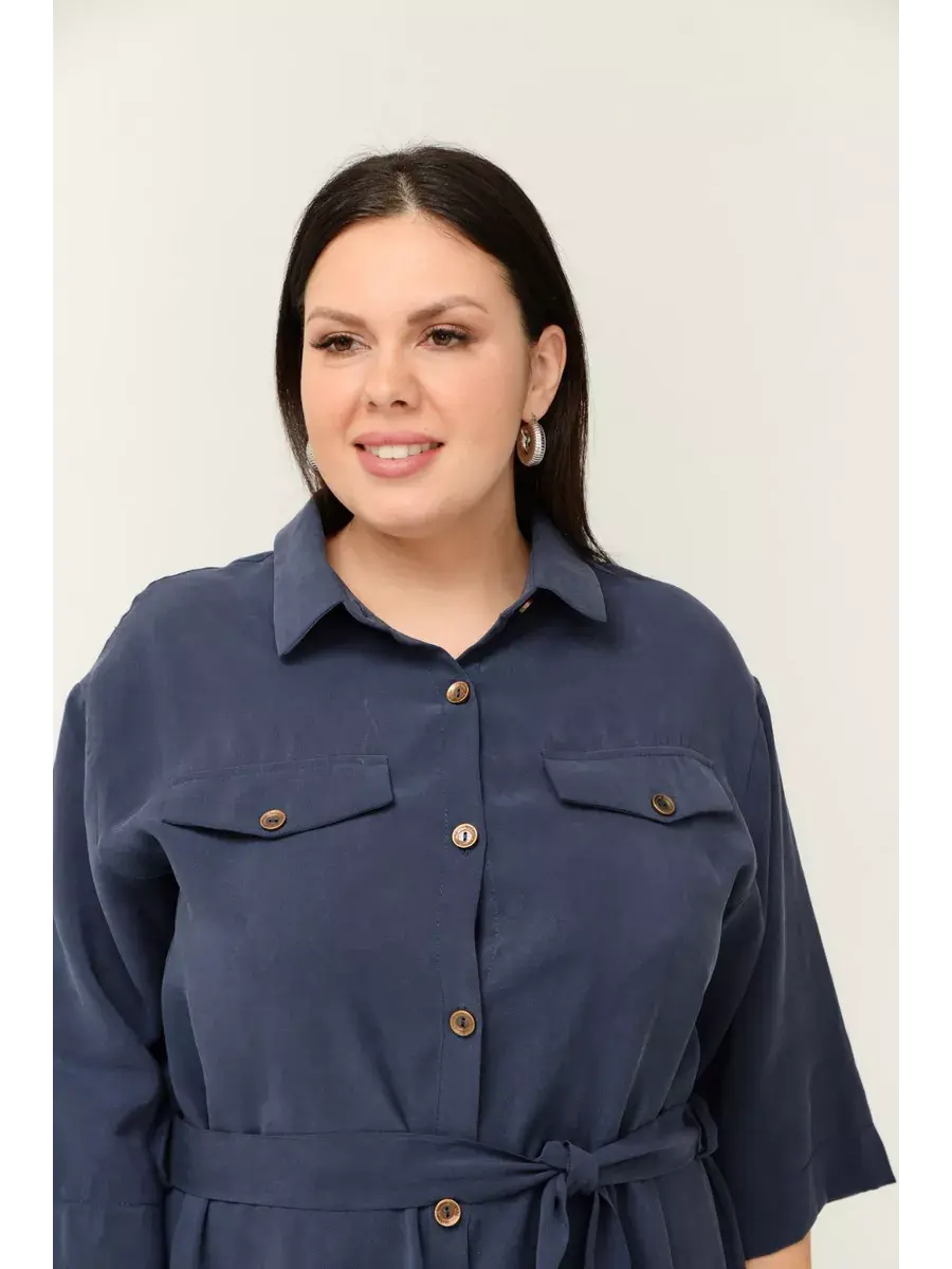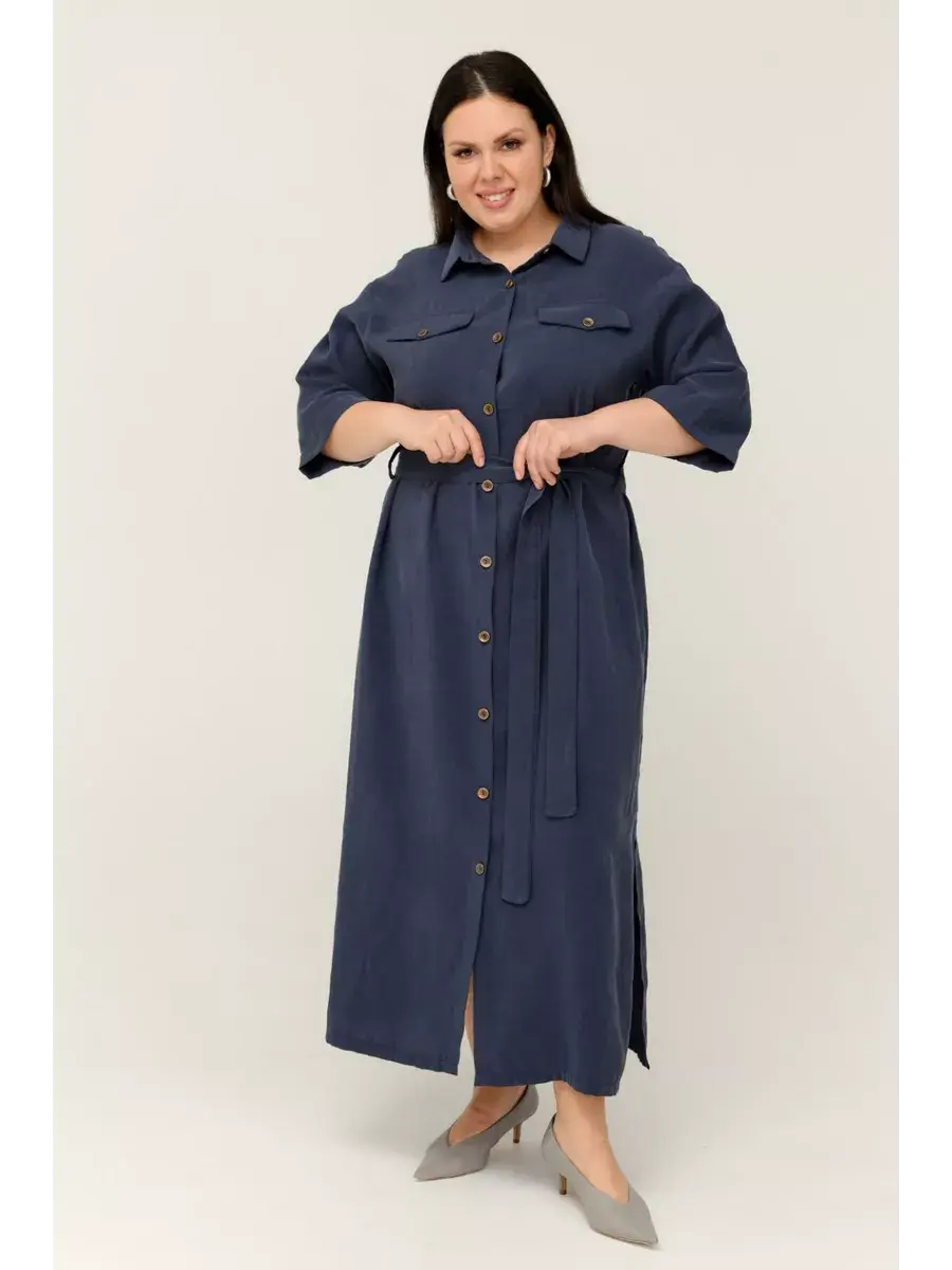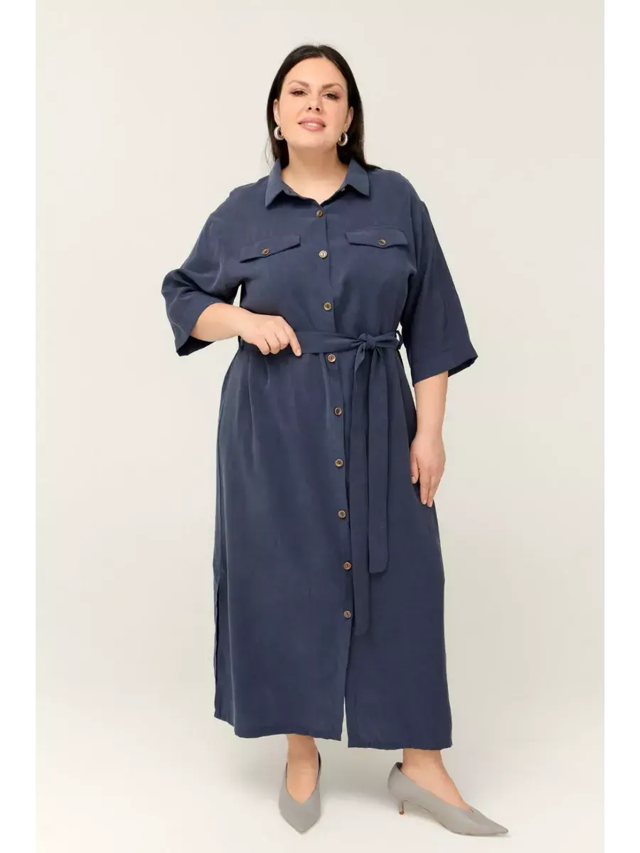 Повседневное женское платье больших размеров от бренда OLSI. Платье женское рубашечного фасона выполнено из мягкого приятного на ощупь текстильного полотна. Отложной воротник, рукав 3/4, по низу боковые разрезы для удобства. Пояс в комплекте с платьем. Длина рукава 45см.