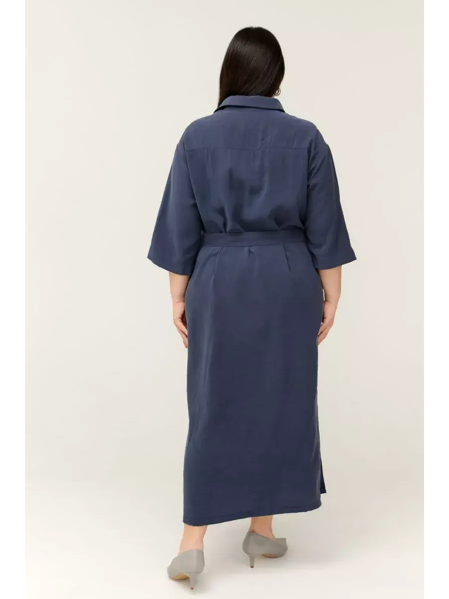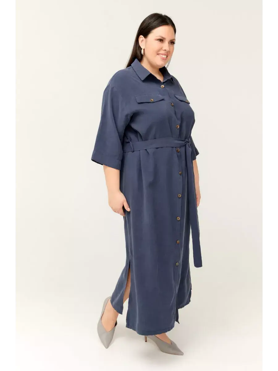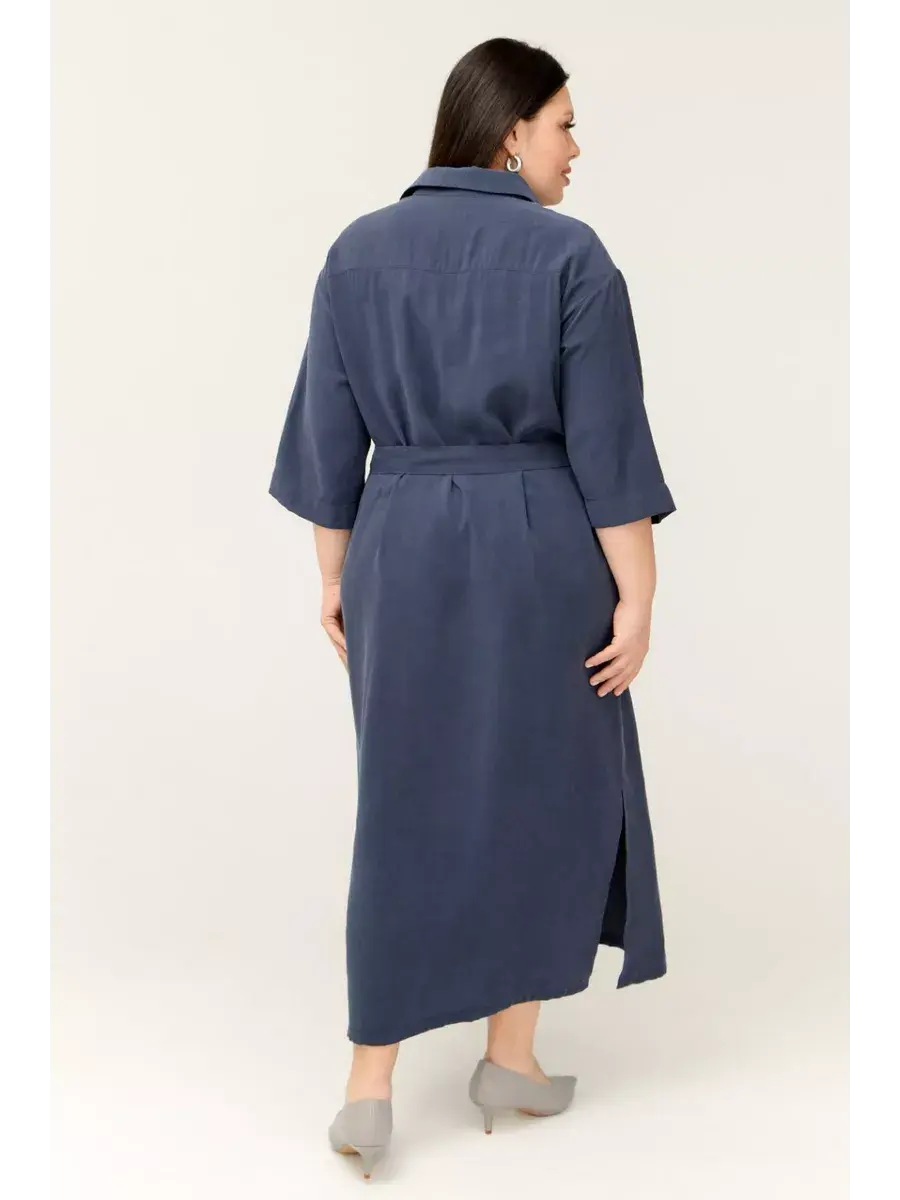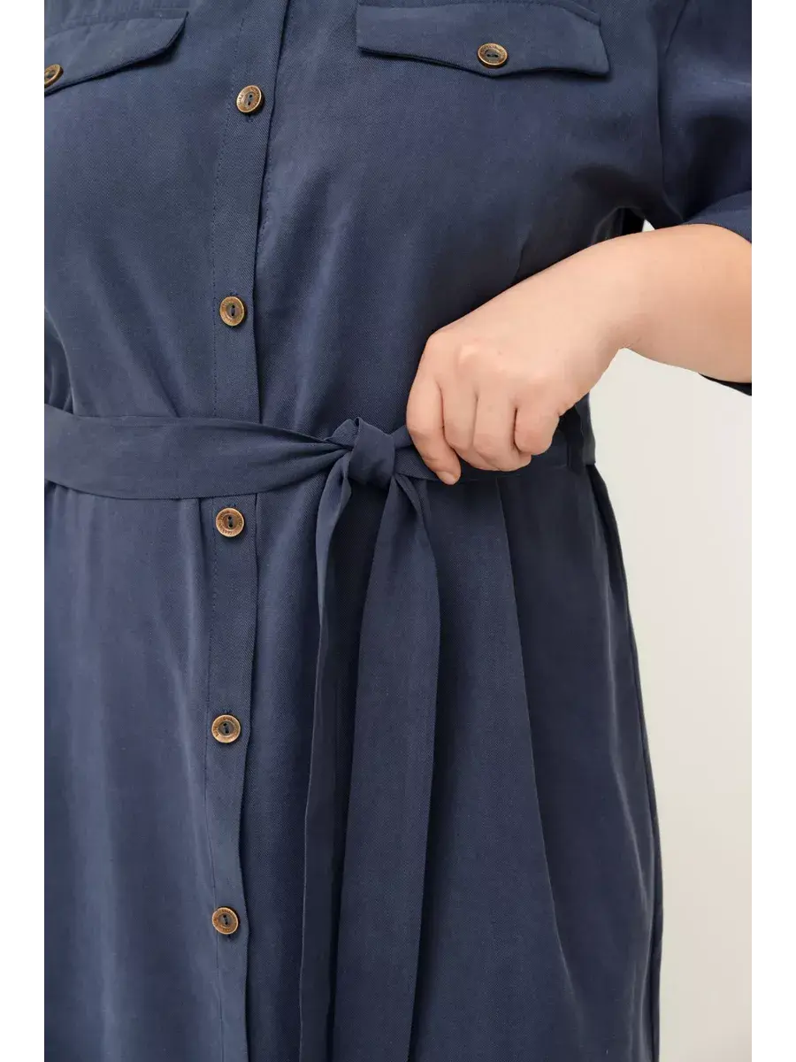 Повседневное женское платье больших размеров от бренда OLSI. Платье женское рубашечного фасона выполнено из мягкого приятного на ощупь текстильного полотна. Отложной воротник, рукав 3/4, по низу боковые разрезы для удобства. Пояс в комплекте с платьем. Длина рукава 45см.
