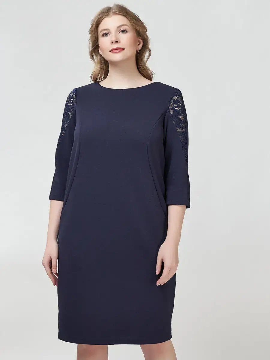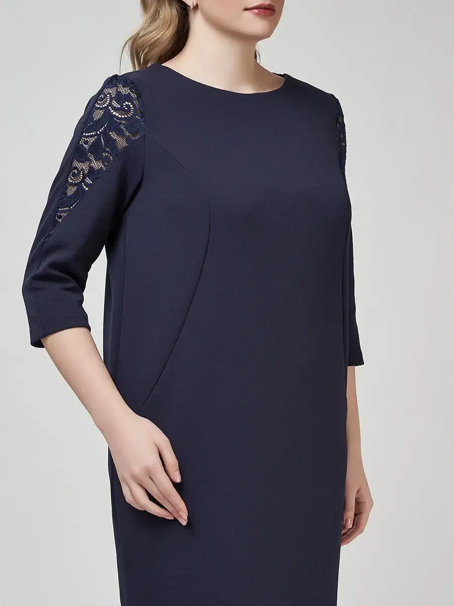Элегантное платье длиной до колен, чуть зауженное книзу. С гипюровыми V-образными вставками вверху спинки и поверху рукавов; круглым вырезом горловины; рукавами длиной 3/4.