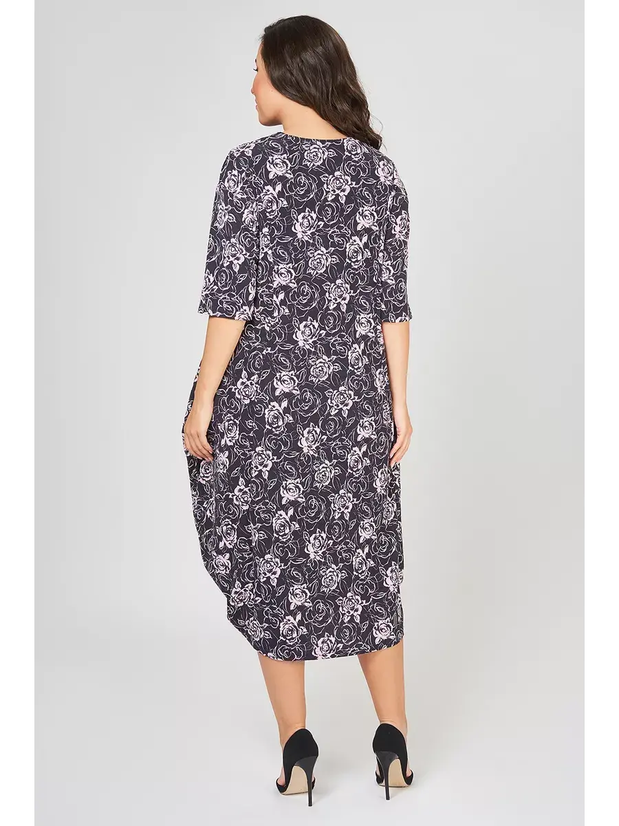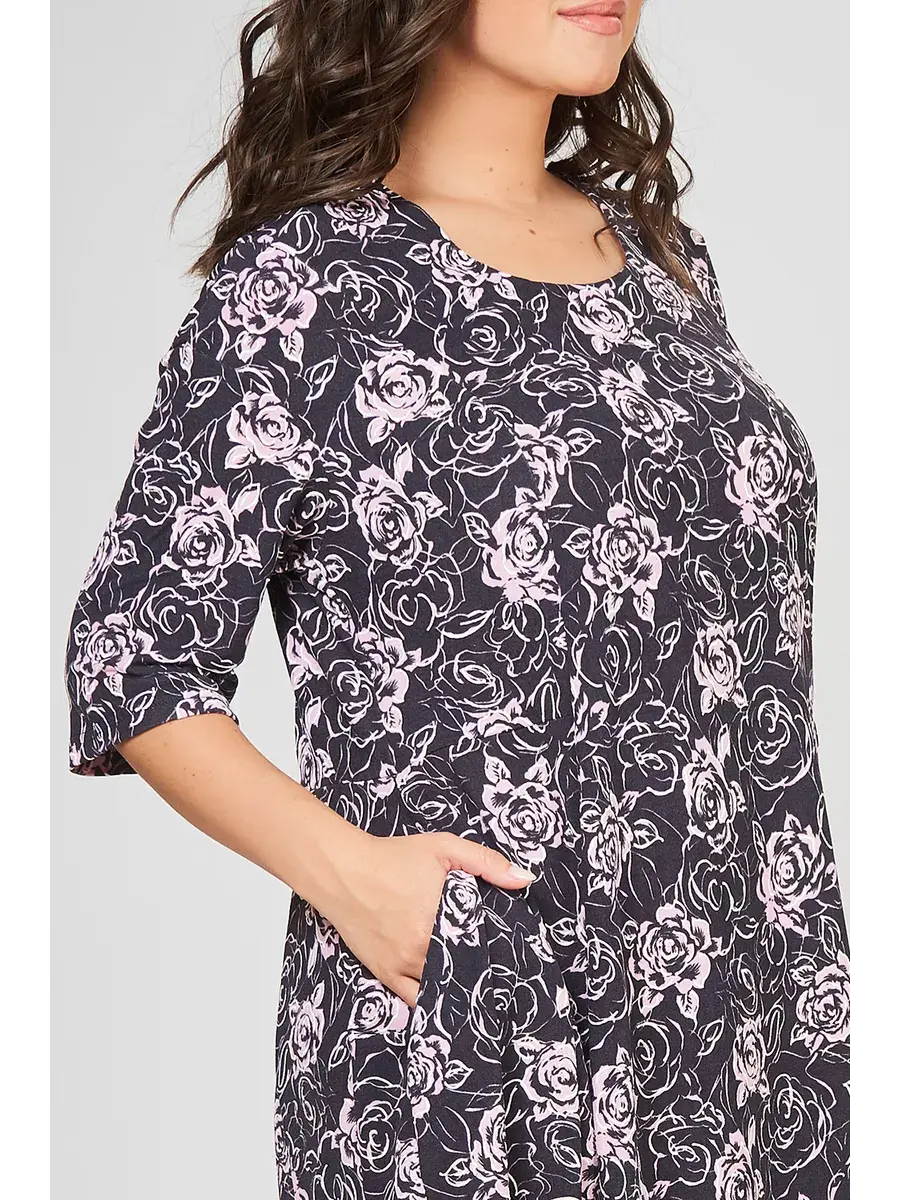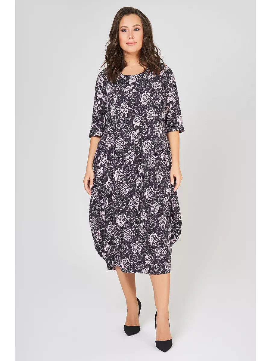 Стильное женское платье больших размеров от бренда OLSI. Повседневное женское платье-баллон длиной до середины голени из ткани с монохромным цветочным принтом, с глубоким круглым вырезом горловины, втачными рукавами 3/4, врезными боковыми карманами. Модель отрезная по талии, зауженная книзу, с защипами, создающими складки, благодаря которым ткань мягко струится, маскирует нюансы фигуры спереди.