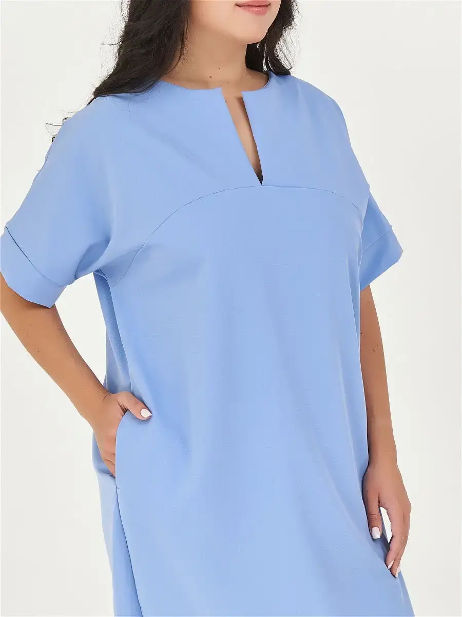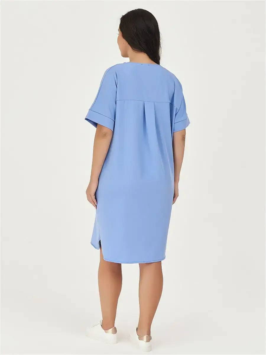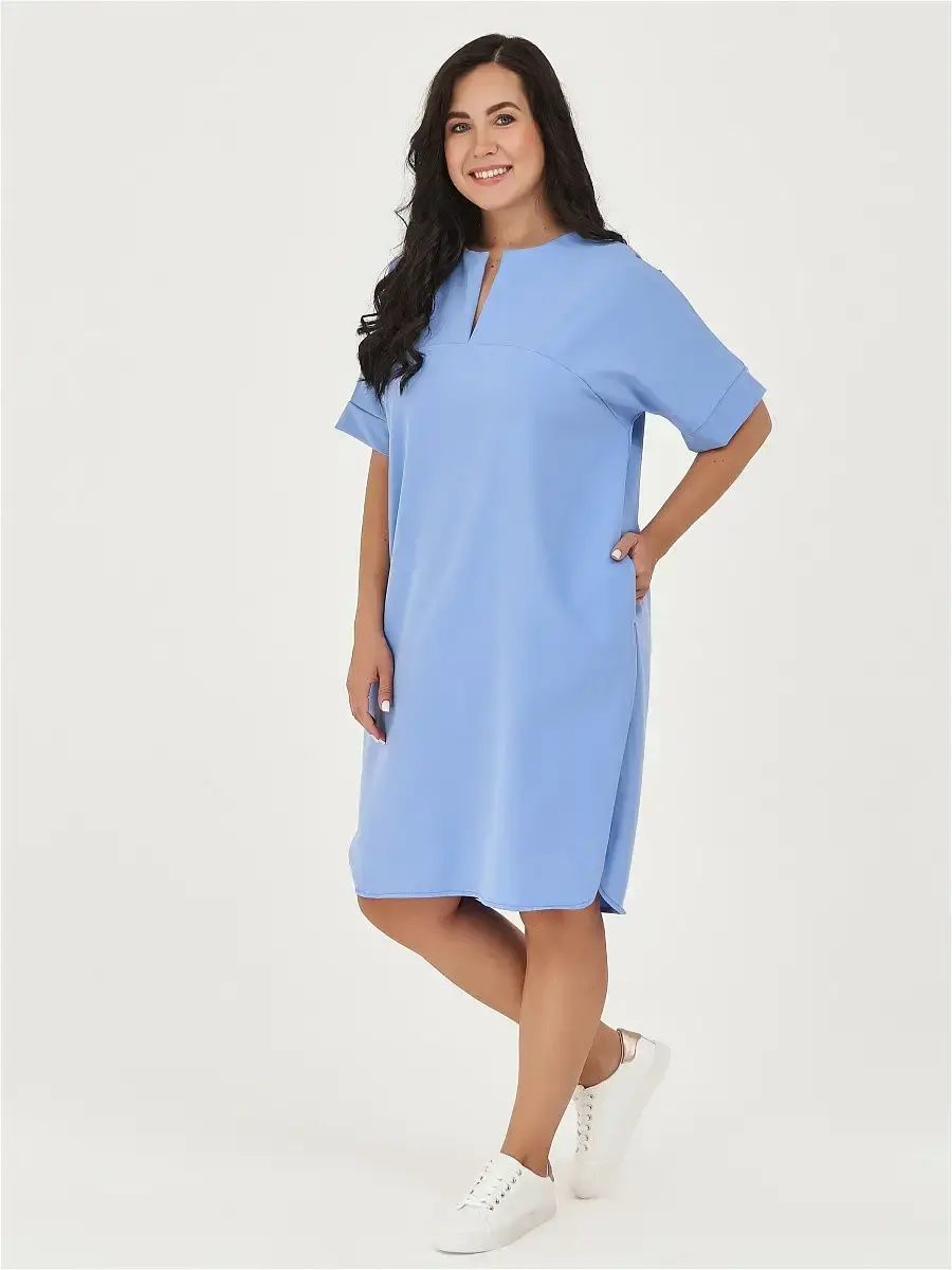 Платье больших размеров прямого силуэта, объёмной формы, из плотного текстильного полотна с добавлением эластана, кокетка на линии груди. Каманы в боковых швах. Рукав короткий цельнокроенный, с манжетой. Низ платья закругленный к боковым швам.