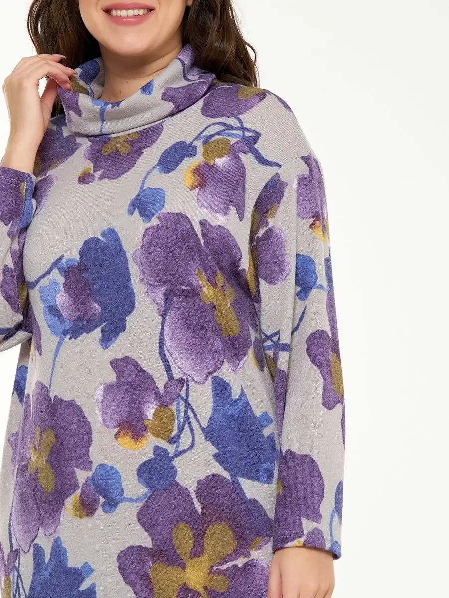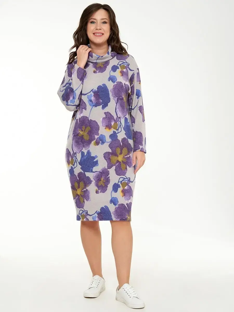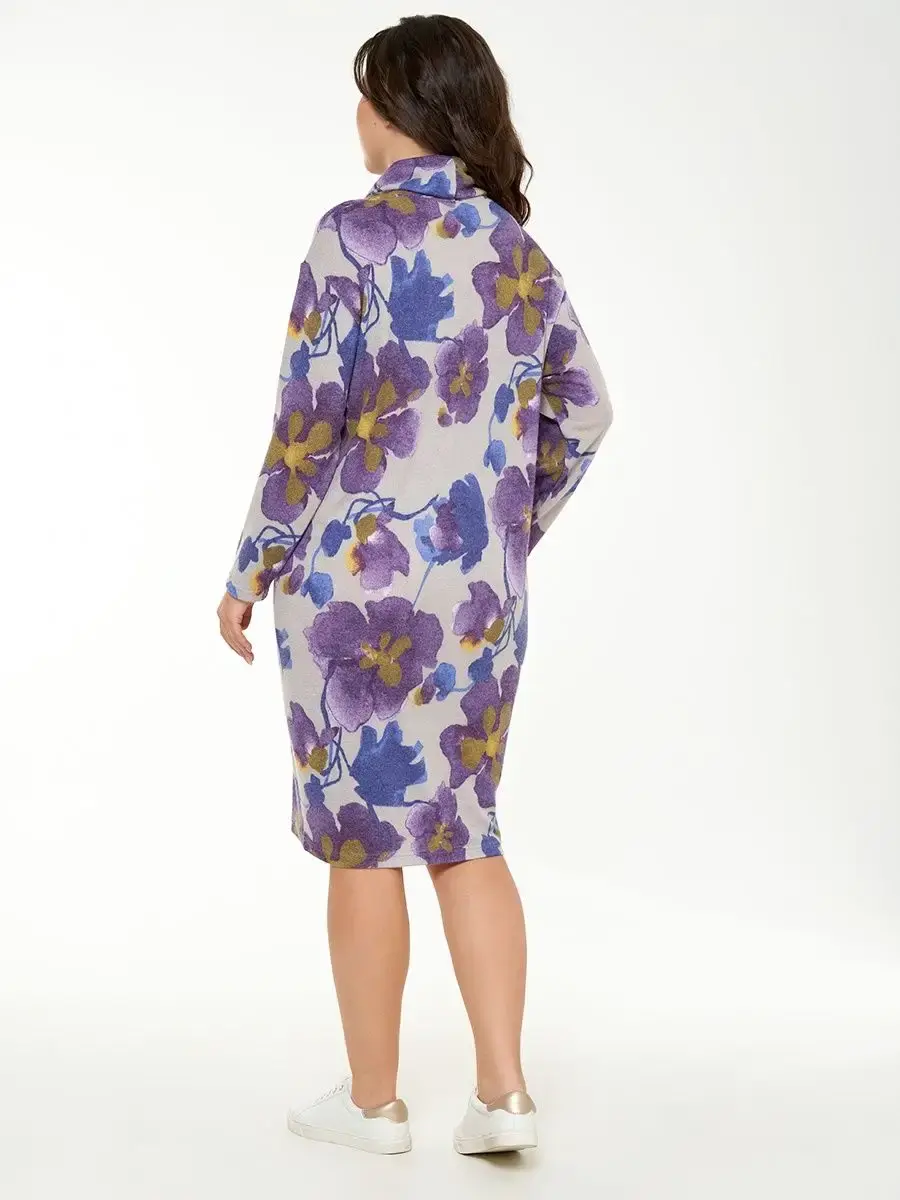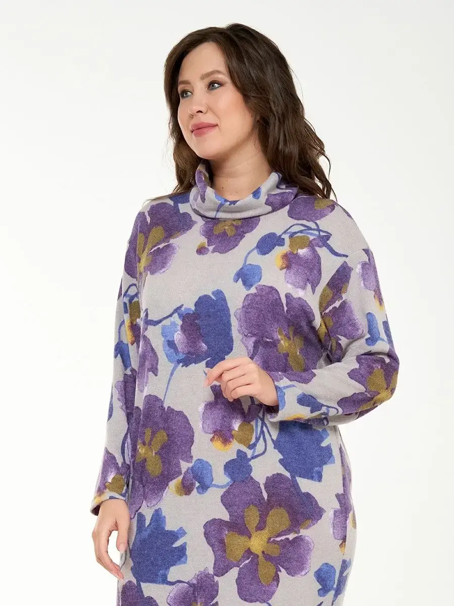 Вязаное платье женское больших размеров бренда OLSI свободного кроя со спущенным длинным рукавом. Воротник хомут. Платье женское мягкое и уютное, фиолетовый цвет. Без карманов. Длина изделия по спинке/ длина рукава соответственно:54-105см/51,4см