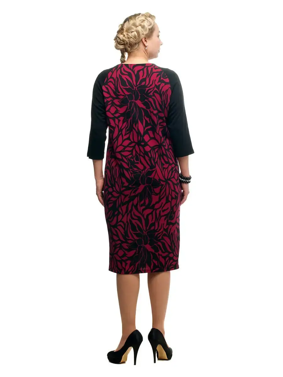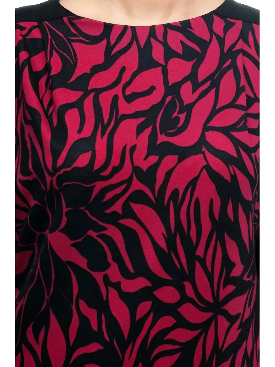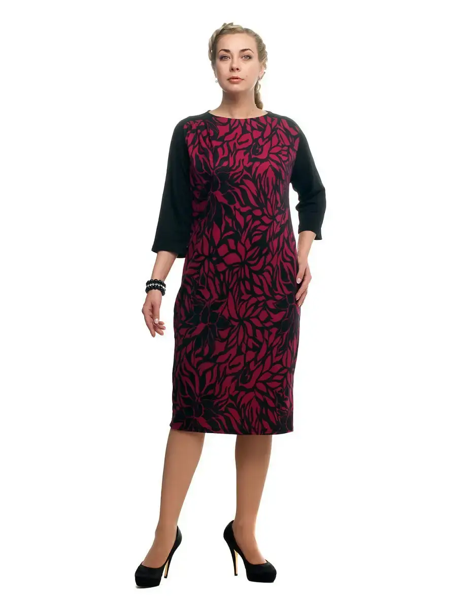 Стильное платье длиной чуть ниже колен, выполненное в ансамбле однотонной ткани и материала с монохромным растительным принтом, визуально напоминающее зауженный книзу, чуть приталенный сарафан, с вырезом горловины лодочка, надетый на темную блузку со спущенной проймой; свободными рукавами 3/4. Модель корректирует силуэт, не нарушая пропорций, защипы на одном плече едва заметно драпируют ткань, что позволяет нивелировать особенности фигуры спереди.