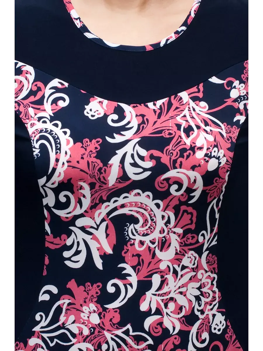 Стильное платье длиной до середины колен, выполненное из эластичного однотонного материала и эффектной ткани с монохромным принтом арабески. Модель полуприталенного кроя; с втачными рукавами 3/4; с круглым вырезом горловины. Спереди изделие с эффектом утягивания и формирования фигуры. За счет угловой кокетки и боковых вставок без рисунка, контрастирующих с принтом, силуэт визуально приближается к форме «песочные часы», выглядит значительно грациознее и тоньше