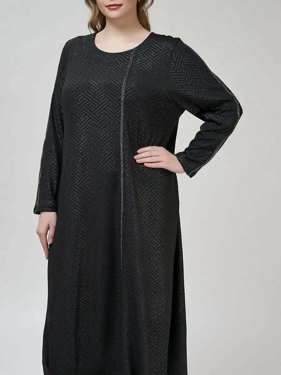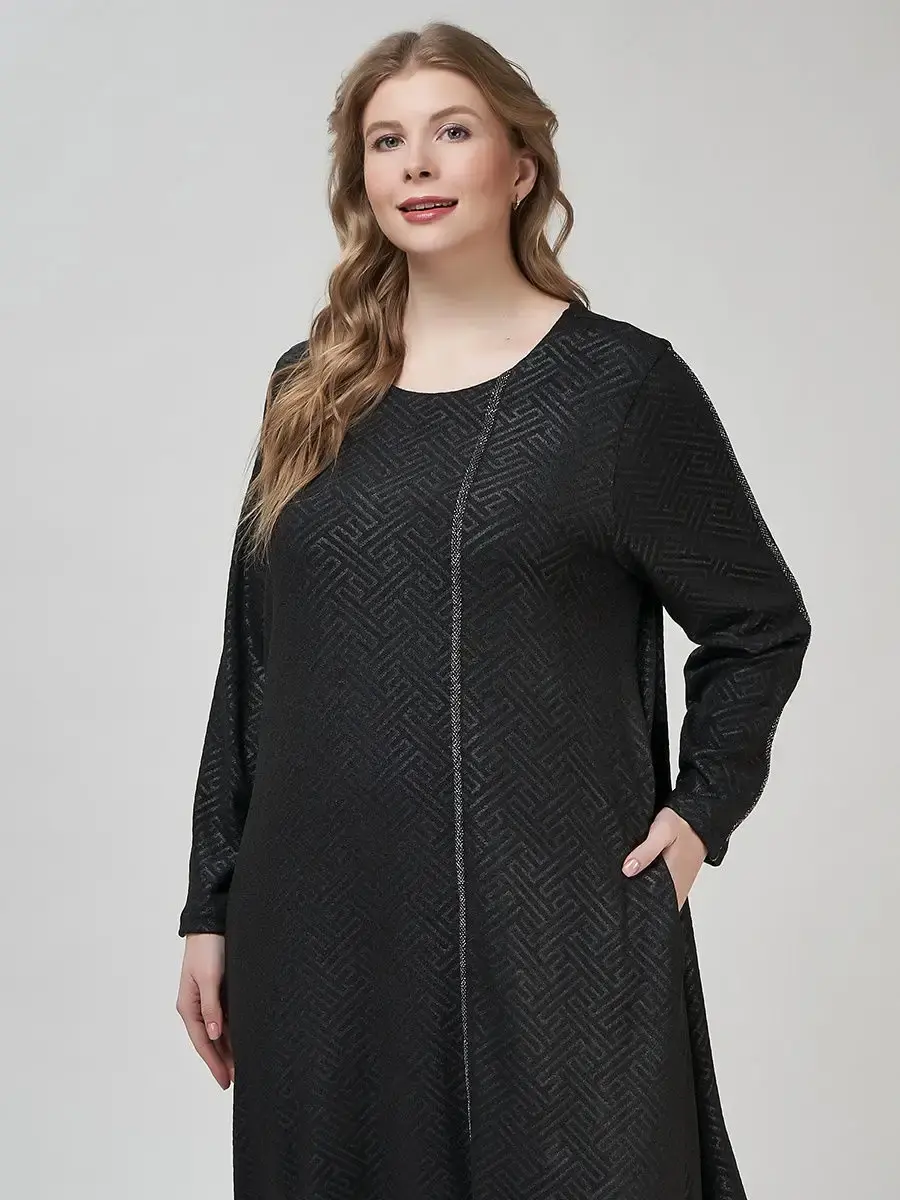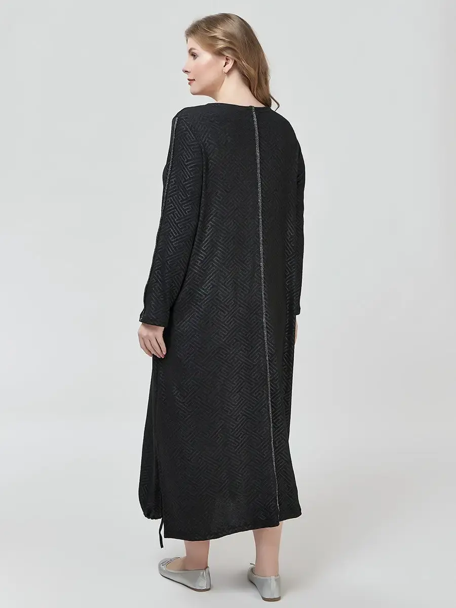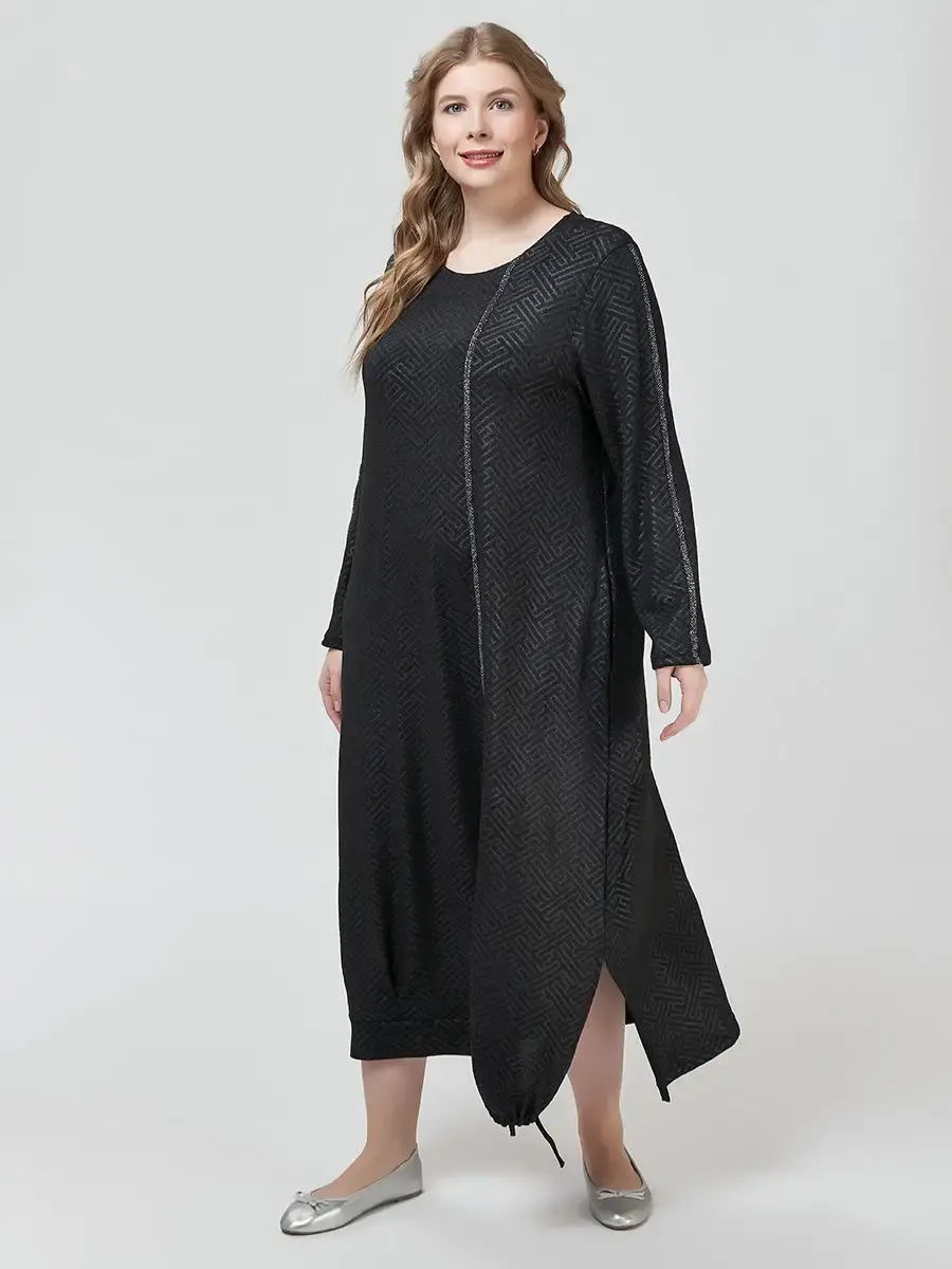 Ультрамодное длинное платье-бохо из трикотажа с блестящим геометрическим принтом, на манжете-кулиске с завязками и с конструктивными защипами по низу изделия, визуально суживающими силуэт. Модель с глубоким круглым вырезом, длинными втачными рукавами. Декорирована блестящим кантом-лампасом по рукаву и в виде боковой застежки по всей длине.