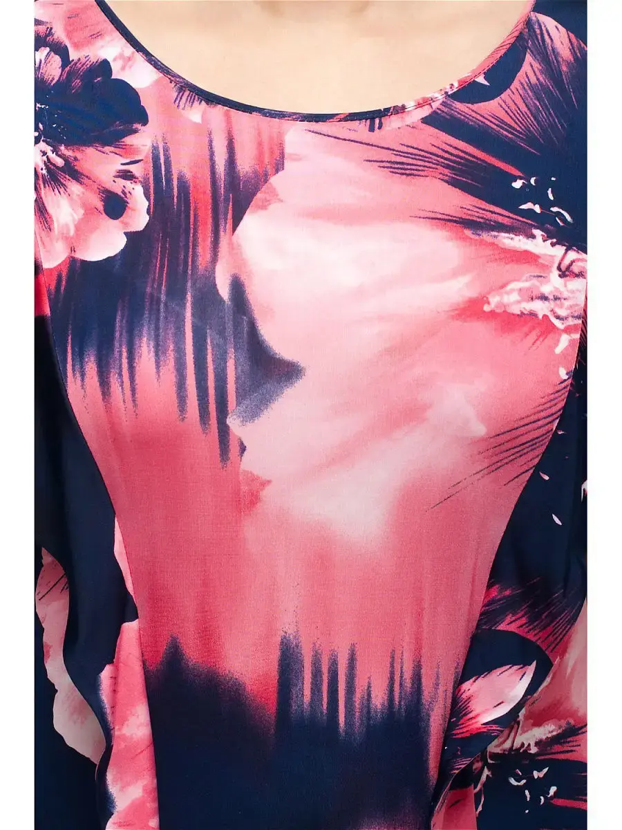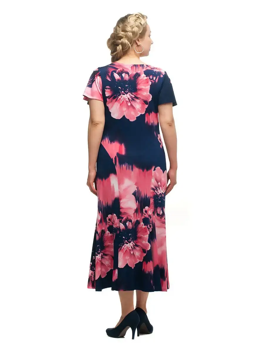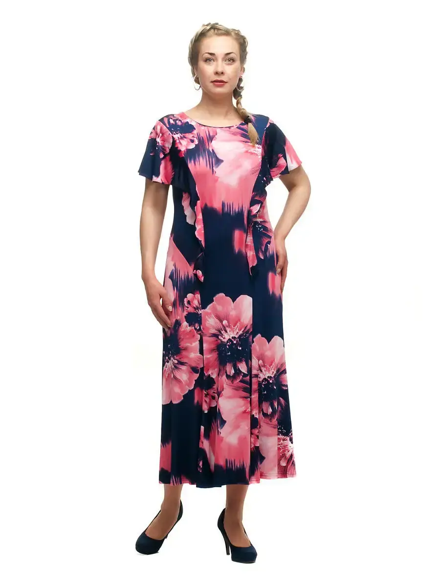 Эффектное платье длиной миди из струящейся ткани с крупным цветочным принтом. Модель полуприлегающего силуэта; с расклешенной книзу юбкой; с глубоким круглым вырезом горловины, короткими рукавами с оборкой, плавно перетекающей в оборку по средним швам полочек. Крой изделия спереди создает оптический эффект фигуры песочные часы. Уравновешивает и корректирует пропорции. Изделие придает плавность движениям, придает образу чувственность и женственность.