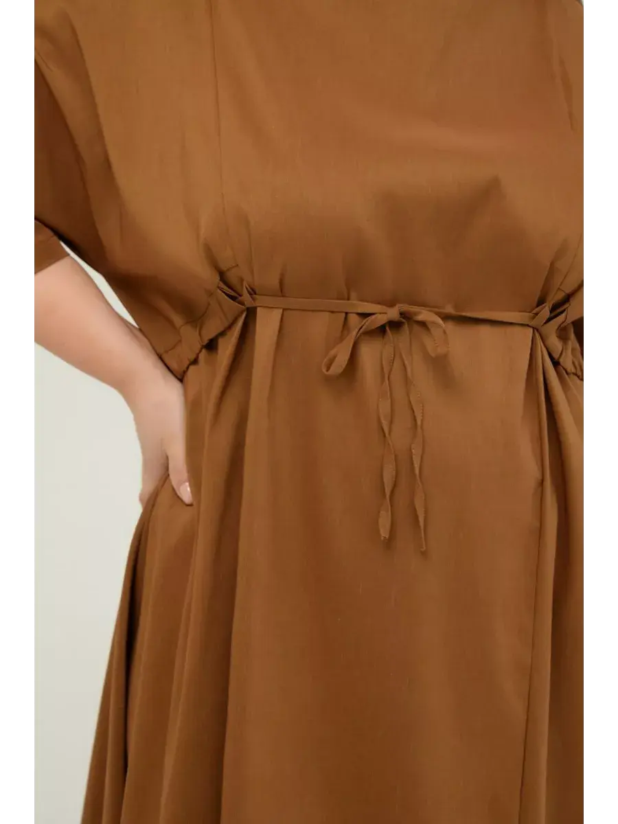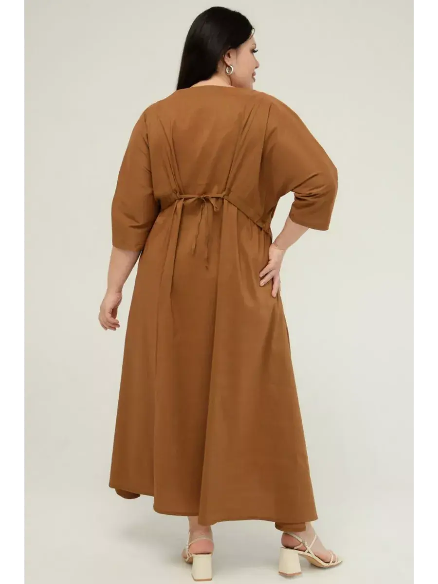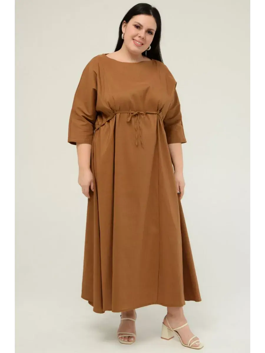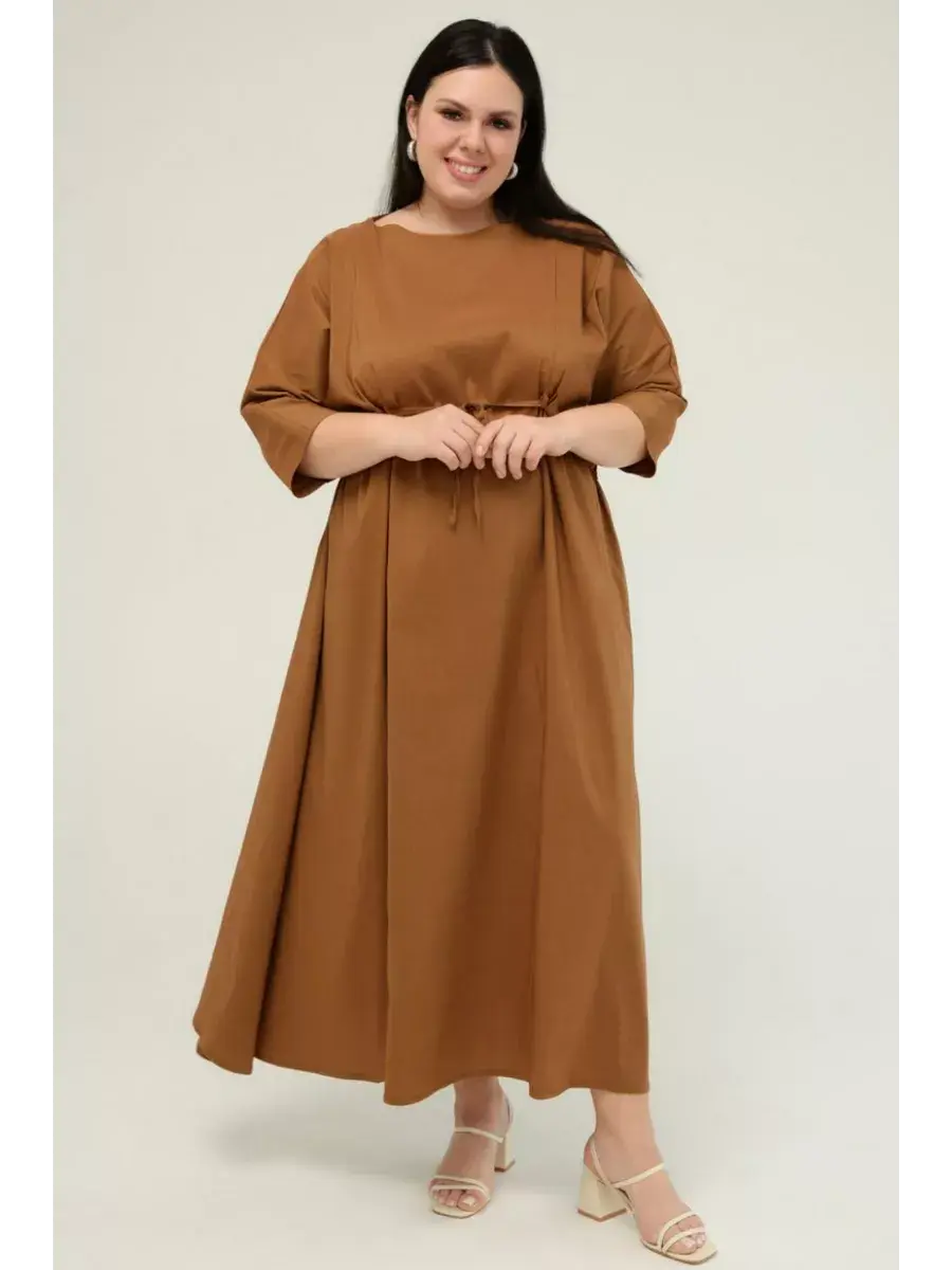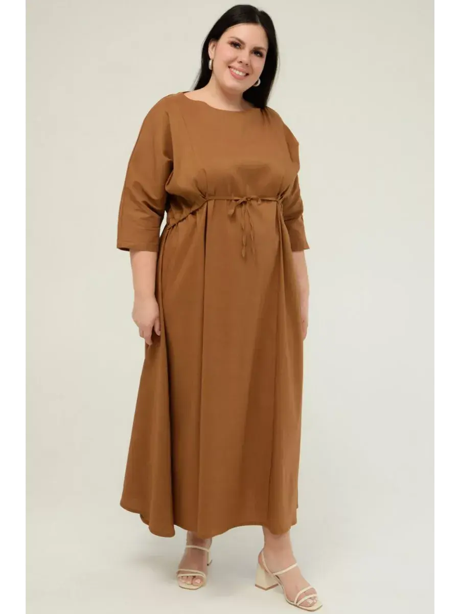 Повседневное женское платье больших размеров от бренда OLSI выполнено из хлопкового текстильного полотна с эластаном, свободного кроя. Силуэт платья можно регулировать завязками, продетыми в кулиску. Кулиска платья спереди и сзади выполнена под углом. Женское платье длинное без карманов. Рукав цельнокроенный, широкий и свободный, длиной 3/4. Длина по спинке/ширина по груди/ширина низ соответственно:
