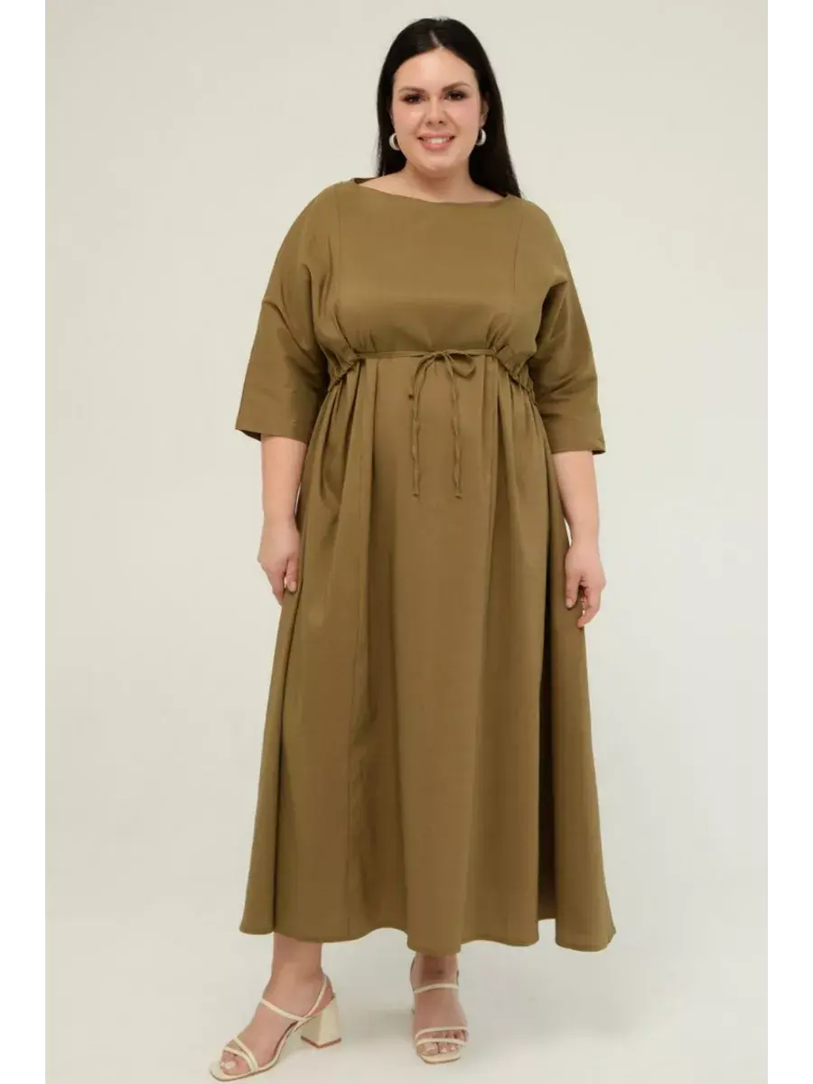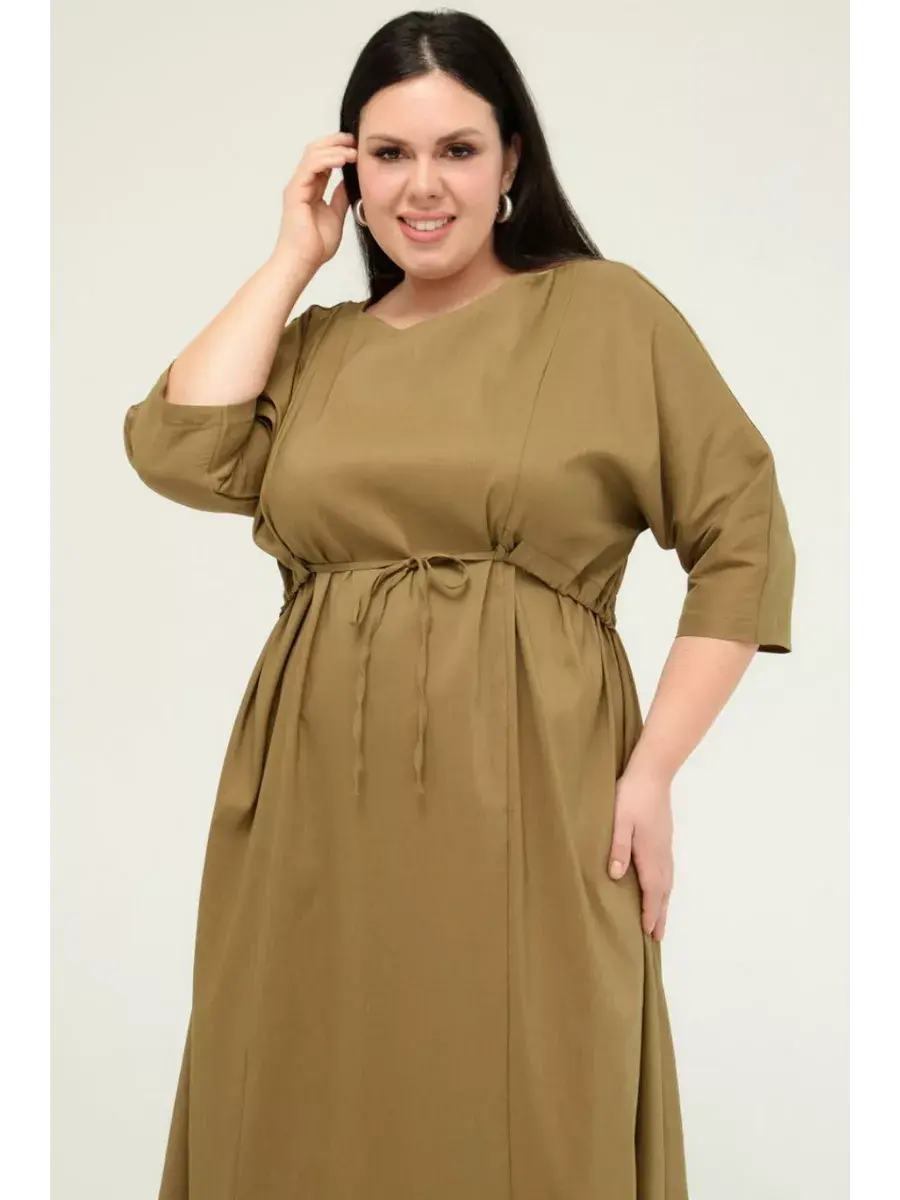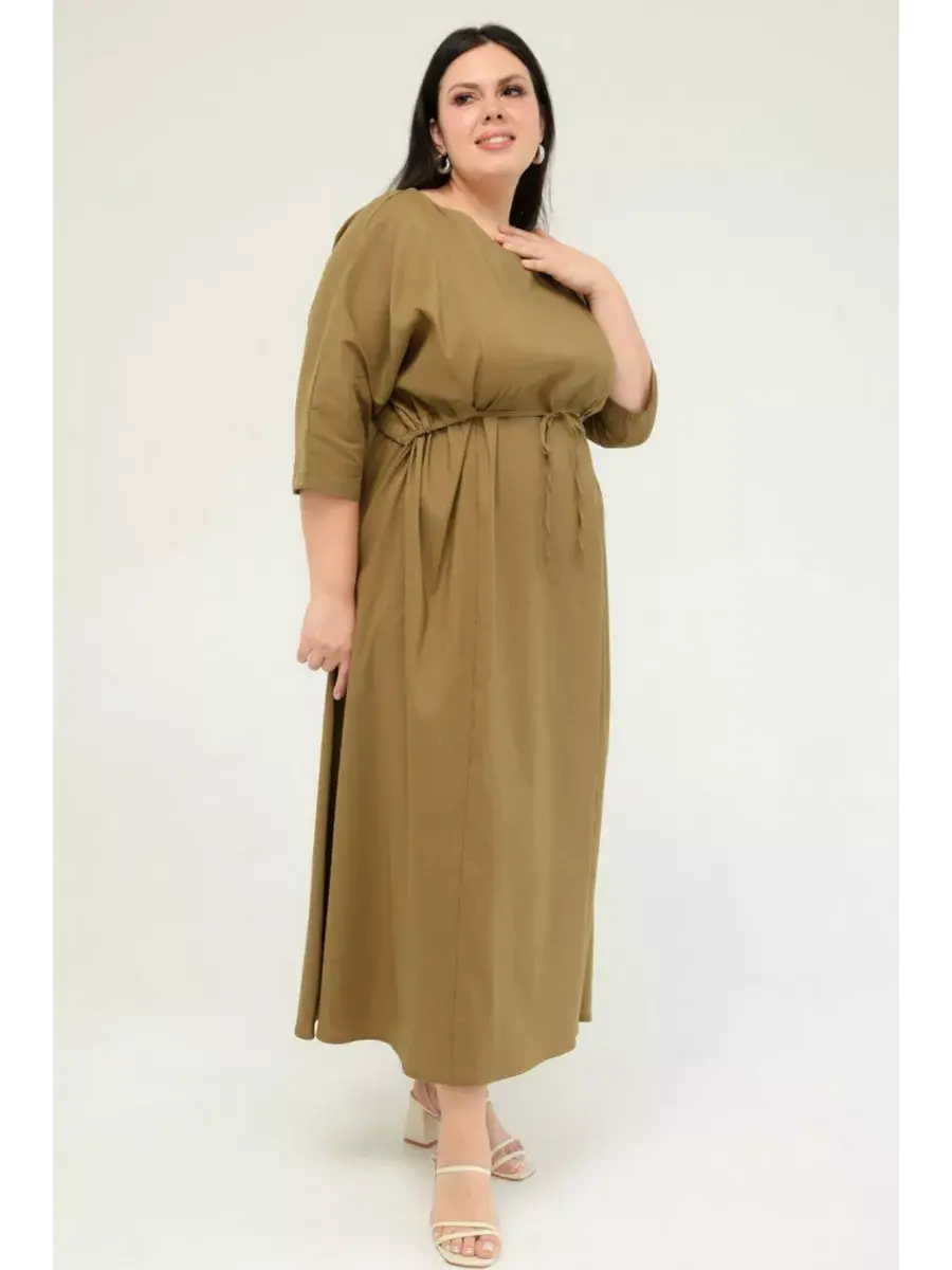Повседневное женское платье больших размеров от бренда OLSI выполнено из хлопкового текстильного полотна с эластаном, свободного кроя. Силуэт платья можно регулировать завязками, продетыми в кулиску. Кулиска платья спереди и сзади выполнена под углом. Женское платье длинное без карманов. Рукав цельнокроенный, широкий и свободный, длиной 3/4. Длина по спинке/ширина по груди/ширина низ соответственно: