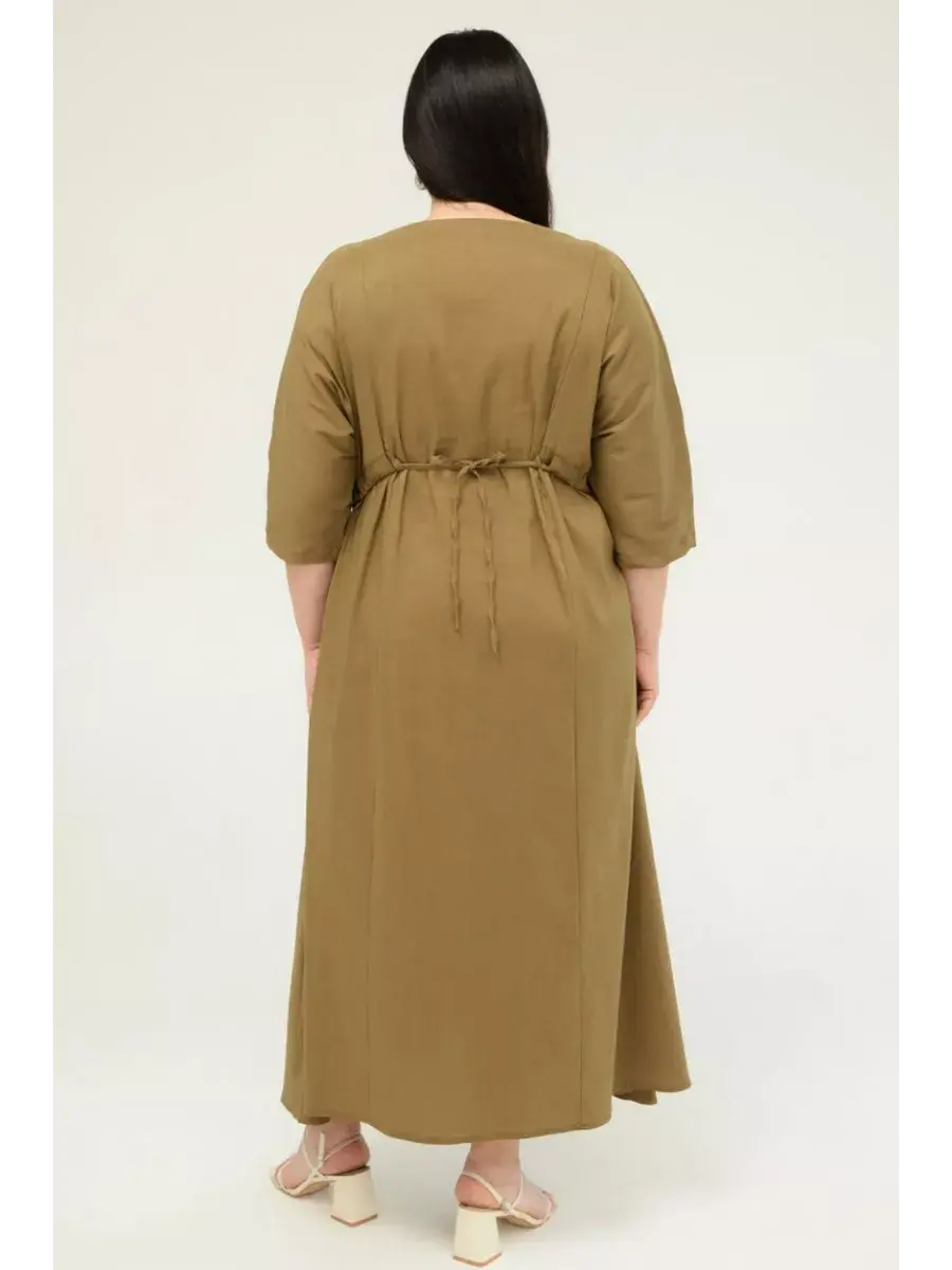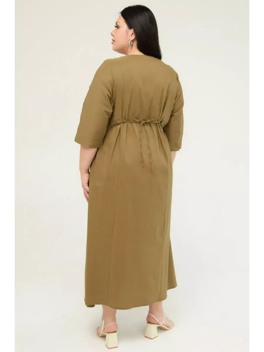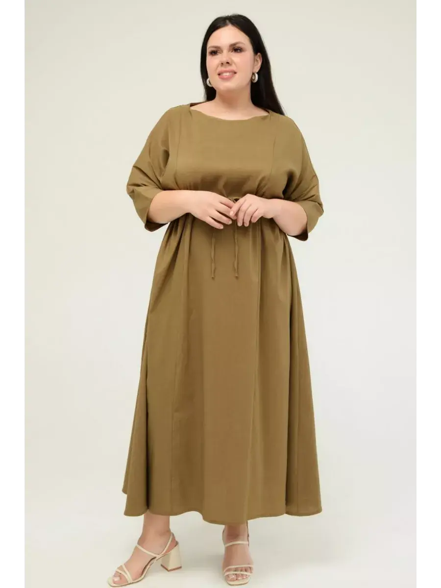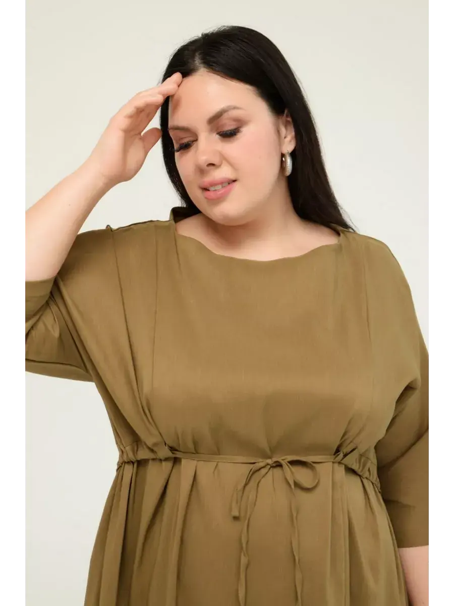 Повседневное женское платье больших размеров от бренда OLSI выполнено из хлопкового текстильного полотна с эластаном, свободного кроя. Силуэт платья можно регулировать завязками, продетыми в кулиску. Кулиска платья спереди и сзади выполнена под углом. Женское платье длинное без карманов. Рукав цельнокроенный, широкий и свободный, длиной 3/4. Длина по спинке/ширина по груди/ширина низ соответственно: