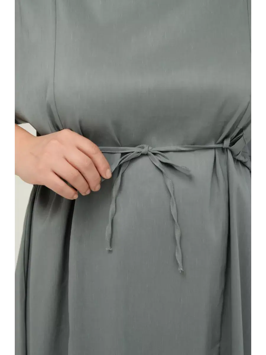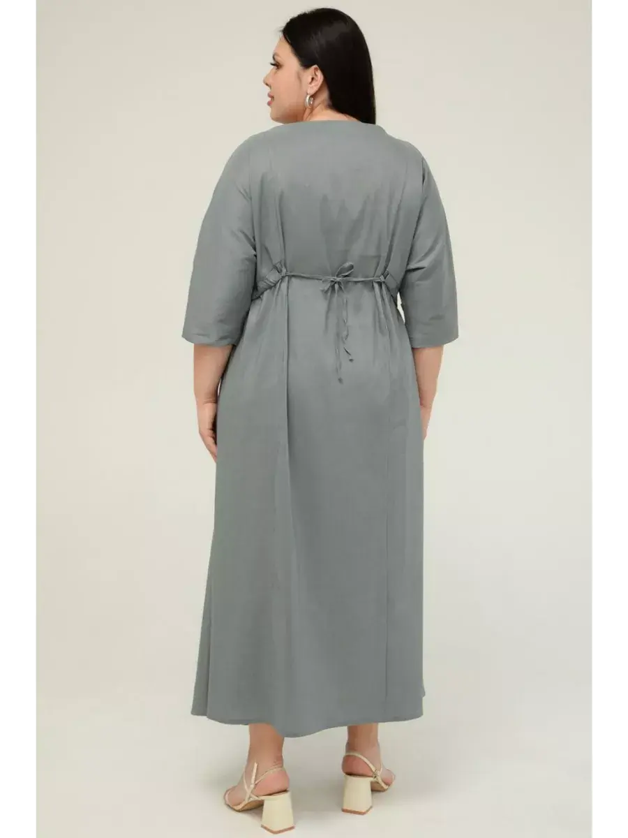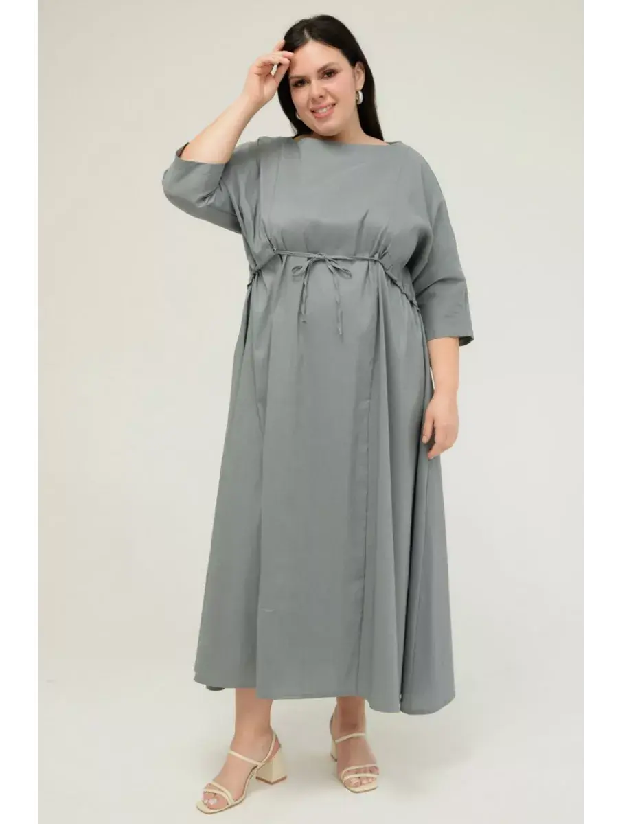 Повседневное женское платье больших размеров от бренда OLSI выполнено из хлопкового текстильного полотна с эластаном, свободного кроя. Силуэт платья можно регулировать завязками, продетыми в кулиску. Кулиска платья спереди и сзади выполнена под углом. Женское платье длинное без карманов. Рукав цельнокроенный, широкий и свободный, длиной 3/4. Длина по спинке/ширина по груди/ширина низ соответственно: