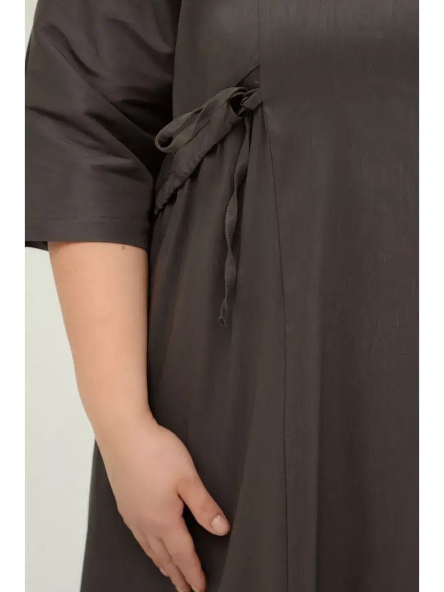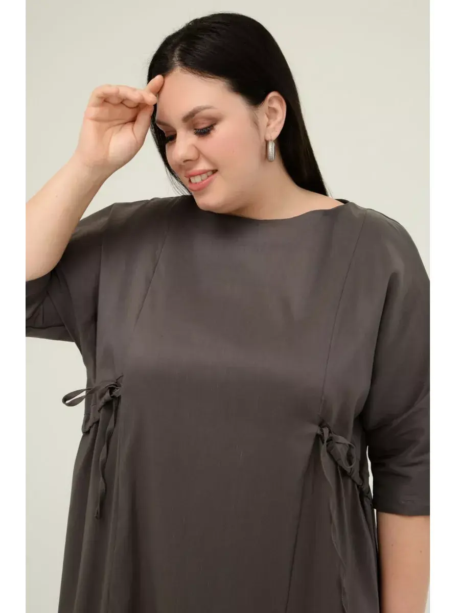 Повседневное женское платье больших размеров от бренда OLSI выполнено из хлопкового текстильного полотна с эластаном, свободного кроя. Силуэт платья можно регулировать завязками, продетыми в кулиску. Кулиска платья спереди и сзади выполнена под углом. Женское платье длинное без карманов. Рукав цельнокроенный, широкий и свободный, длиной 3/4. Длина по спинке/ширина по груди/ширина низ соответственно: