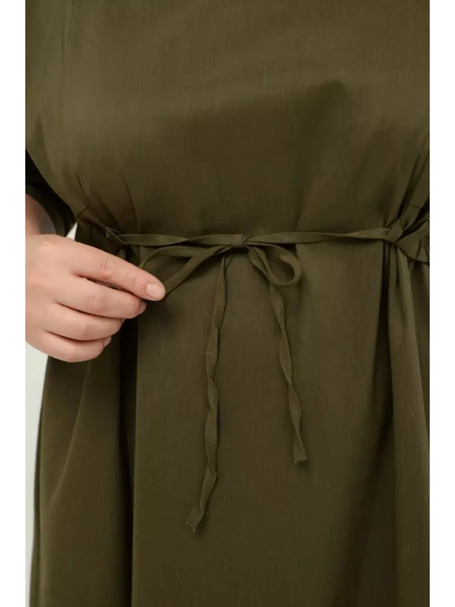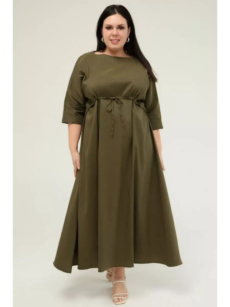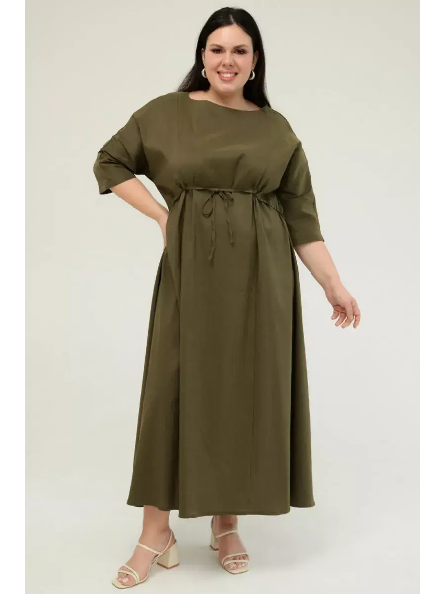 Повседневное женское платье больших размеров от бренда OLSI выполнено из хлопкового текстильного полотна с эластаном, свободного кроя. Силуэт платья можно регулировать завязками, продетыми в кулиску. Кулиска платья спереди и сзади выполнена под углом. Женское платье длинное без карманов. Рукав цельнокроенный, широкий и свободный, длиной 3/4. Длина по спинке/ширина по груди/ширина низ соответственно: