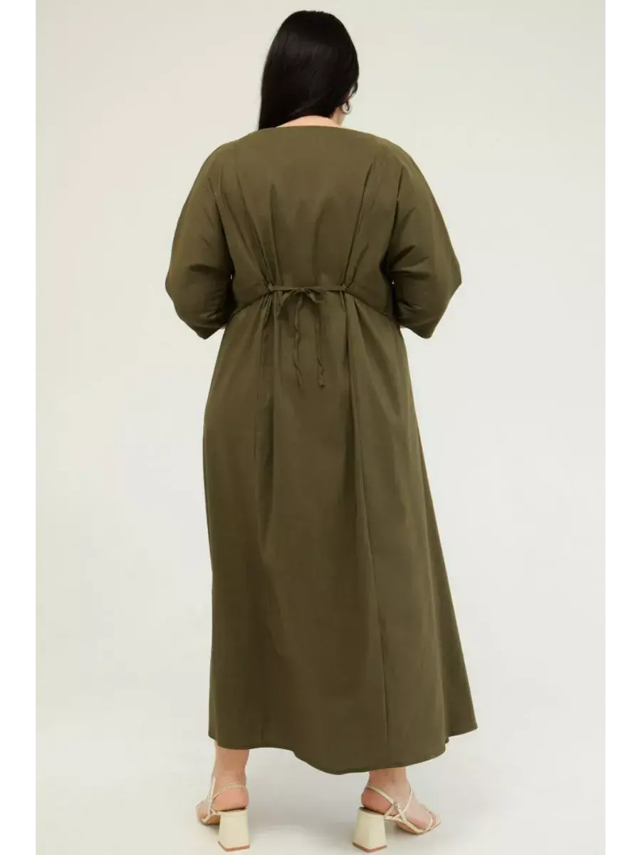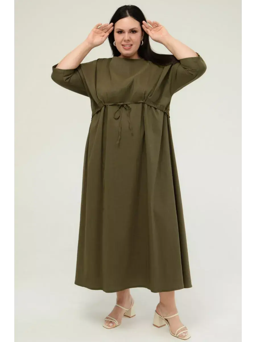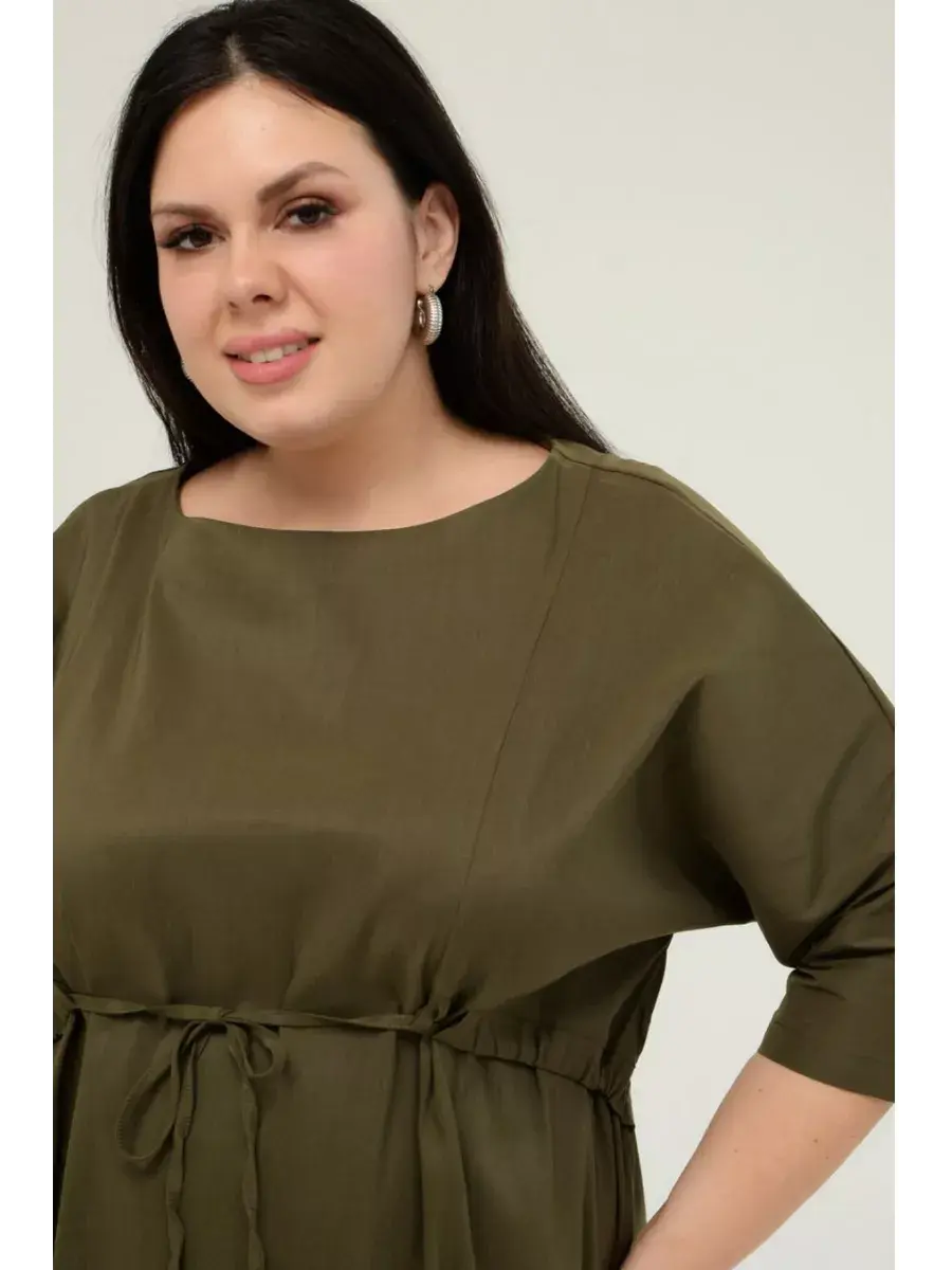 Повседневное женское платье больших размеров от бренда OLSI выполнено из хлопкового текстильного полотна с эластаном, свободного кроя. Силуэт платья можно регулировать завязками, продетыми в кулиску. Кулиска платья спереди и сзади выполнена под углом. Женское платье длинное без карманов. Рукав цельнокроенный, широкий и свободный, длиной 3/4. Длина по спинке/ширина по груди/ширина низ соответственно:
