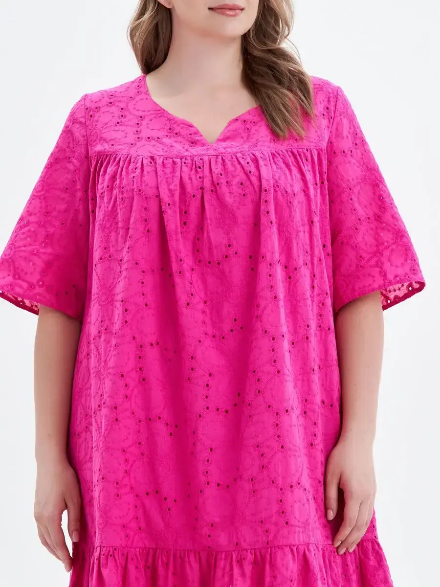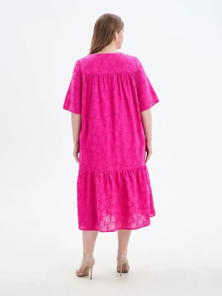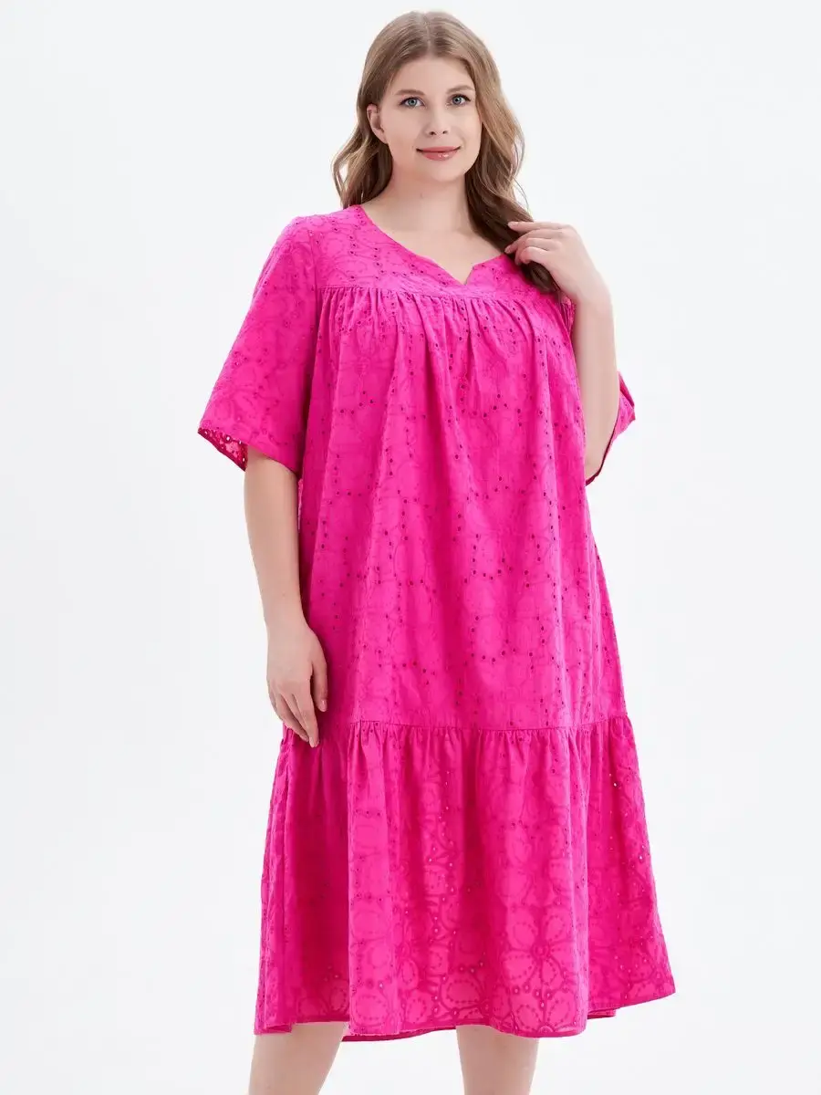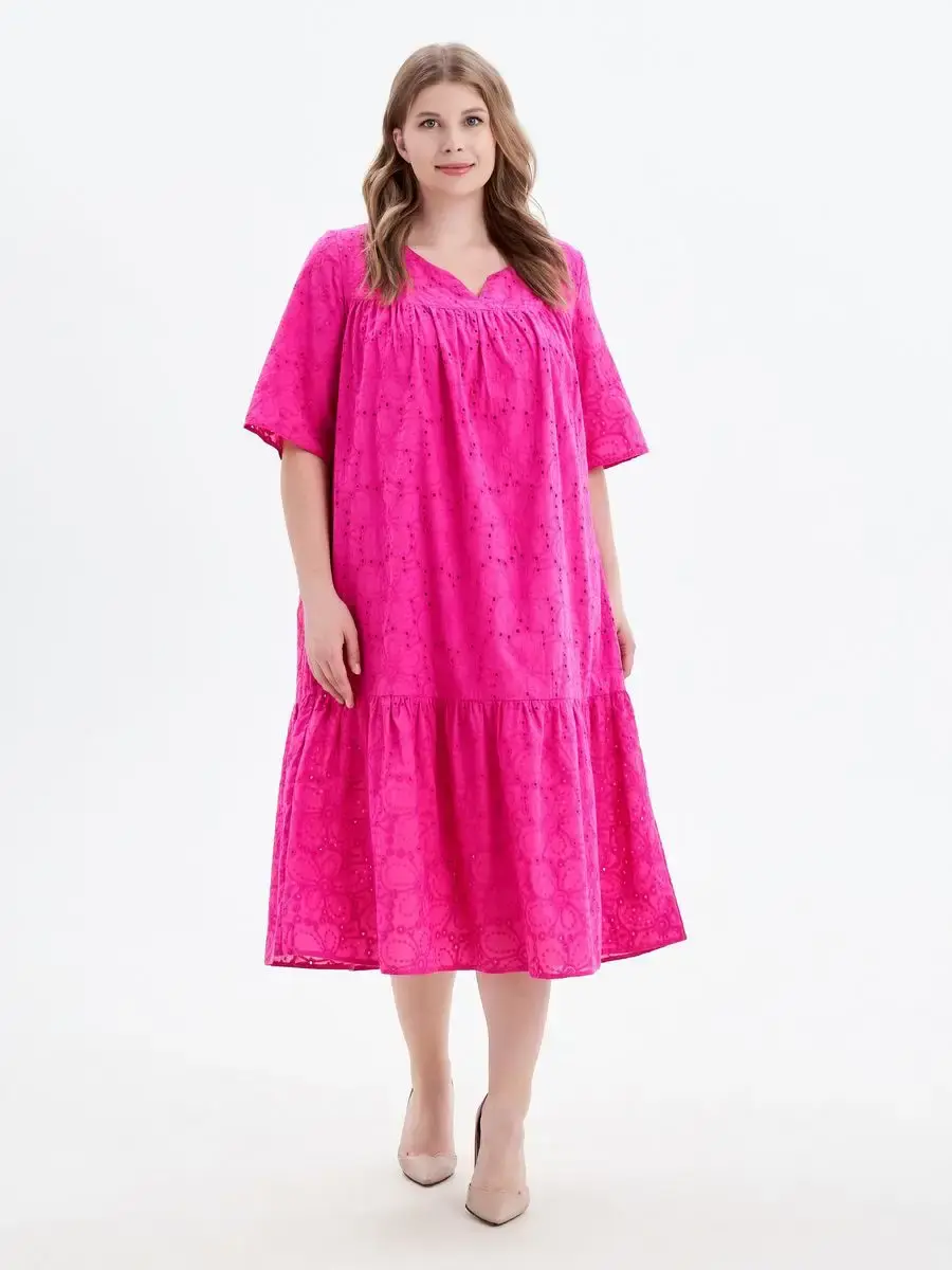 Женское летнее платье больших размеров бренда OLSI, выполнено из натурального материала 100% хлопок. Легкое, яркое и воздушное платье, хорошо дышит в жаркую погоду. Платье свободного силуэта в стиле бохо, расширено к низу, длиной ниже уровня колен. Модель платья с фигурной горловиной, кокетки спереди и сзади. Кружевное длинное платье цвета фуксия идеально сидит по женской фигуре, подчеркивает достоинства и скрывает недостатки. Элегантные вечерние красивые платья в цветочных и нежных оттенках идеально подходят для повседневного делового стиля для офиса, вечерней моды для работы или праздников, вечеринок, свиданий, свадеб, дней рождения, фотосессий, юбилеев. торжеств, корпоративных мероприятий, а также для беременных женщин. Модные макси подходят для девушек любой фигуры, стройных и полных, а также для любого возраста. Данную модель можно носить как летом, так и весной. Идеальное коктейльное платье с юбкой солнце в пол непрозрачном придаст кокетливый и игривый оттенок повседневными праздничным образам. Ткань дышащая, высокого качества, не теряет яркости и не деформируется после стирки. Это красивое платье из ткани с вышивкой Ришелье можно одеть на выпускной. Женские платья с ришелье, одежда женская свободного кроя. Платье летние хорошо сидит на любой фигуре. Рост модели 173 см.