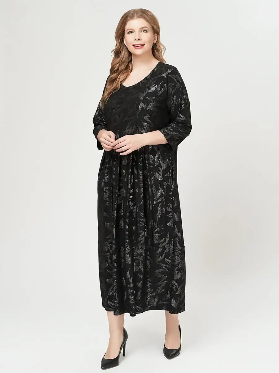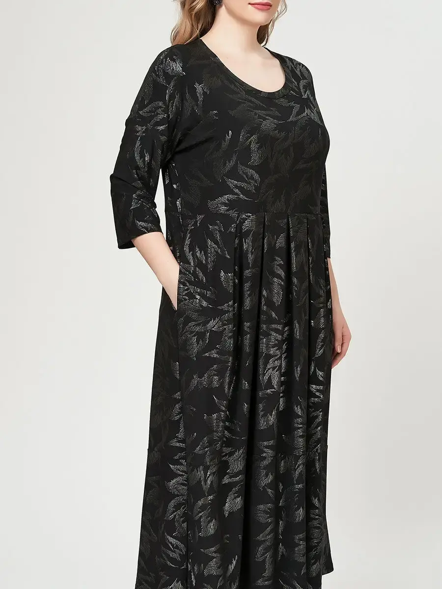 Нарядное платье из струящегося трикотажа - масло с блестящим принтом. Модель миди-длины, с округлым глубоким вырезом, втачными рукавами 3/4 со спущенной проймой и мягкой линией плеча, врезными боковыми карманами. Отрезная, выше линии талии, юбка с защипами, создающими крупную складку спереди, и прямая сзади.