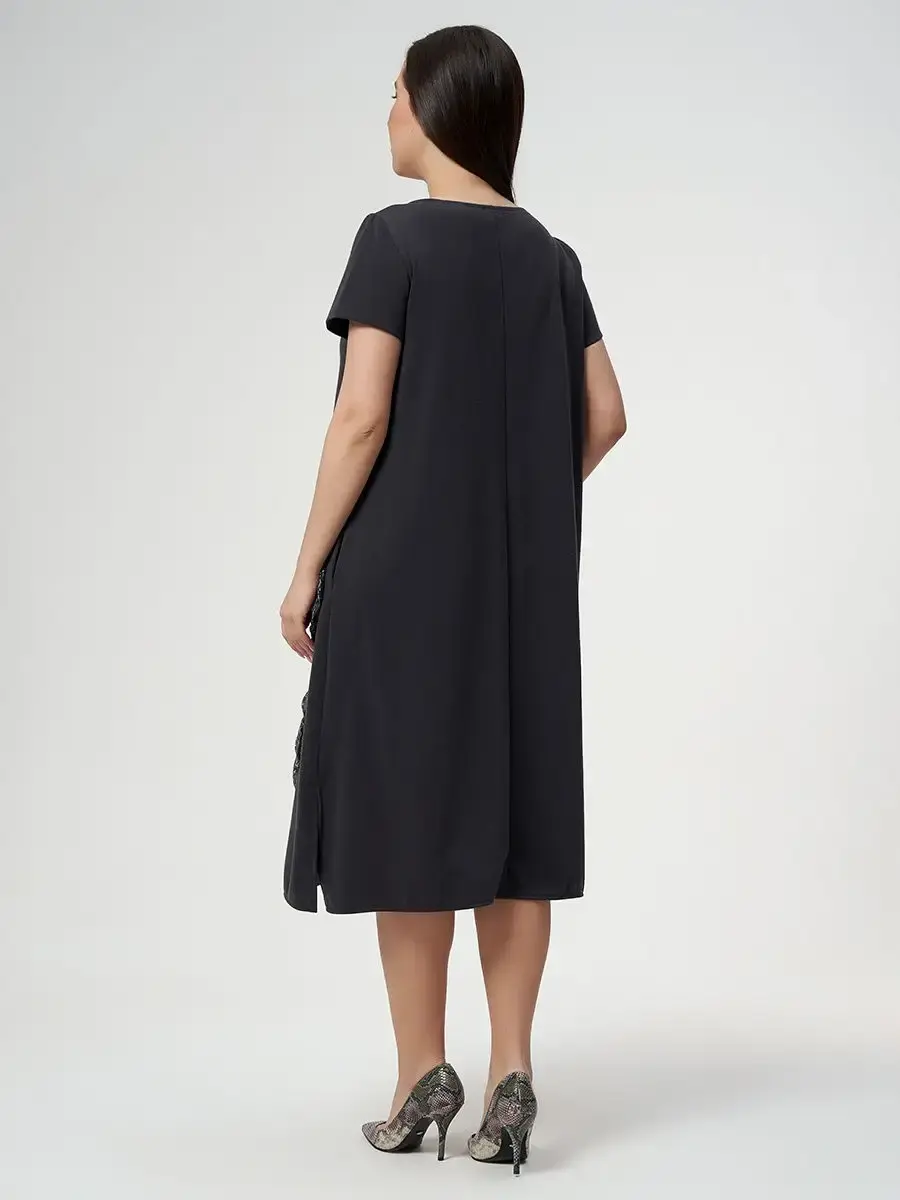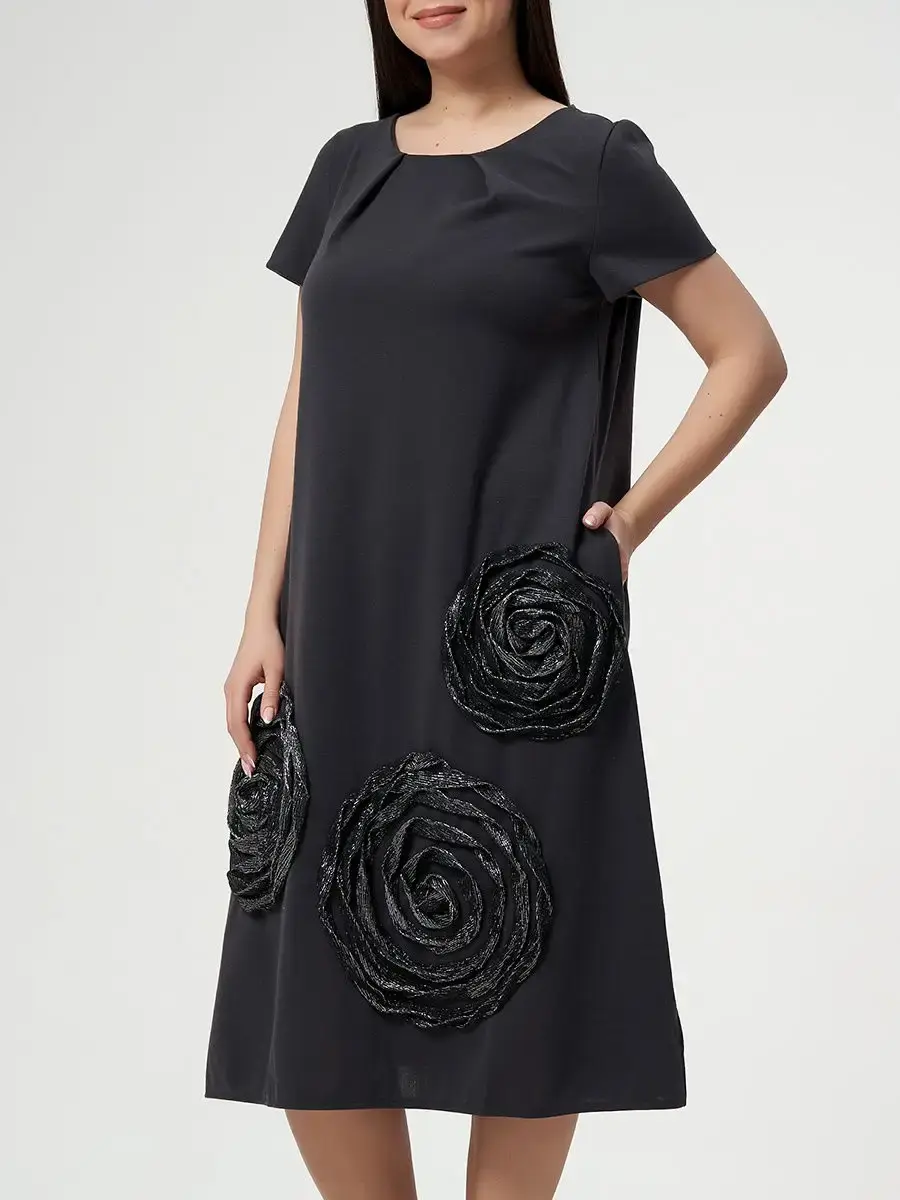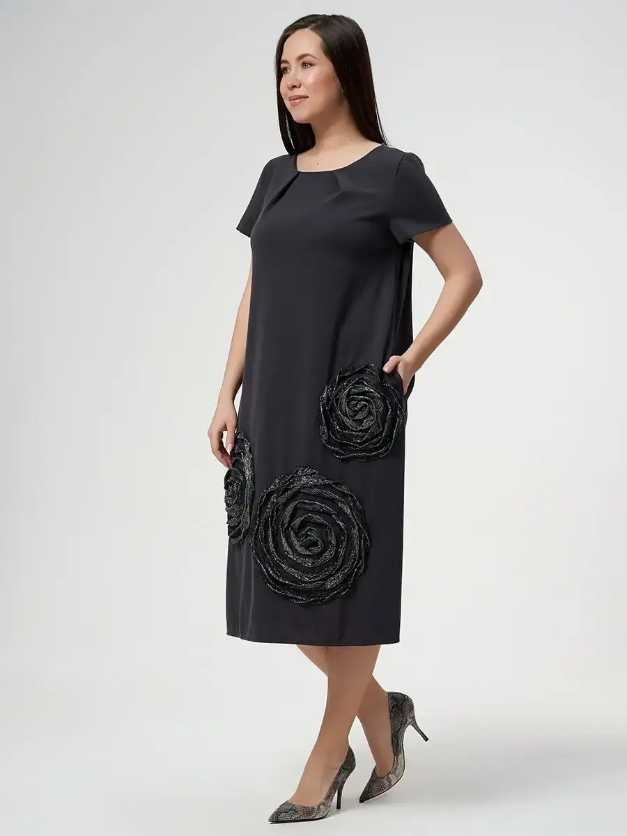 Платье женское свободного кроя больших размеров из плотного трикотажного полотна, с карманами в боковых швах, и декорировано розой из ткани с люрексом. Длина изделия по спинке от 112см в р.48 до 116,5см в р.66.