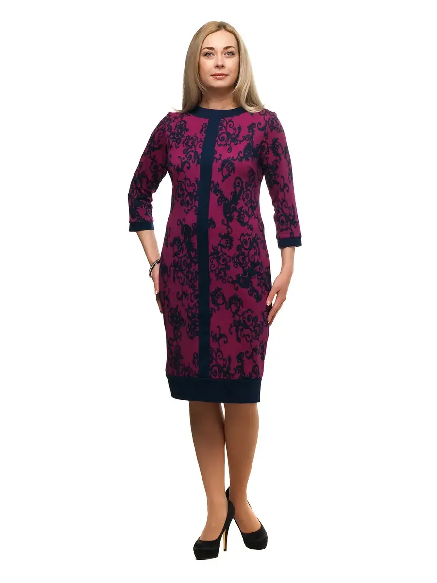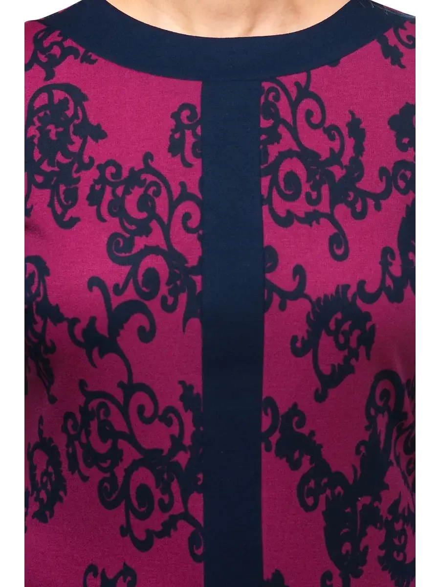 Эффектное платье длиной чуть ниже колен, из тонкого нежного трикотажа с классическим принтом арабески. Модель полуприлегающего силуэта, зауженная книзу с помощью манжета из однотонной ткани, перекликающегося с вертикальной вставкой спереди изделия, манжетами на втачных рукавах 3/4 и окантовкой горловины лодочка. Простые чистые линии уравновешивают пропорции, придают силуэту подтянутость и стройность. Платье элегантное и уютное одновременно.