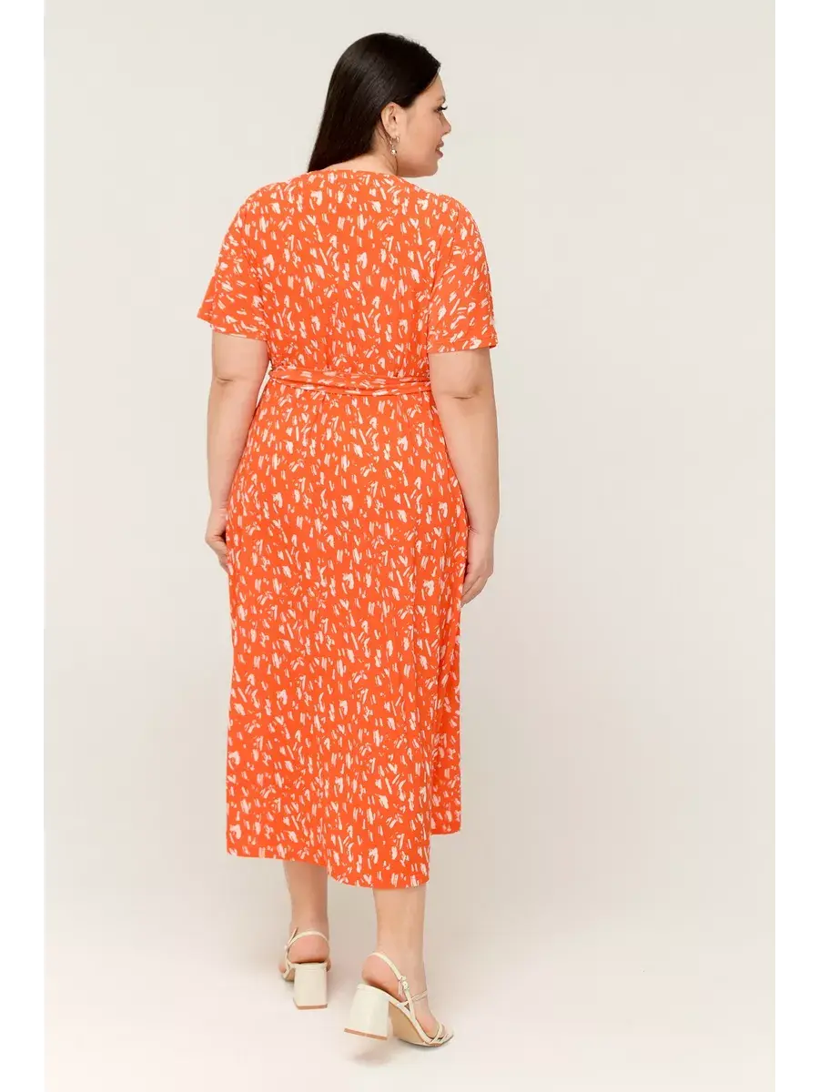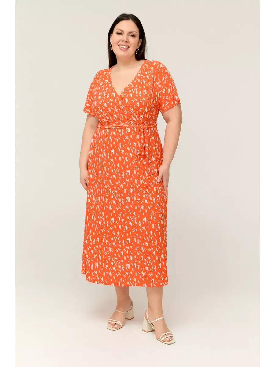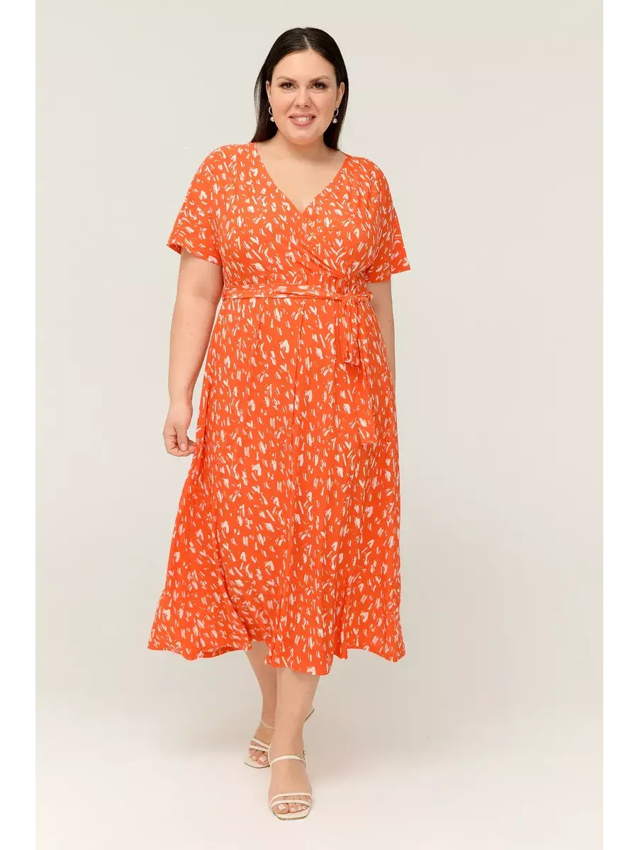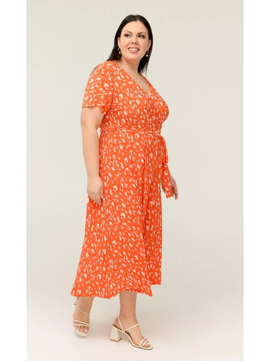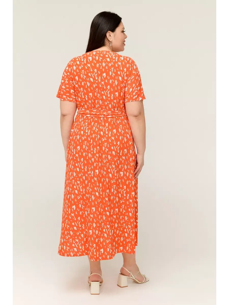 Женское платье больших размеров от бренда OLSI выполнено из трикотажного полотна масло - ткань струится, не мнется, холодит кожу в жаркую погоду. Платье летнее длиной миди. Платье женское больших размеров имеет приталенный фасон с расклешенной юбкой, талия слегка завышена. Горловина платья представляет собой V-образное декольте (конверт). Рукава цельнокроенные. Длина платья миди.
