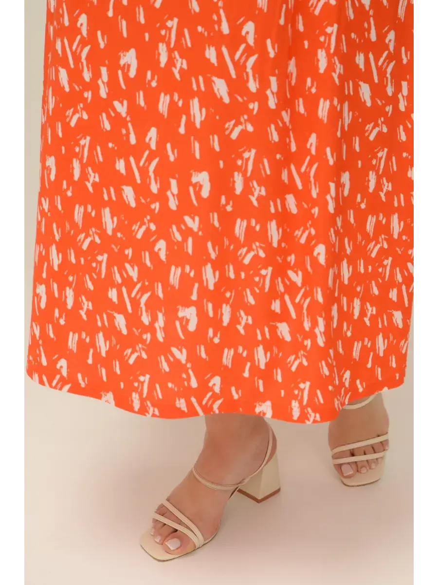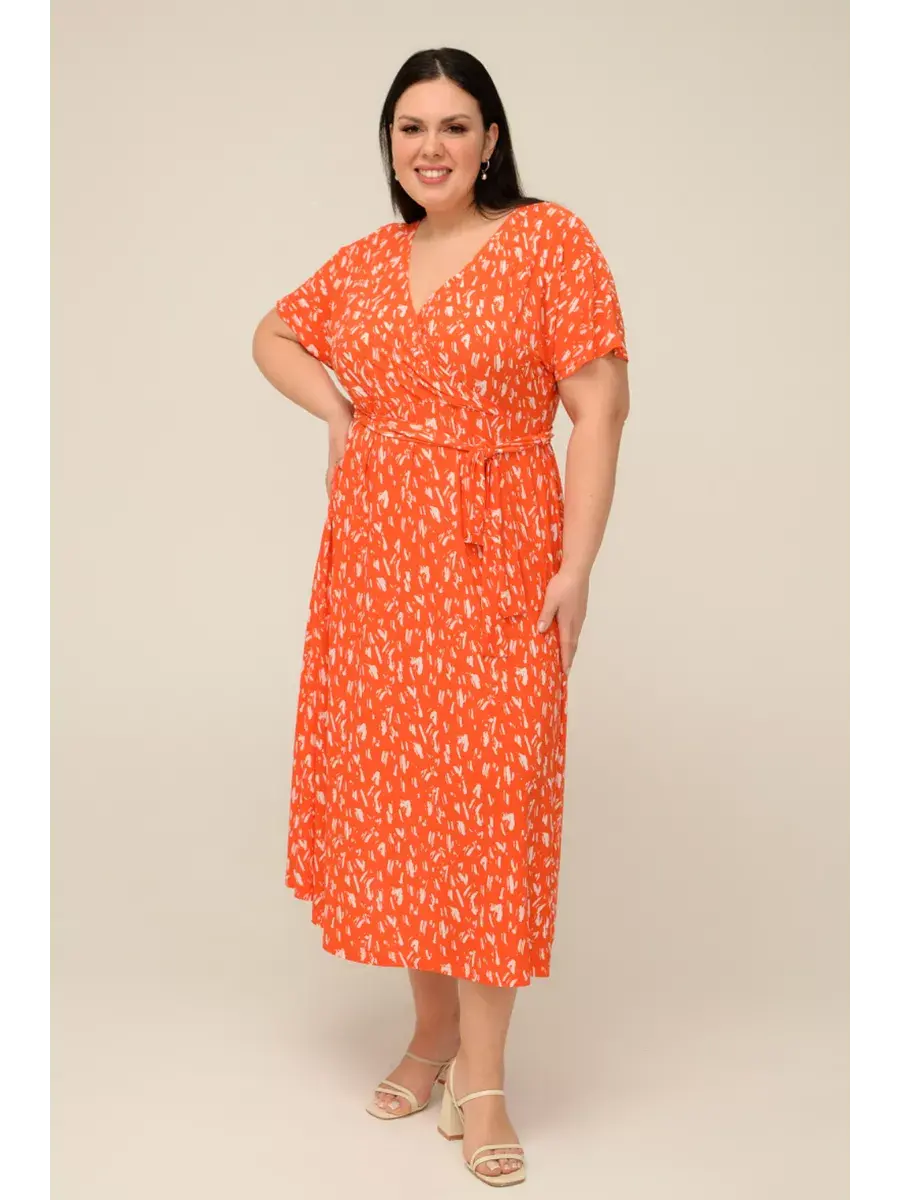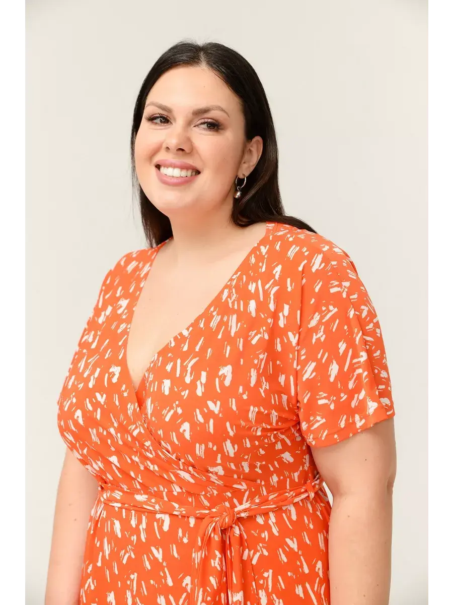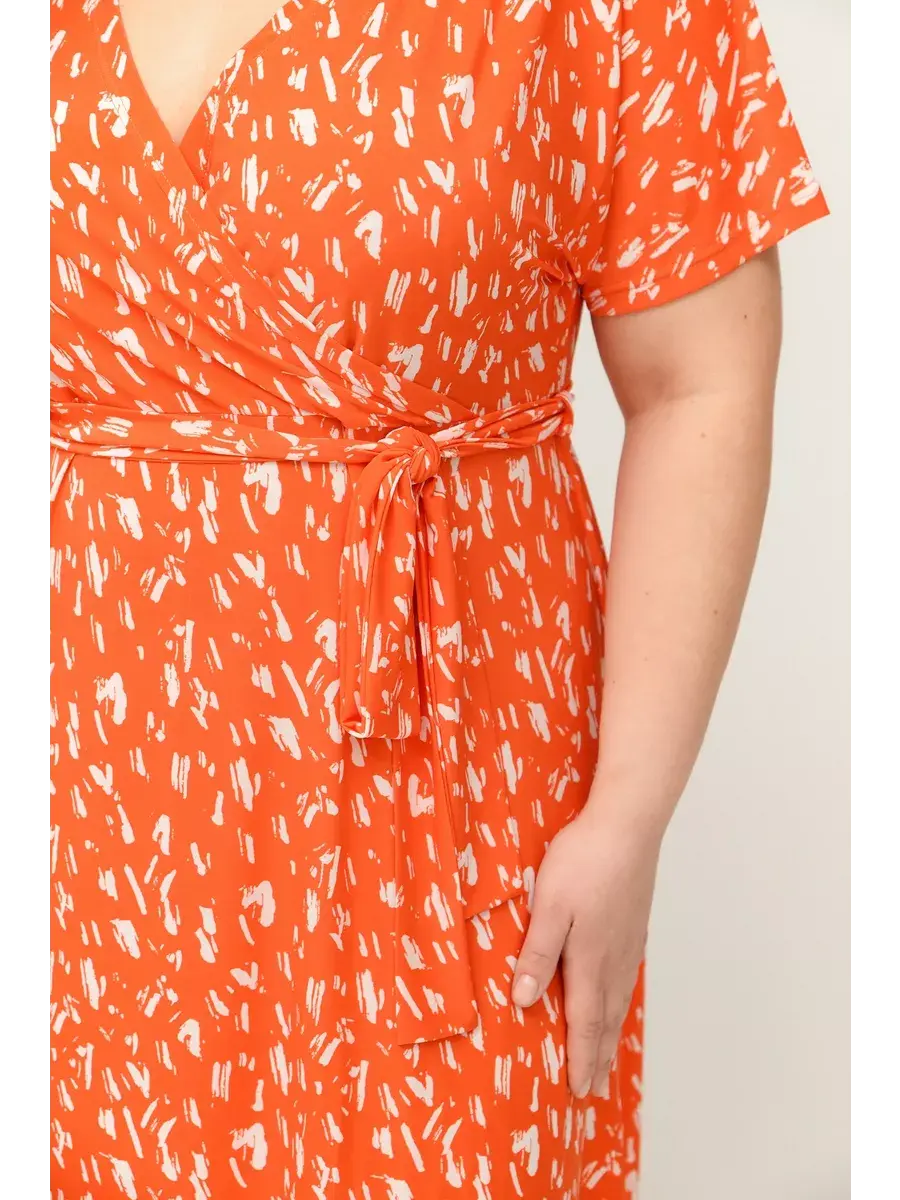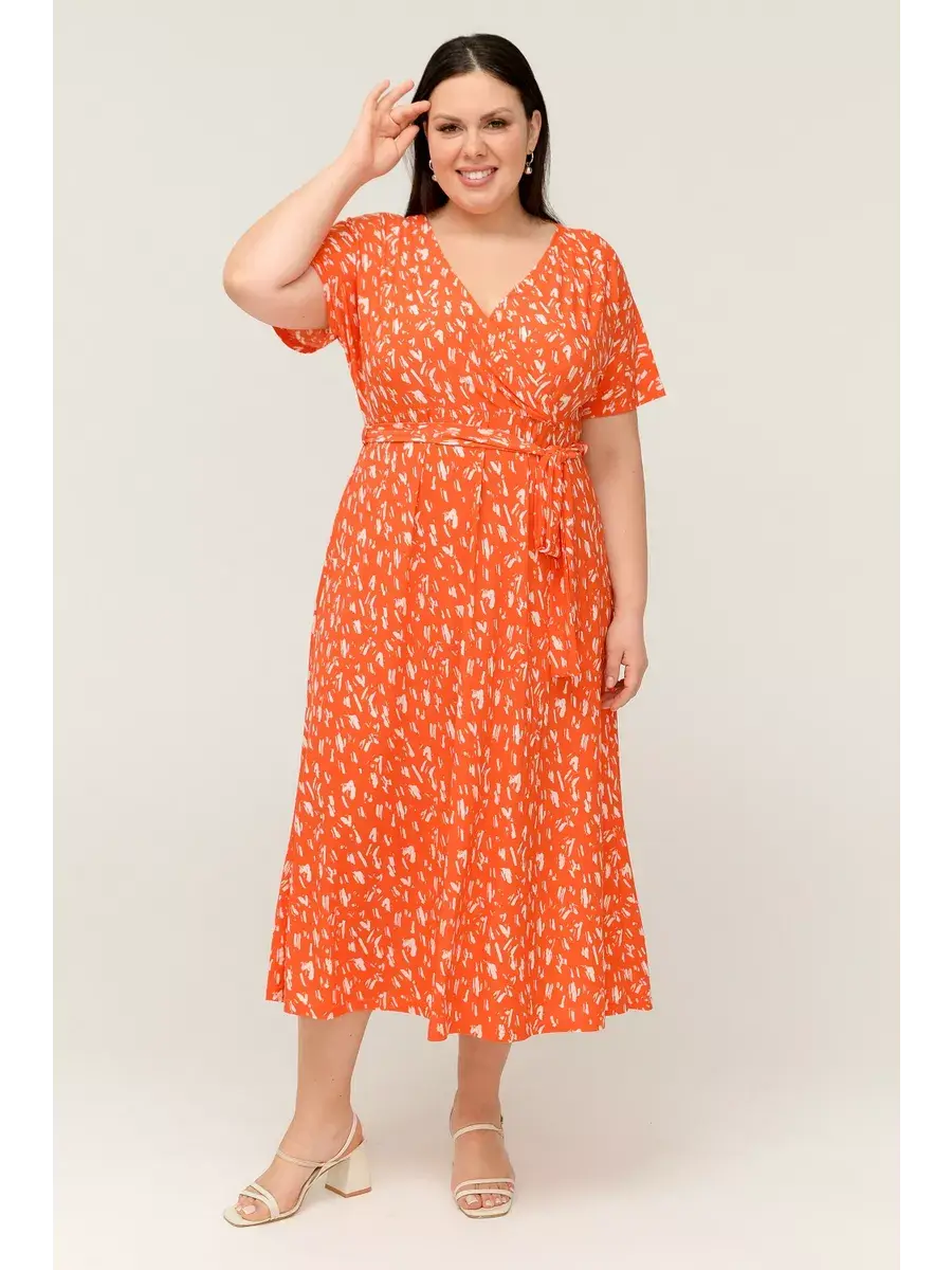 Женское платье больших размеров от бренда OLSI выполнено из трикотажного полотна масло - ткань струится, не мнется, холодит кожу в жаркую погоду. Платье летнее длиной миди. Платье женское больших размеров имеет приталенный фасон с расклешенной юбкой, талия слегка завышена. Горловина платья представляет собой V-образное декольте (конверт). Рукава цельнокроенные. Длина платья миди.