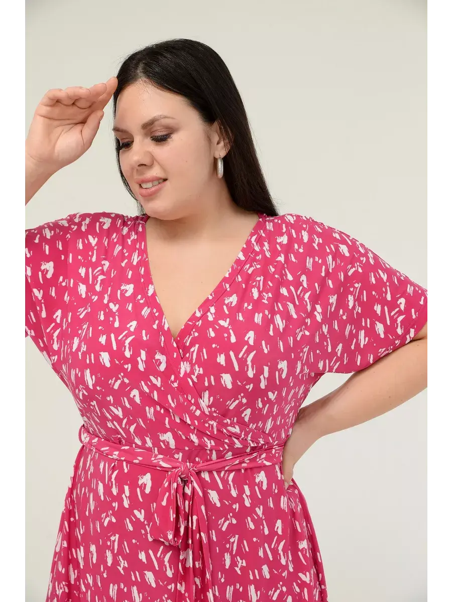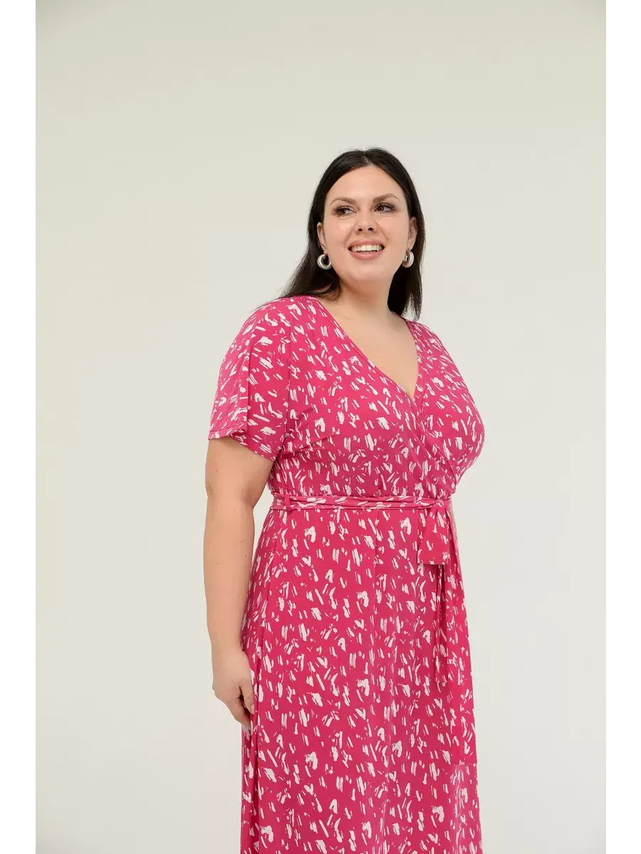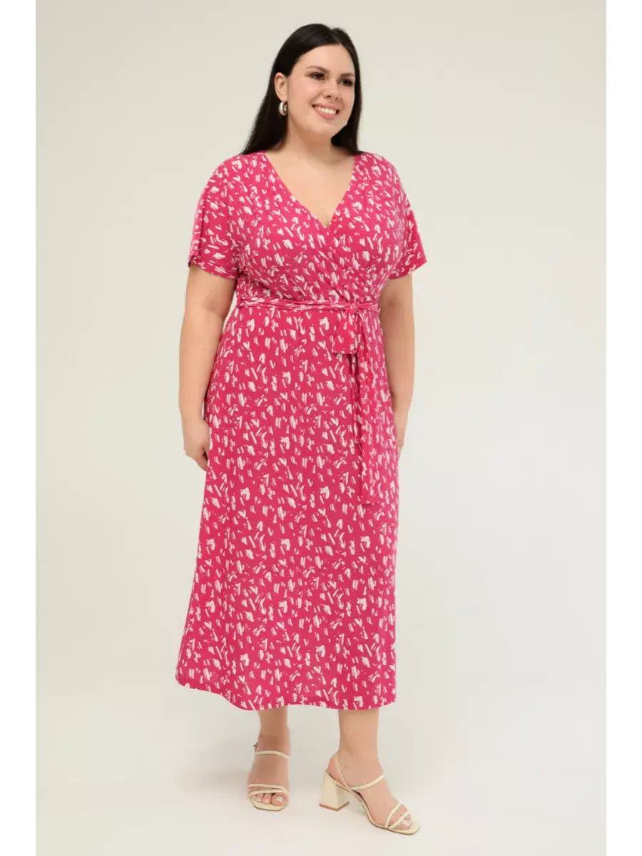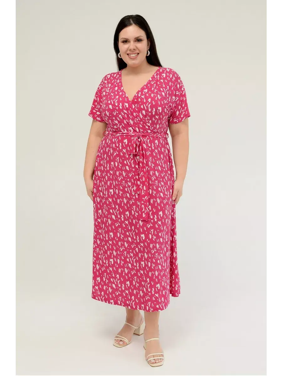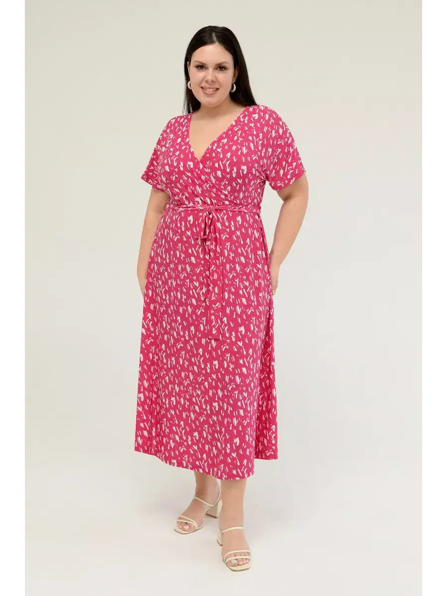 Женское платье больших размеров от бренда OLSI выполнено из трикотажного полотна масло - ткань струится, не мнется, холодит кожу в жаркую погоду. Платье летнее длиной миди. Платье женское больших размеров имеет приталенный фасон с расклешенной юбкой, талия слегка завышена. Горловина платья представляет собой V-образное декольте (конверт). Рукава цельнокроенные. Длина платья миди.