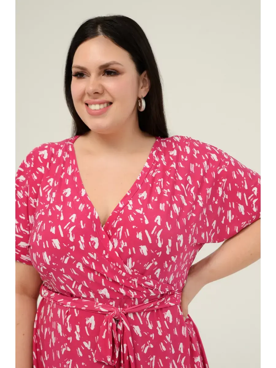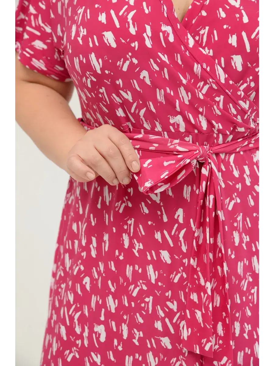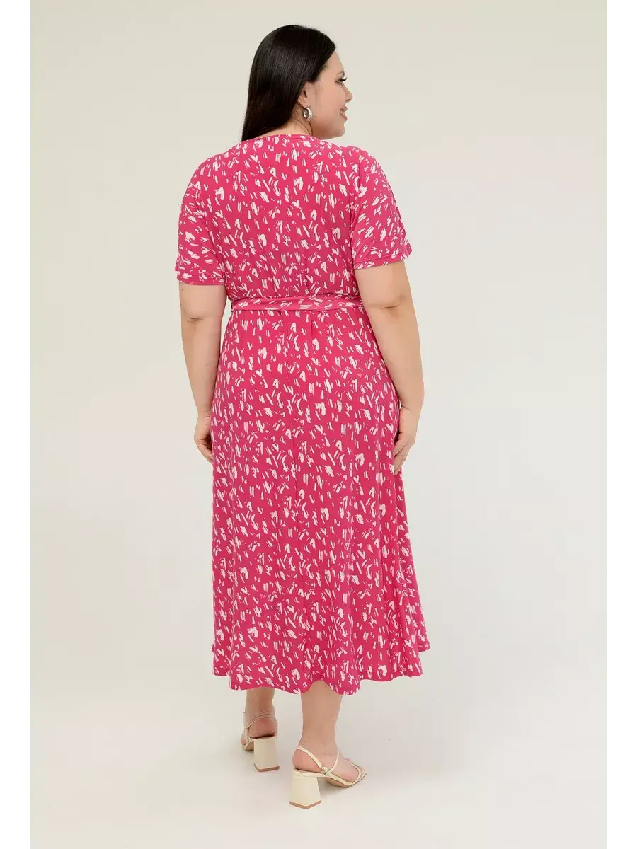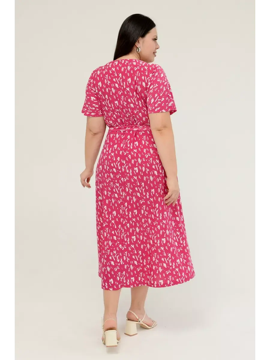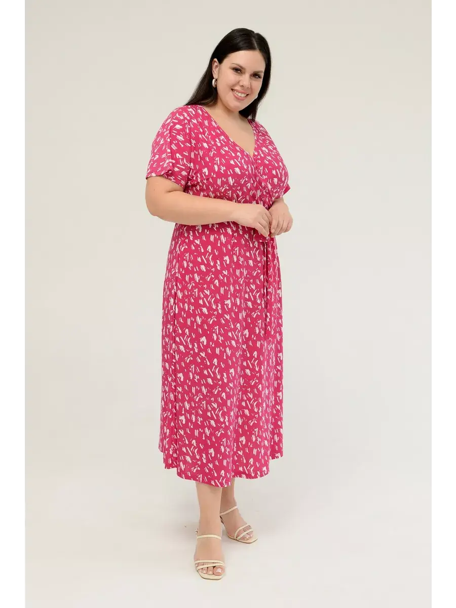 Женское платье больших размеров от бренда OLSI выполнено из трикотажного полотна масло - ткань струится, не мнется, холодит кожу в жаркую погоду. Платье летнее длиной миди. Платье женское больших размеров имеет приталенный фасон с расклешенной юбкой, талия слегка завышена. Горловина платья представляет собой V-образное декольте (конверт). Рукава цельнокроенные. Длина платья миди.