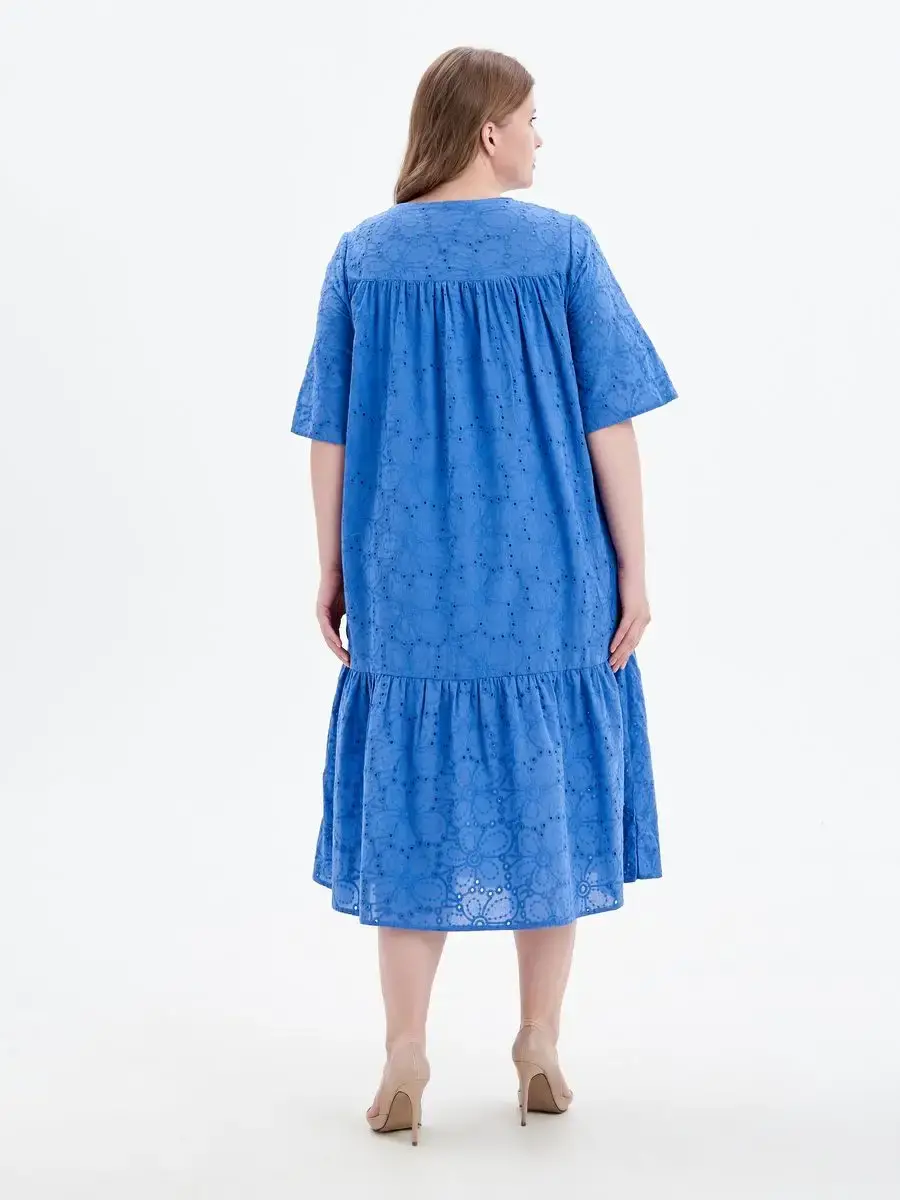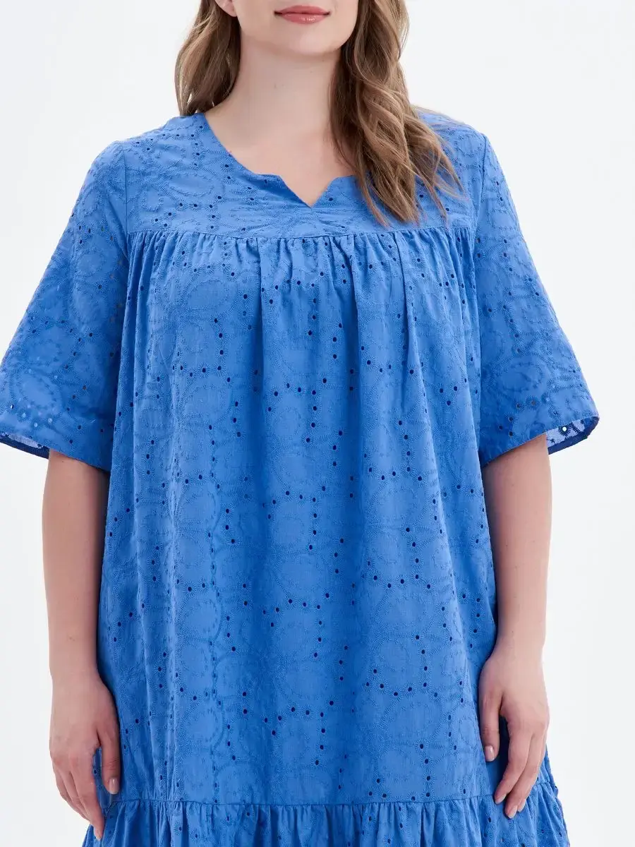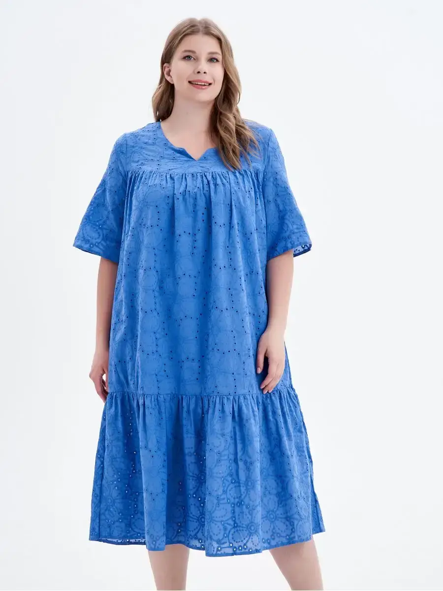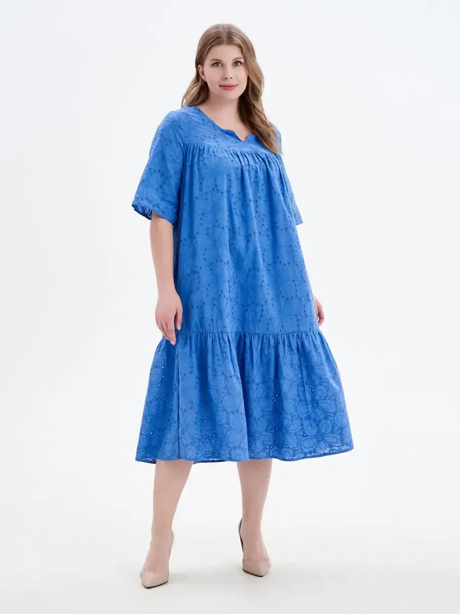 Женское летнее платье больших размеров бренда OLSI, выполнено из натурального материала 100% хлопок. Легкое, яркое и воздушное платье, хорошо дышит в жаркую погоду. Платье свободного силуэта в стиле бохо, расширено к низу, длиной ниже уровня колен. Модель платья с фигурной горловиной, кокетки спереди и сзади. Кружевное длинное платье синего цвета идеально сидит по женской фигуре, подчеркивает достоинства и скрывает недостатки. Элегантные вечерние красивые платья в цветочных и нежных оттенках идеально подходят для повседневного делового стиля для офиса, вечерней моды для работы или праздников, вечеринок, свиданий, свадеб, дней рождения, фотосессий, юбилеев. торжеств, корпоративных мероприятий, а также для беременных женщин. Модные макси подходят для девушек любой фигуры, стройных и полных, а также для любого возраста. Данную модель можно носить как летом, так и весной. Идеальное коктейльное платье с юбкой солнце в пол непрозрачном придаст кокетливый и игривый оттенок повседневными праздничным образам. Ткань дышащая, высокого качества, не теряет яркости и не деформируется после стирки. Это красивое платье из ткани с вышивкой Ришелье можно одеть на выпускной. Женские платья с ришелье, одежда женская свободного кроя. Платье летние хорошо сидит на любой фигуре. Рост модели 173 см.