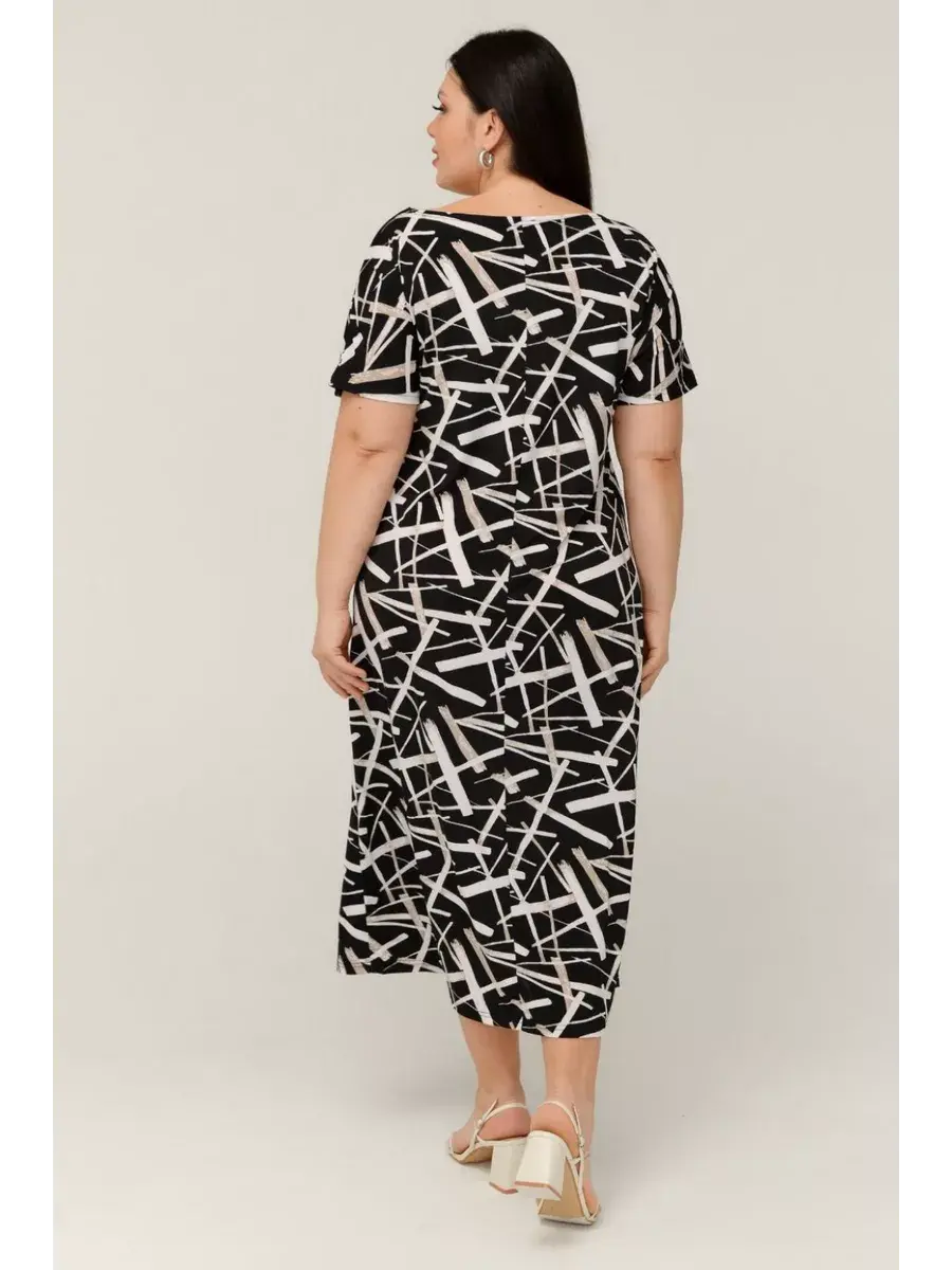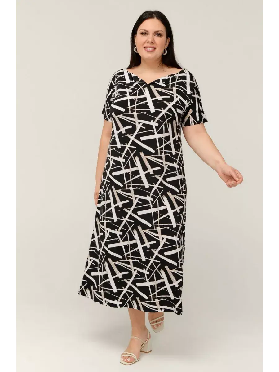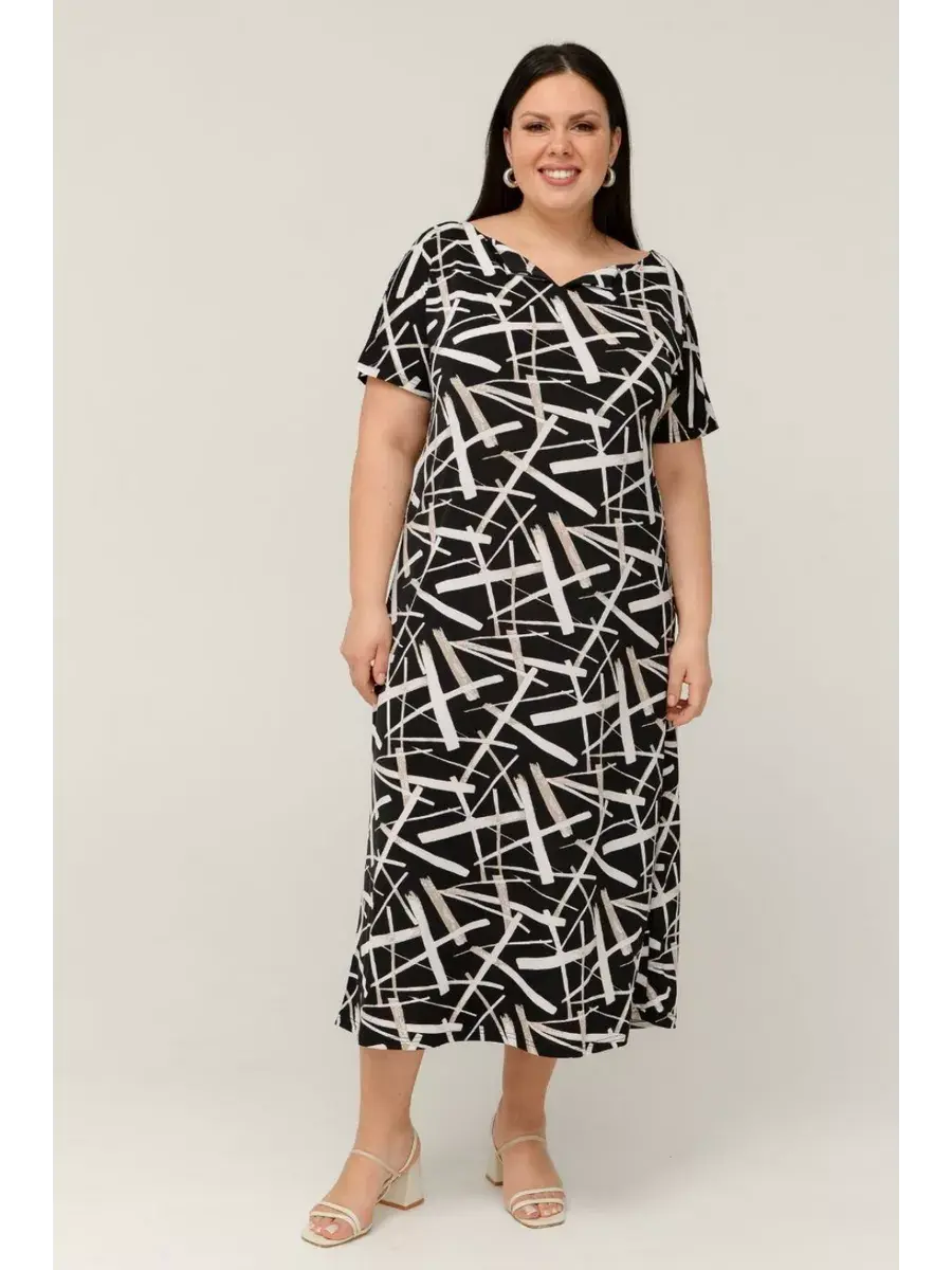 Женское платье больших размеров от бренда OLSI выполнено из трикотажного полотна масло - ткань струится, не мнется, холодит кожу в жаркую погоду. Платье летнее длиной миди. Женское платье больших размеров имеет фасон длинной свободной футболки, но с цельнокроенным рукавом. Горловина с размером спереди, имитирует отложной плосколежачий воротник, цельнокроеный с полочкой. Такой дизайнерский прием отсылает к стилю ар-деко. Длина по спинке/длина рукава/ширина по груди/ширина низ соответственно: