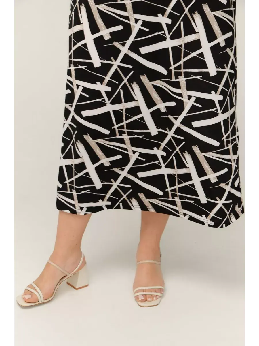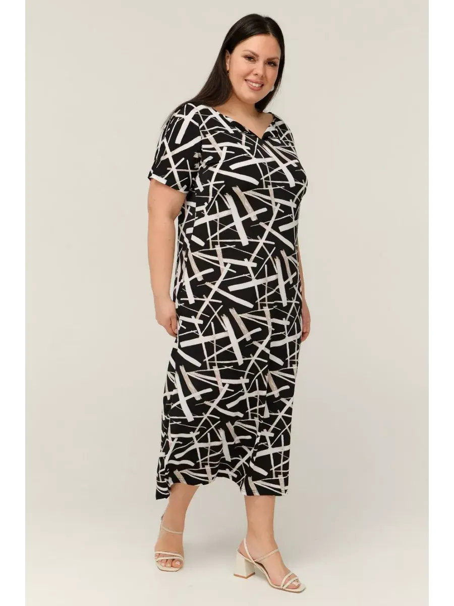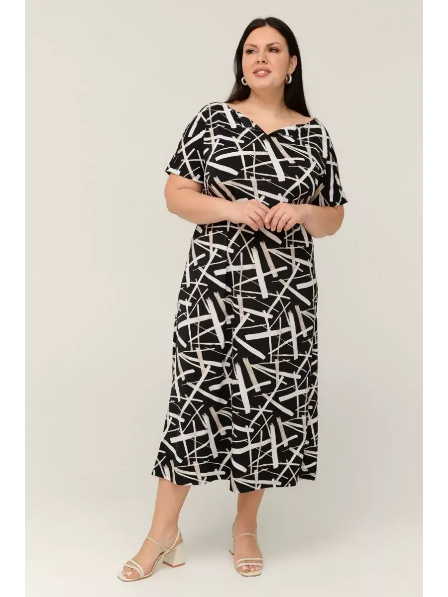 Женское платье больших размеров от бренда OLSI выполнено из трикотажного полотна масло - ткань струится, не мнется, холодит кожу в жаркую погоду. Платье летнее длиной миди. Женское платье больших размеров имеет фасон длинной свободной футболки, но с цельнокроенным рукавом. Горловина с размером спереди, имитирует отложной плосколежачий воротник, цельнокроеный с полочкой. Такой дизайнерский прием отсылает к стилю ар-деко. Длина по спинке/длина рукава/ширина по груди/ширина низ соответственно: