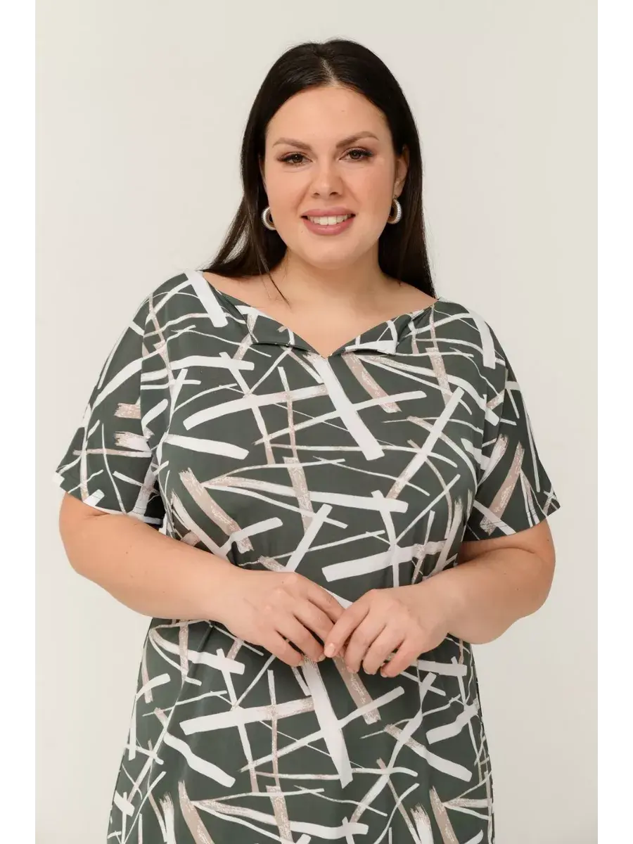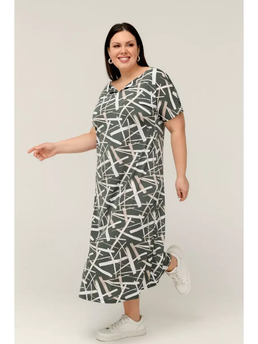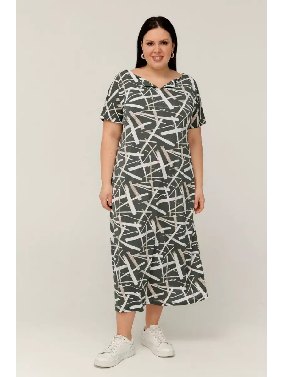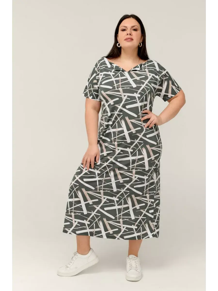Женское платье больших размеров от бренда OLSI выполнено из трикотажного полотна масло - ткань струится, не мнется, холодит кожу в жаркую погоду. Платье летнее длиной миди. Женское платье больших размеров имеет фасон длинной свободной футболки, но с цельнокроенным рукавом. Горловина с размером спереди, имитирует отложной плосколежачий воротник, цельнокроеный с полочкой. Такой дизайнерский прием отсылает к стилю ар-деко. Длина по спинке/длина рукава/ширина по груди/ширина низ соответственно: