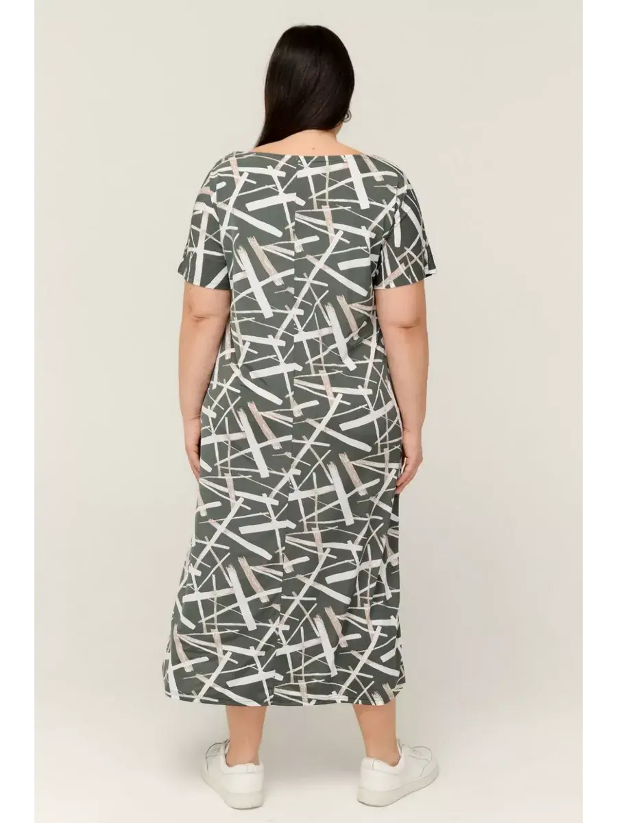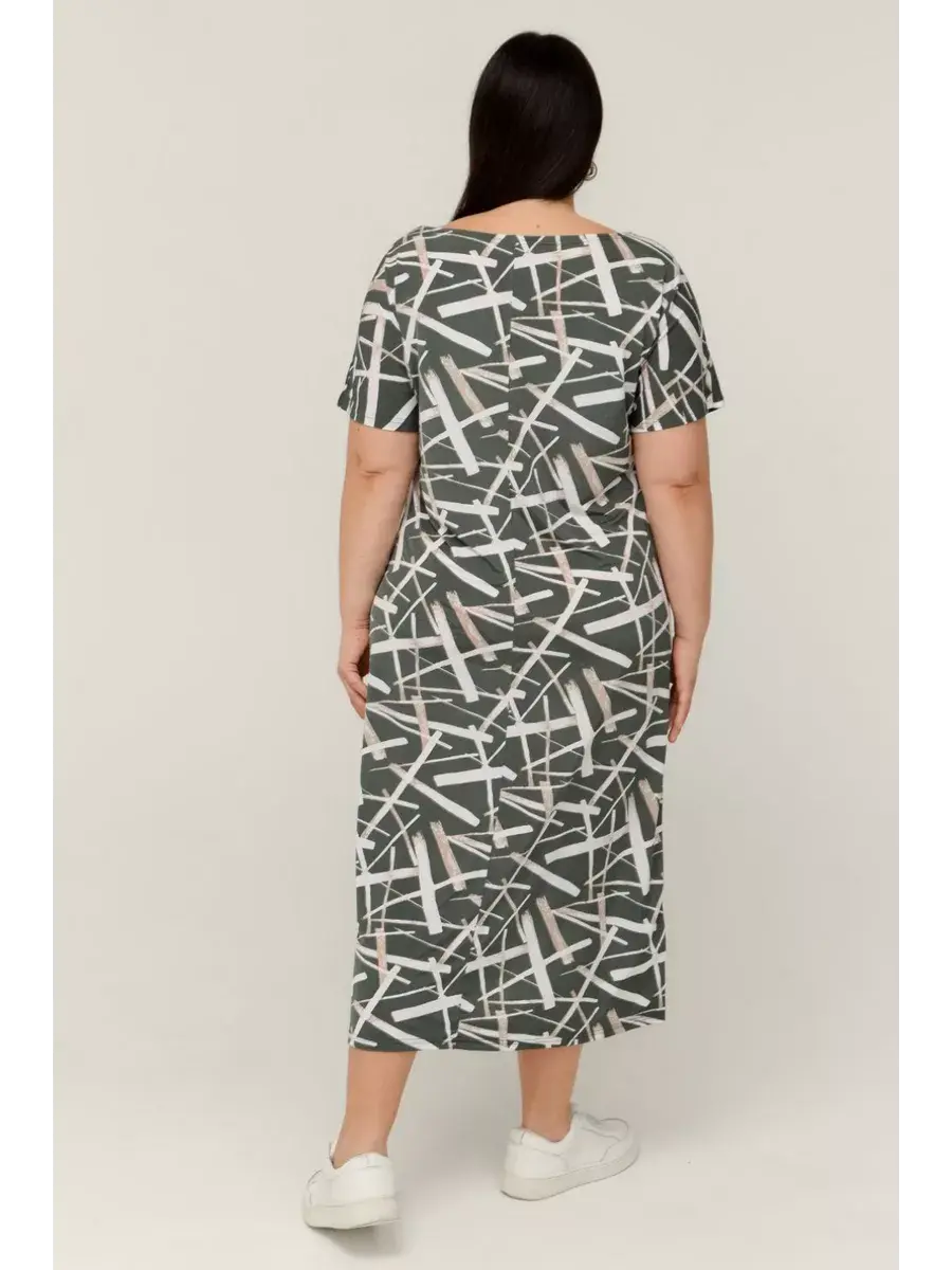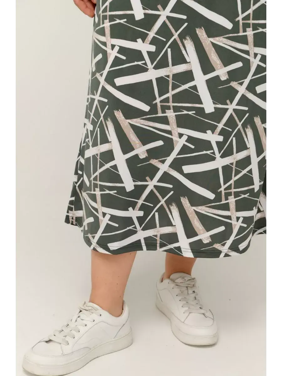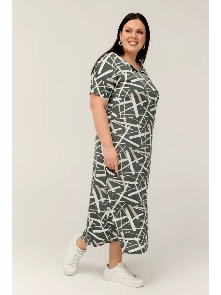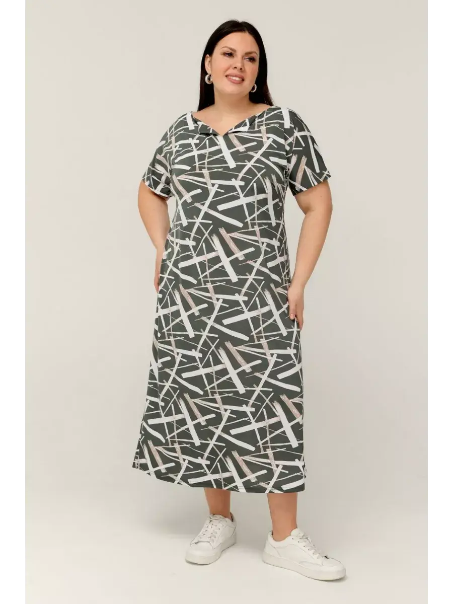Женское платье больших размеров от бренда OLSI выполнено из трикотажного полотна масло - ткань струится, не мнется, холодит кожу в жаркую погоду. Платье летнее длиной миди. Женское платье больших размеров имеет фасон длинной свободной футболки, но с цельнокроенным рукавом. Горловина с размером спереди, имитирует отложной плосколежачий воротник, цельнокроеный с полочкой. Такой дизайнерский прием отсылает к стилю ар-деко. Длина по спинке/длина рукава/ширина по груди/ширина низ соответственно: