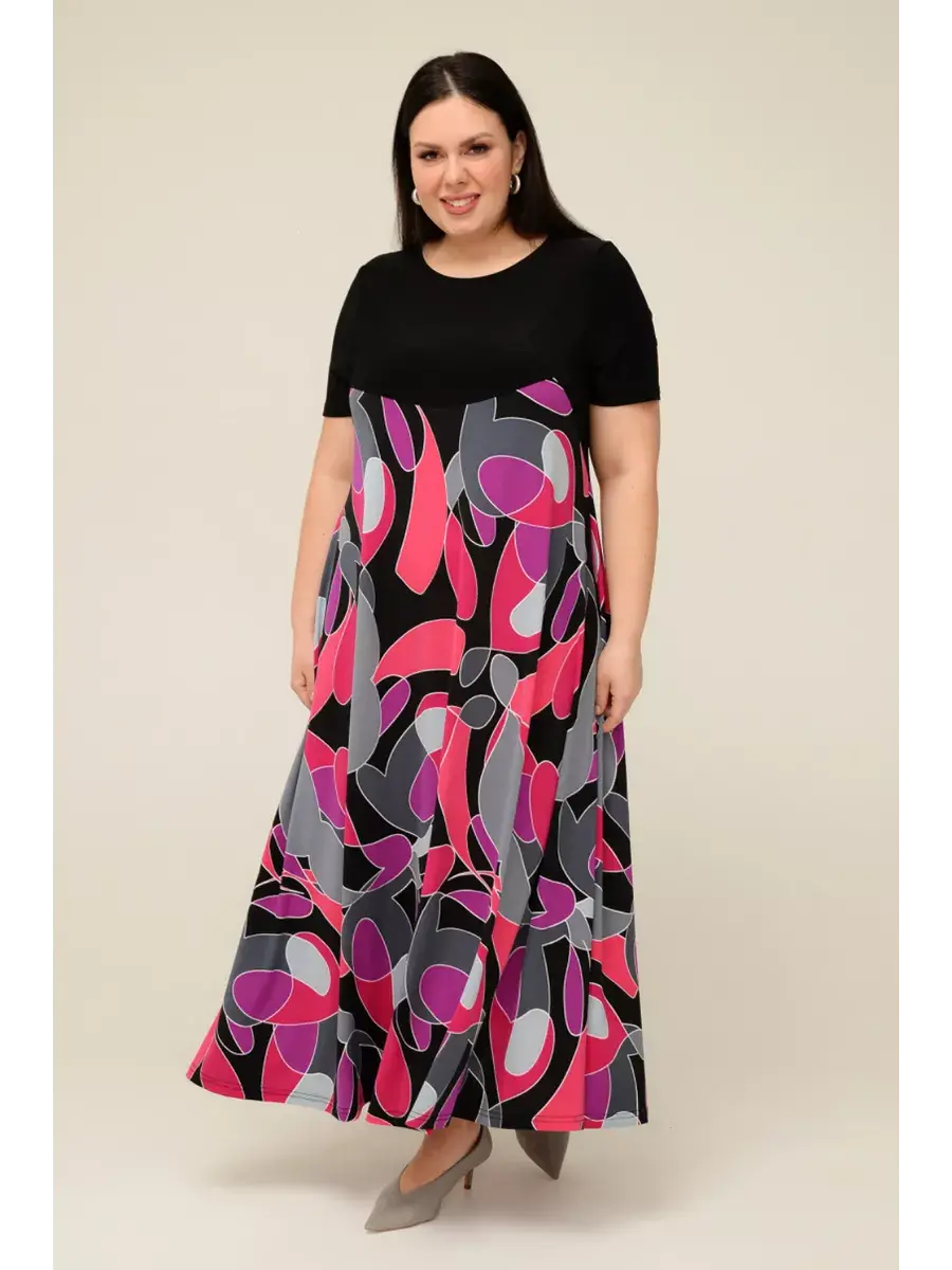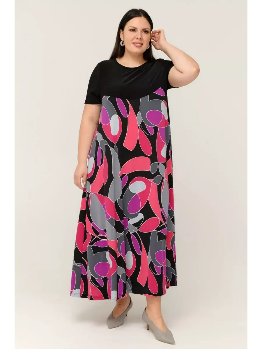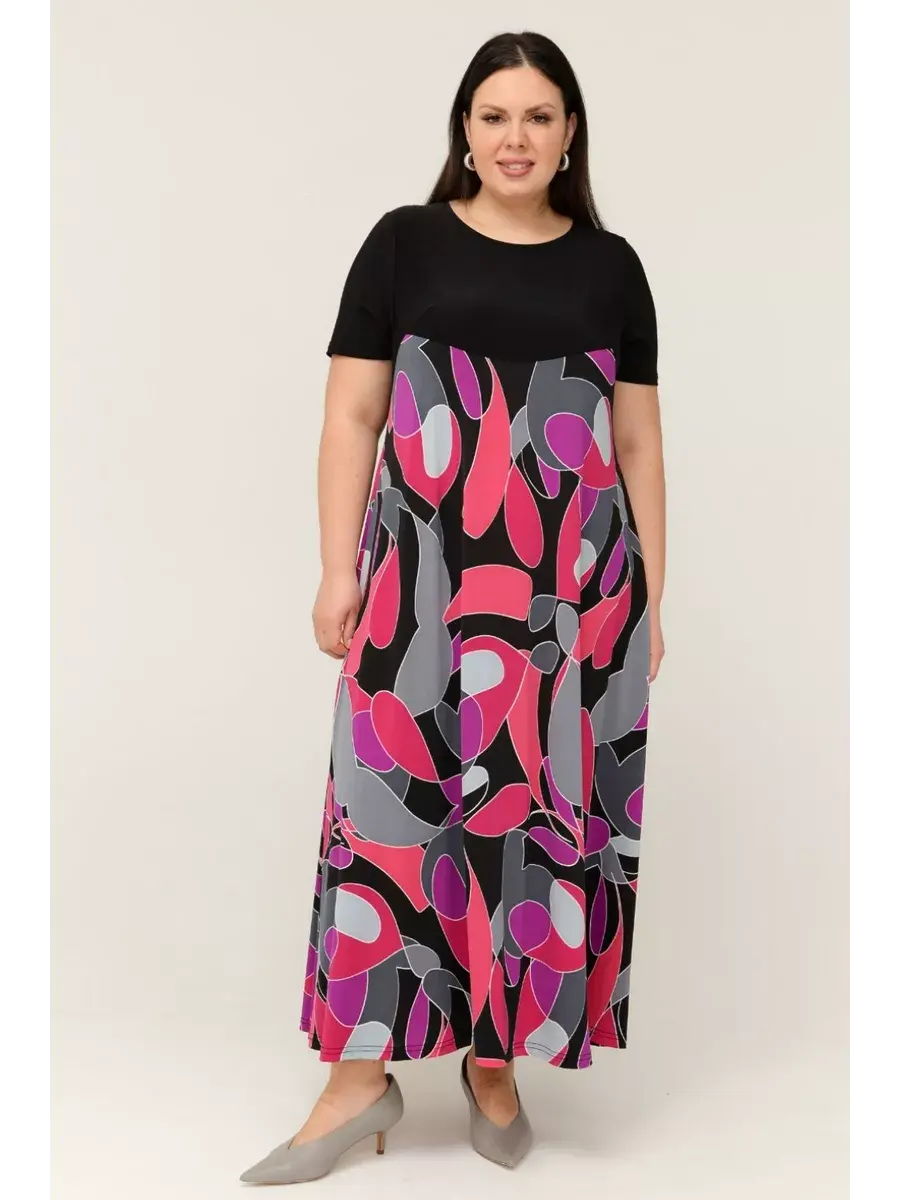 Женское платье больших размеров от бренда OLSI выполнено из трикотажного полотна масло - ткань струится, не мнется, холодит кожу в жаркую погоду. Яркое длинное женское платье на теплую и жаркую погоду позволит выделиться из толпы. Платье летнее длиной макси. Платье скрывает недостатки и подчеркивает преимущества силуэта. Такой эстетичный наряд красиво смотрится на любой фигуре, подойдет для модниц любого возраста. Летнее платье свободного кроя идеально подходит для самых разных случаев. Также его удобно брать с собой в отпуск, поскольку занимает мало места в багаже. Платье женское больших размеров имеет полуприлегающий фасон с расклешенной юбкой, талия слегка завышена. Рукава, полочки спереди и сзади выполнены их однотонного трикотажа, представляя собой контрастный компаньон. Рукава втачные.